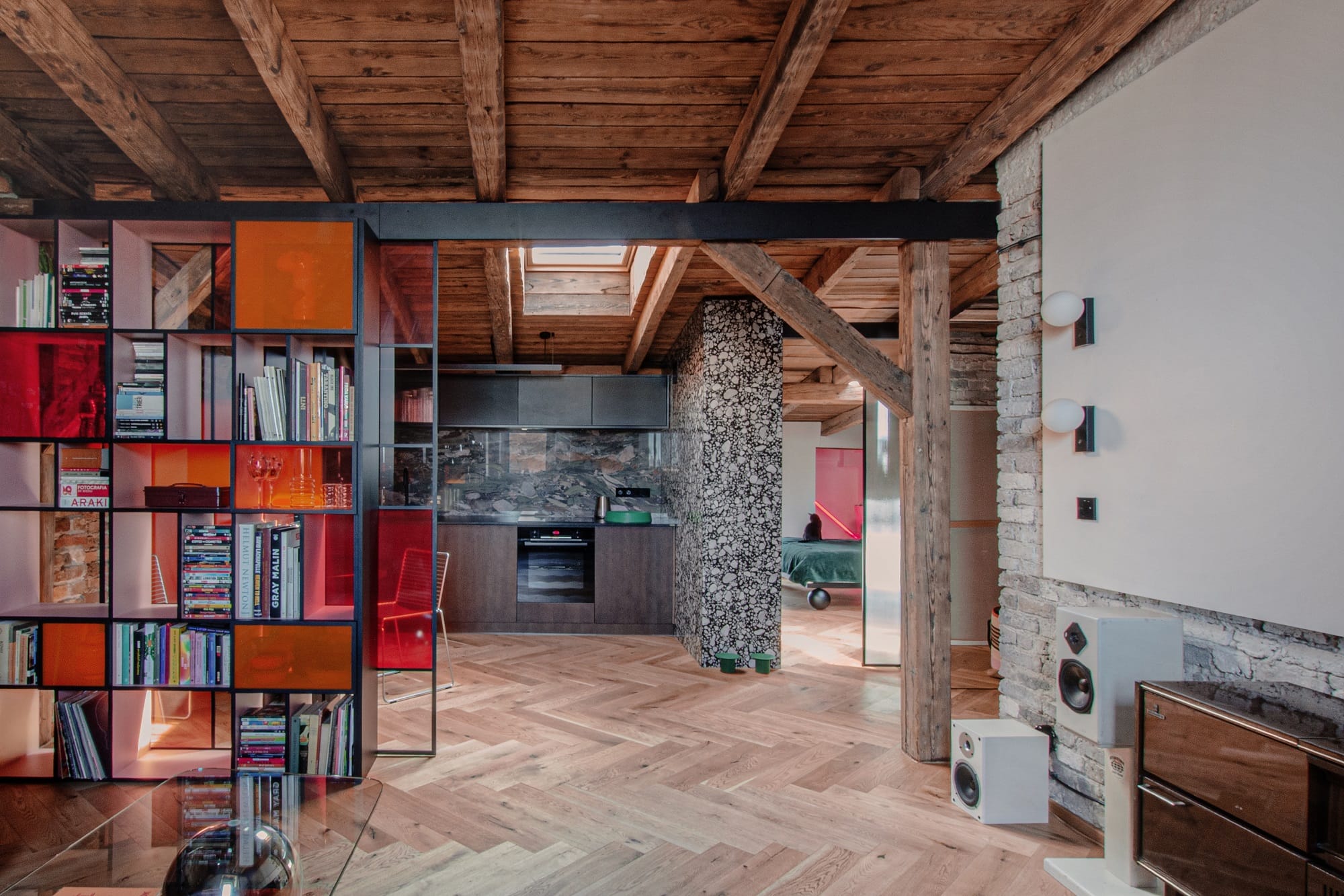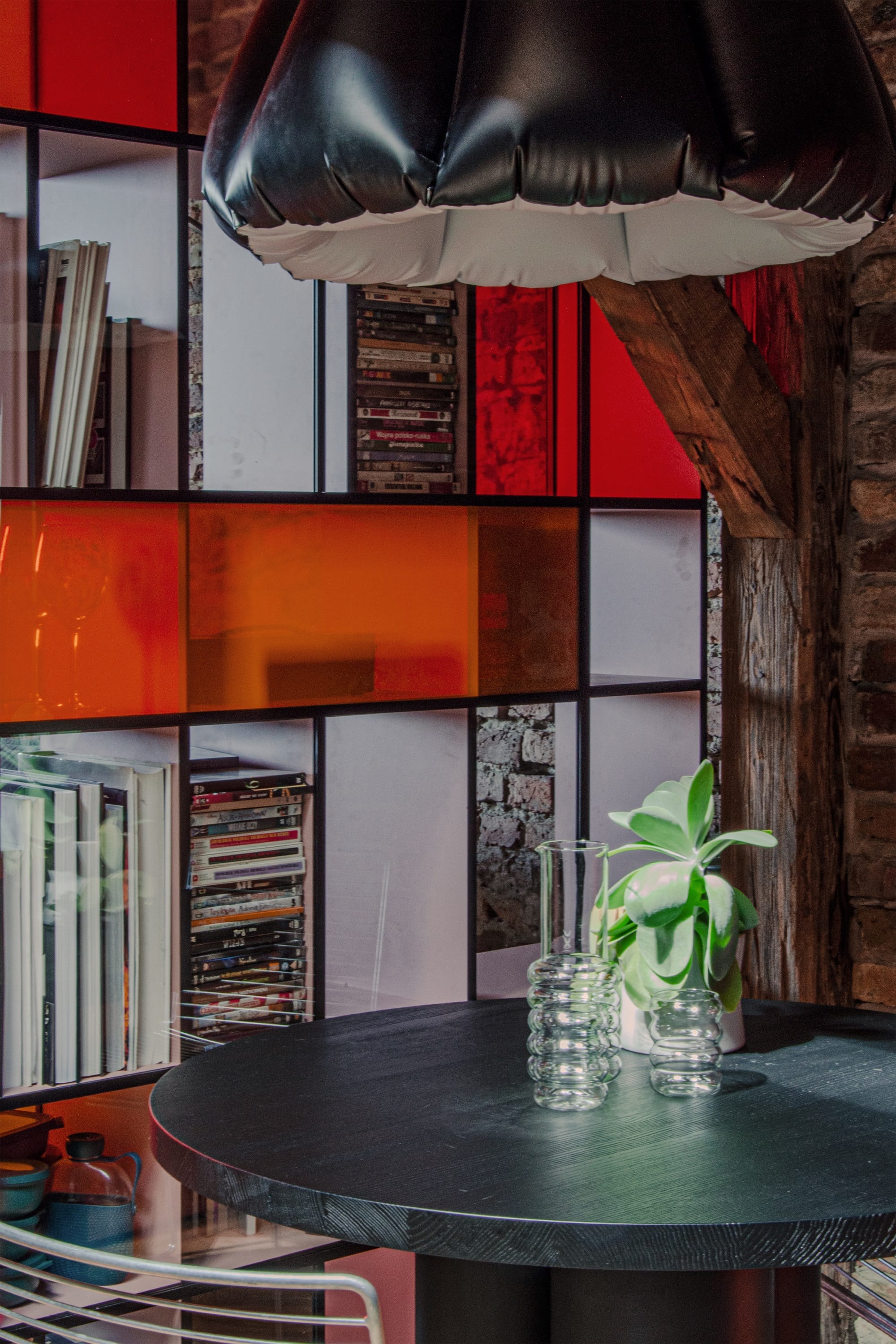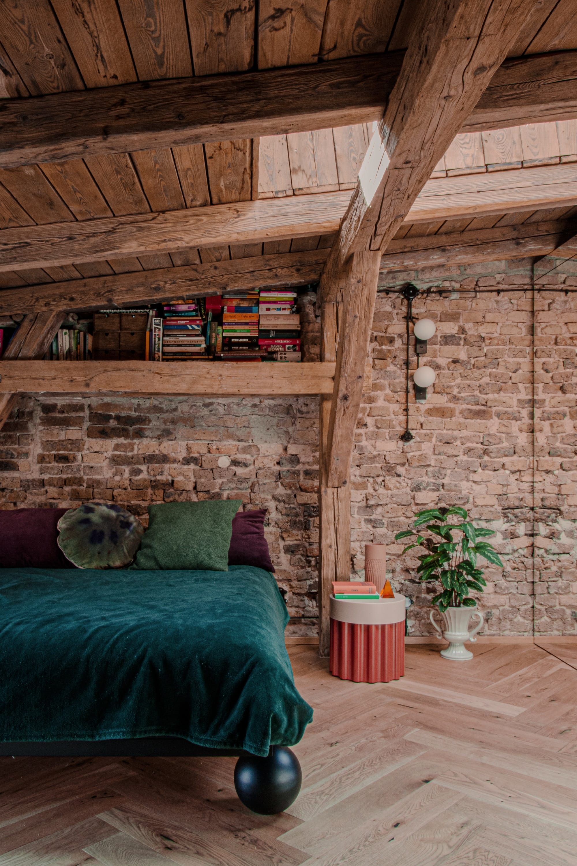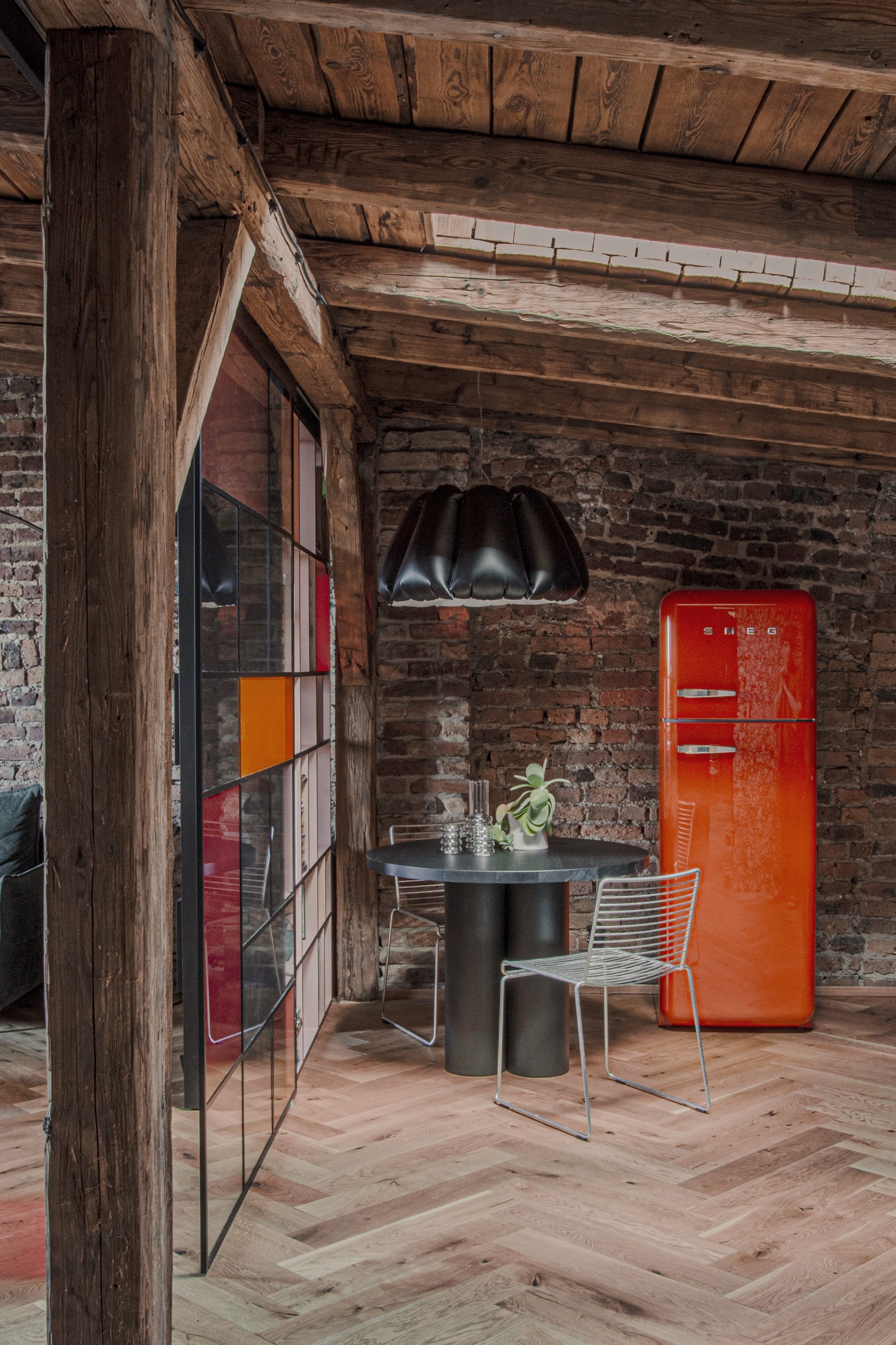Jednym z kluczowych założeń było wyeksponowanie naturalnych materiałów. Grzegorz Layer zdecydował się zachować oryginalną drewnianą podłogę, a także wyeksponować belki i ceglane ściany. Widoczne elementy konstrukcji i instalacji budują surowy charakter wnętrza, który równoważą bardziej współczesne akcenty nowej zabudowy. Na ograniczonym metrażu nie ma jednak miejsca na zbędne gesty, toteż kolory nowej zabudowy pełnią nie tylko funkcję dekoracyjną, ale także porządkują układ i akcentują poszczególne strefy.