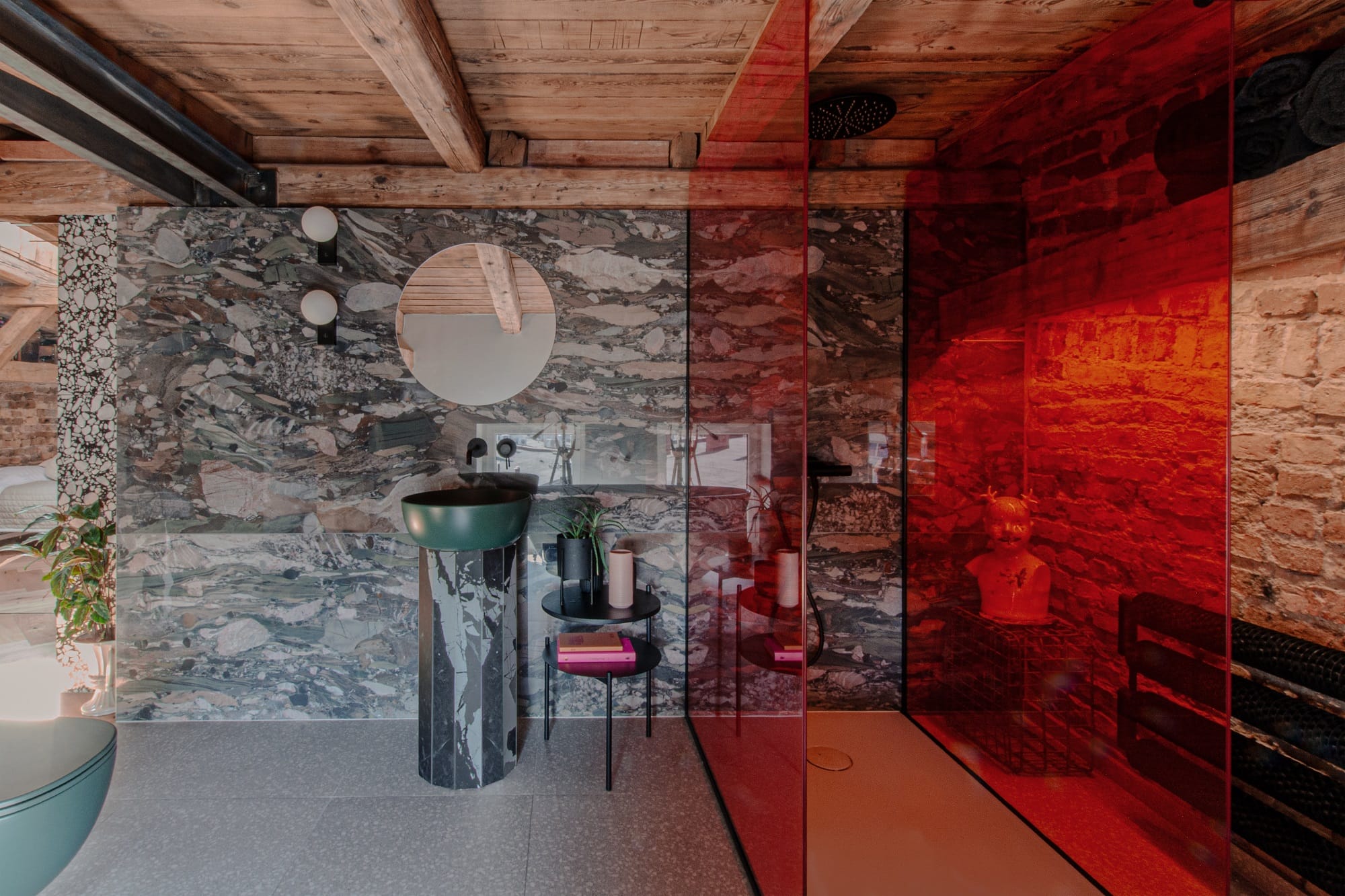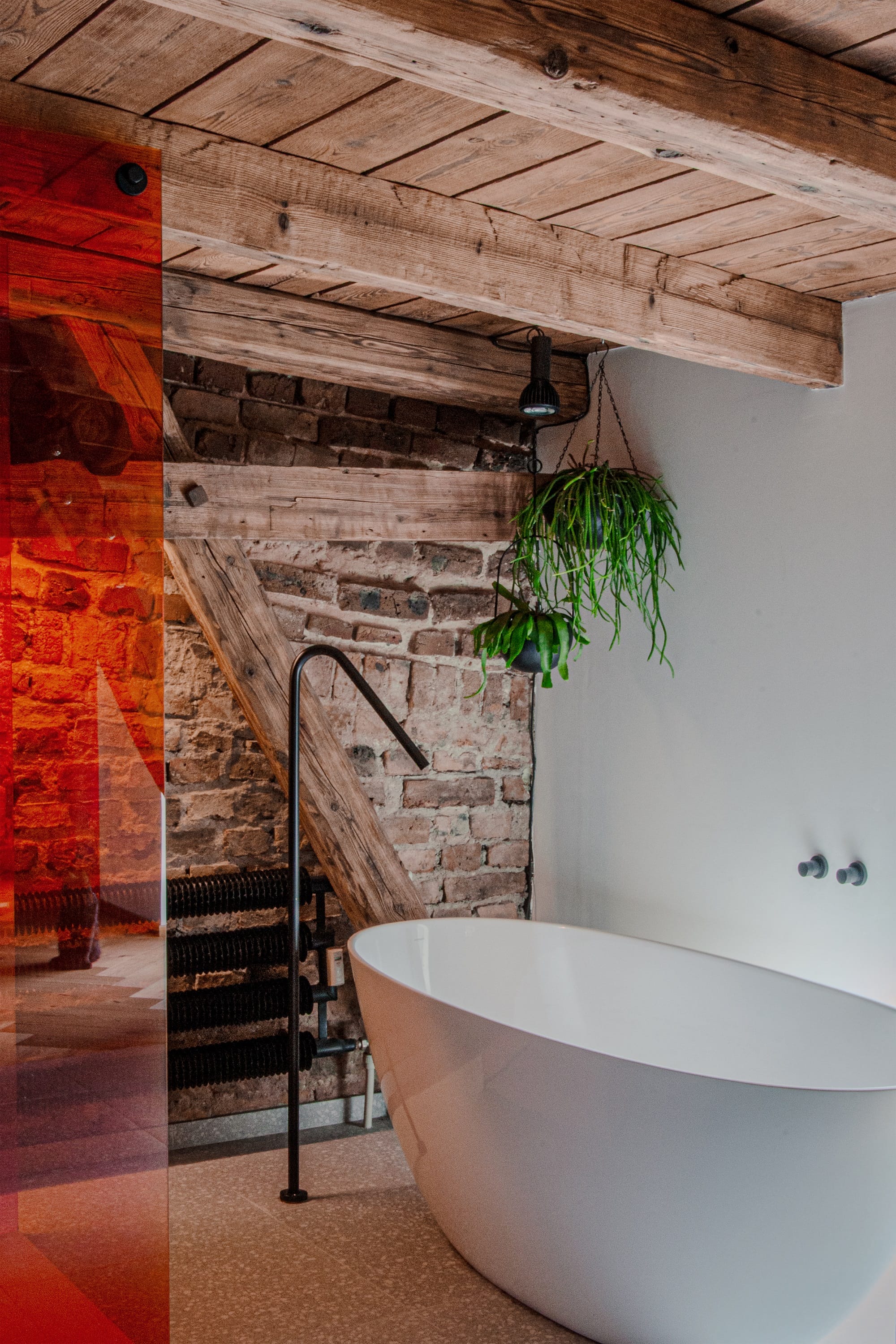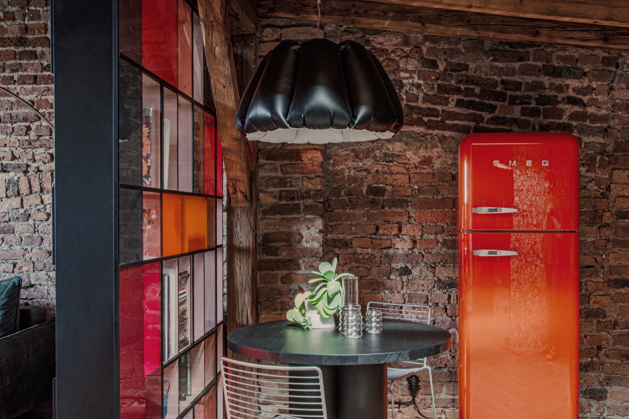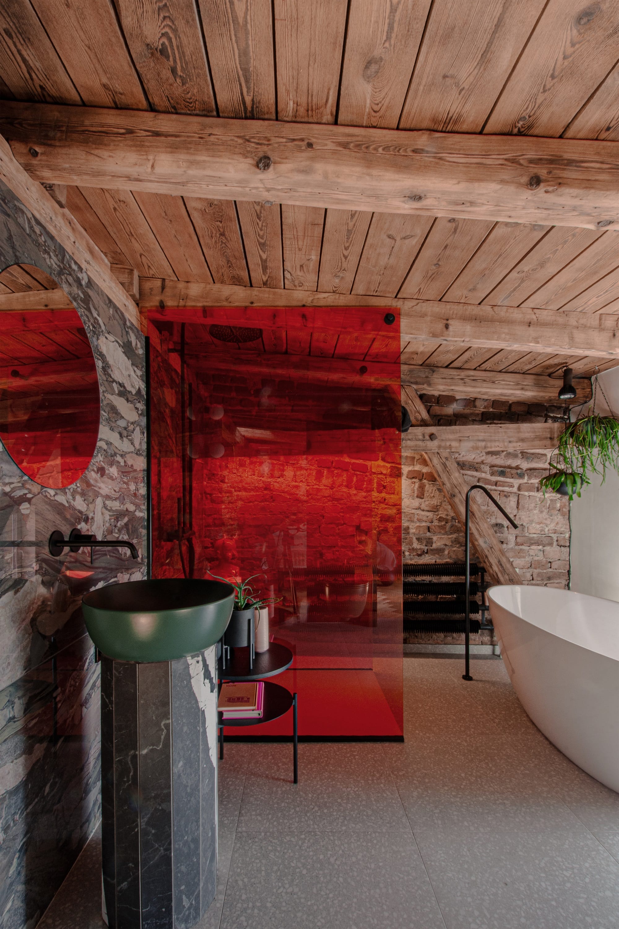 Jednym z kluczowych założeń było wyeksponowanie naturalnych materiałów. Grzegorz Layer zdecydował się zachować oryginalną drewnianą podłogę, a także wyeksponować belki i ceglane ściany. Widoczne elementy konstrukcji i instalacji budują surowy charakter wnętrza, który równoważą bardziej współczesne akcenty nowej zabudowy. Na ograniczonym metrażu nie ma jednak miejsca na zbędne gesty, toteż kolory nowej zabudowy pełnią nie tylko funkcję dekoracyjną, ale także porządkują układ i akcentują poszczególne strefy.