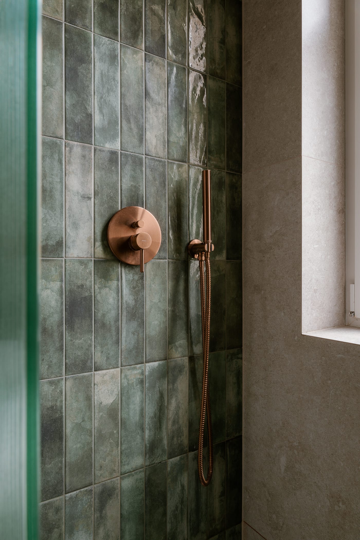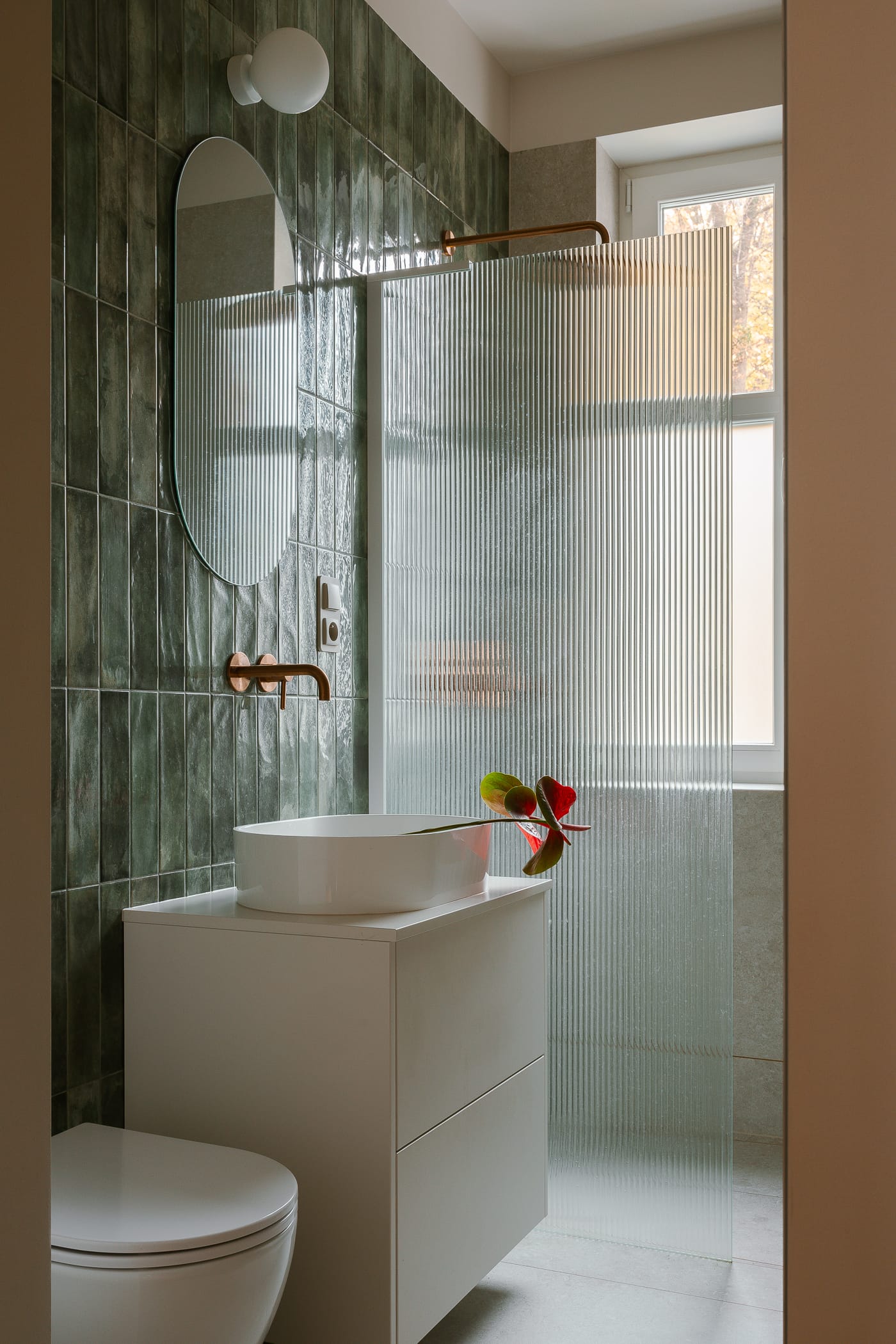 Ten sam kolor pojawia się także na fragmentach ścian, w łagodnych łukach przejść pomiędzy pokojami oraz w niewielkiej ekspozycji salonowych bibelotów. Znajdziemy go również w łazience, w bardziej zgaszonej, relaksującej odsłonie, która dobrze komponuje się z bateriami ze szczotkowanej miedzi.