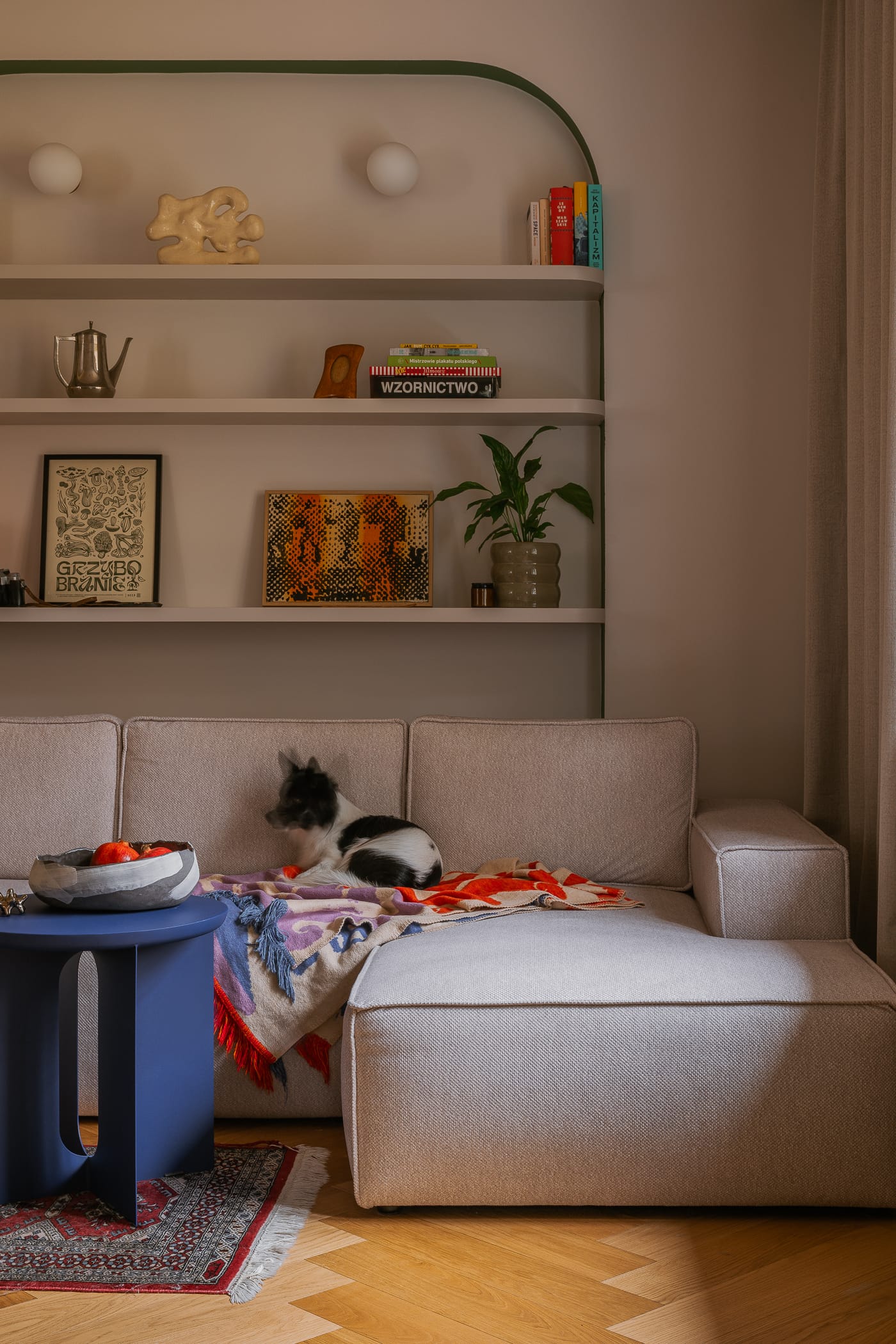 Uwagę przyciągają również lampy zaprojektowane przez samego właściciela mieszkania. Przestrzeń uzupełniają prace lokalnej artystki Aleksandry Went oraz dodatki autorstwa Oskara Zięty.