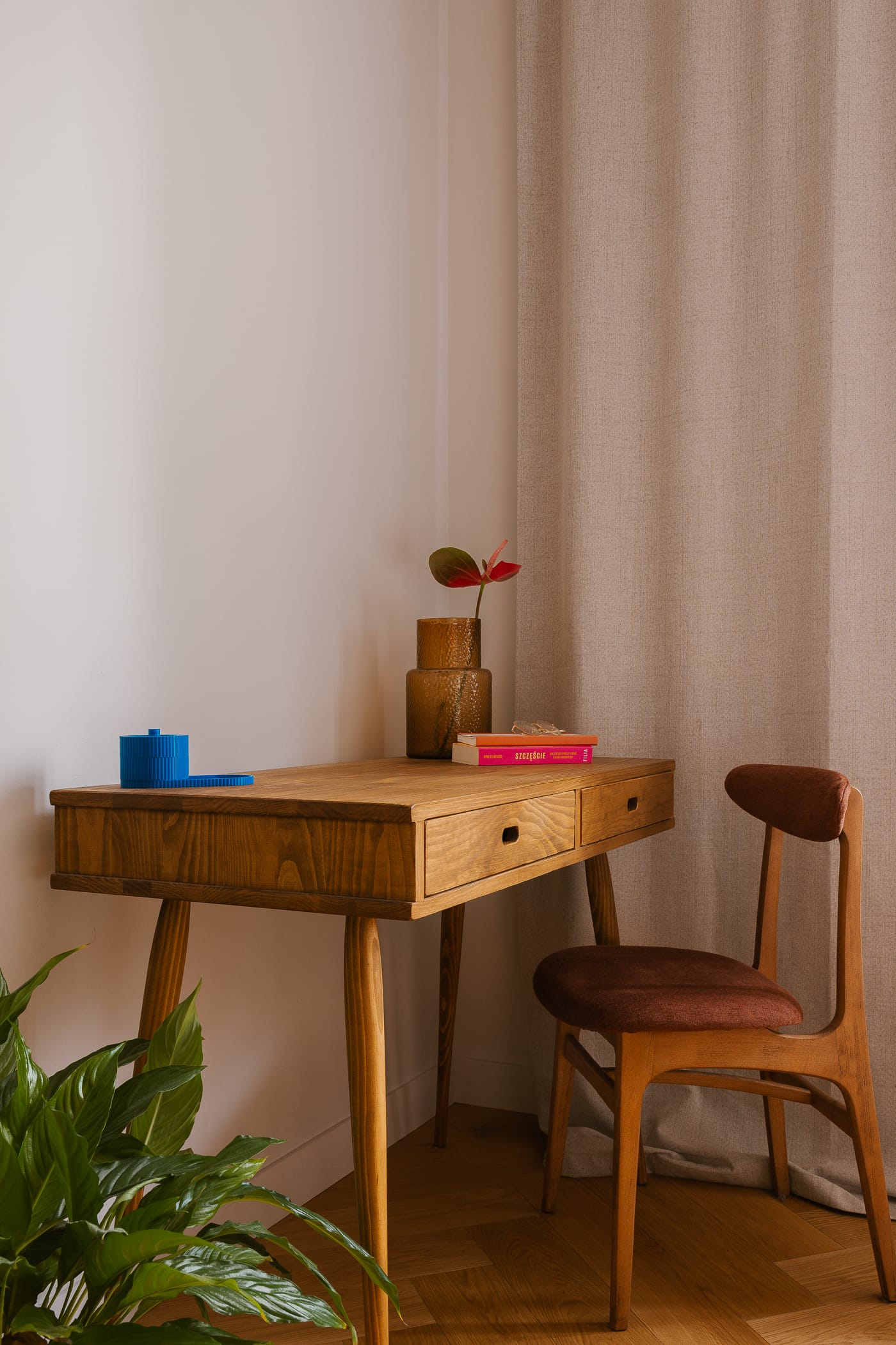 W przylegającym do jadalni salonie strefę wypoczynkową wyznacza beżowa kanapa oraz stolik z lakierowanego żelaza w intensywnym kobaltowym odcieniu, który ożywia stonowaną kompozycję. Akcent kobaltu znalazł się również w kameralnym gabinecie, natomiast w sypialni, jako kontrapunkt dla zieleni, architekt Jacek Gonera sięgnął po bordowe kinkiety i dodatki.
