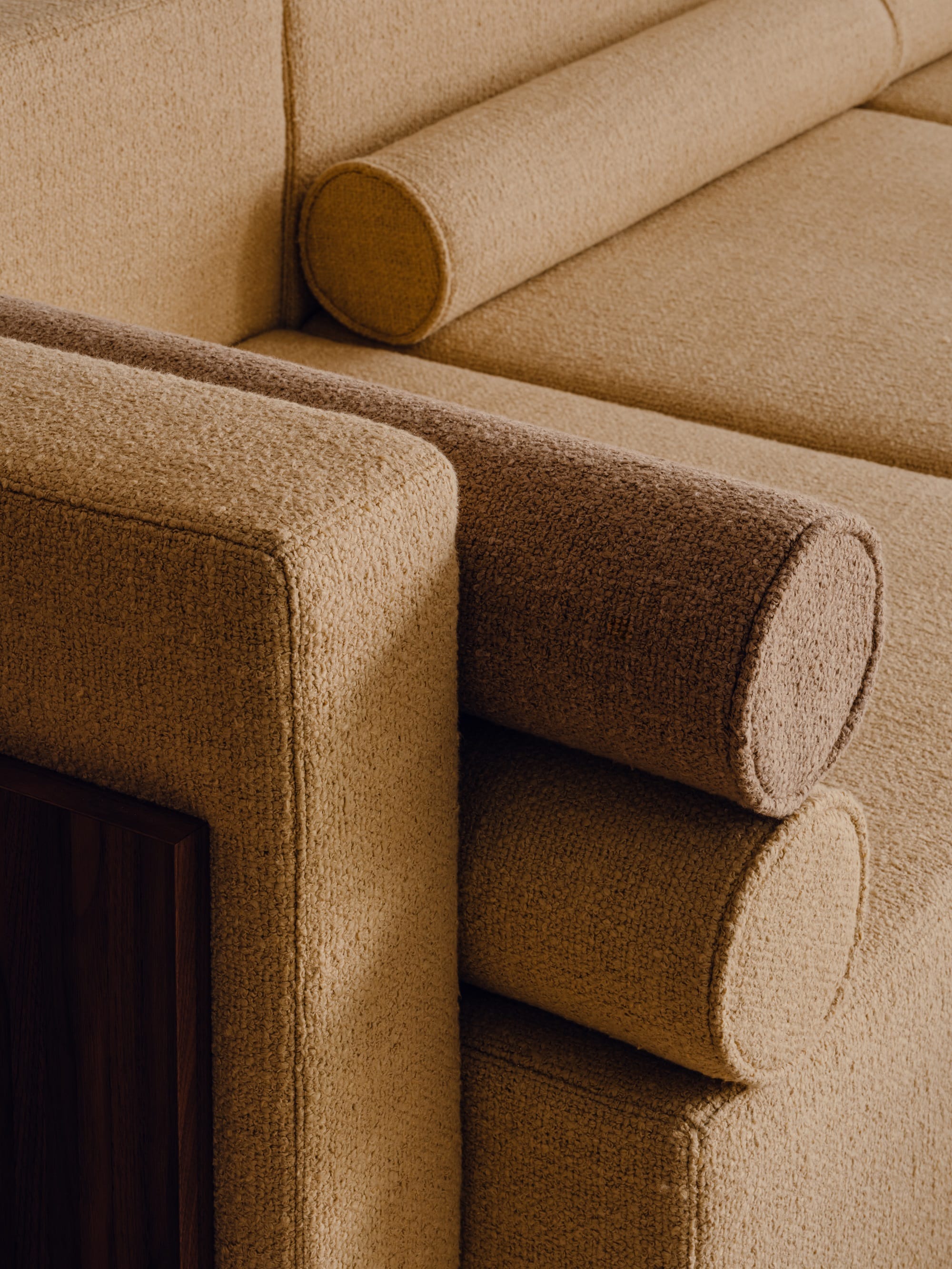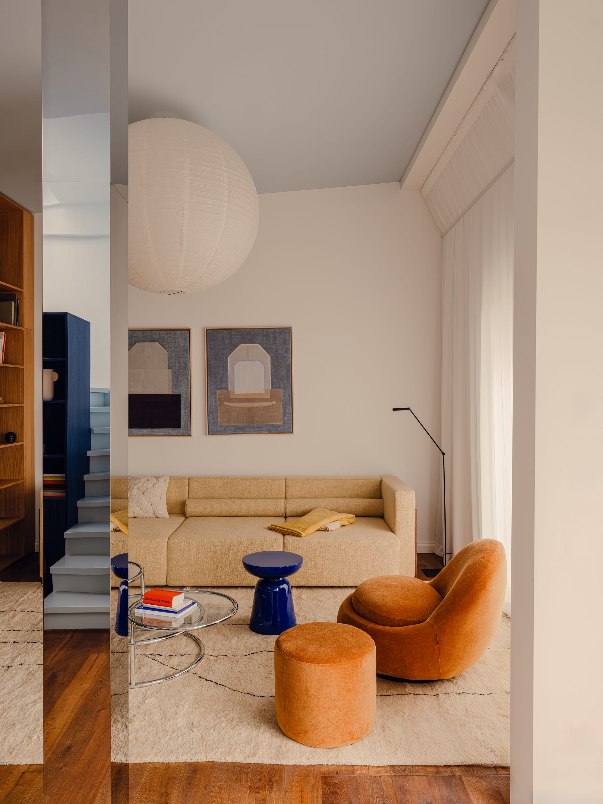 – Uwielbiamy pokoje w pokojach, niekonwencjonalne kombinacje kolorów oraz kontrasty twardego i miękkiego – podsumowuje Bruzkus. Specjalnie zaprojektowana kanapa w kolorze maślanym – Sophia 3000 – kotwiczy strefę dzienną, a nachylony niebieski sufit nadaje wspólny mianownik wszystkim strefom i pozwala, by przestrzeń salonu płynnie przechodziła w strefę biura domowego i sypialni.