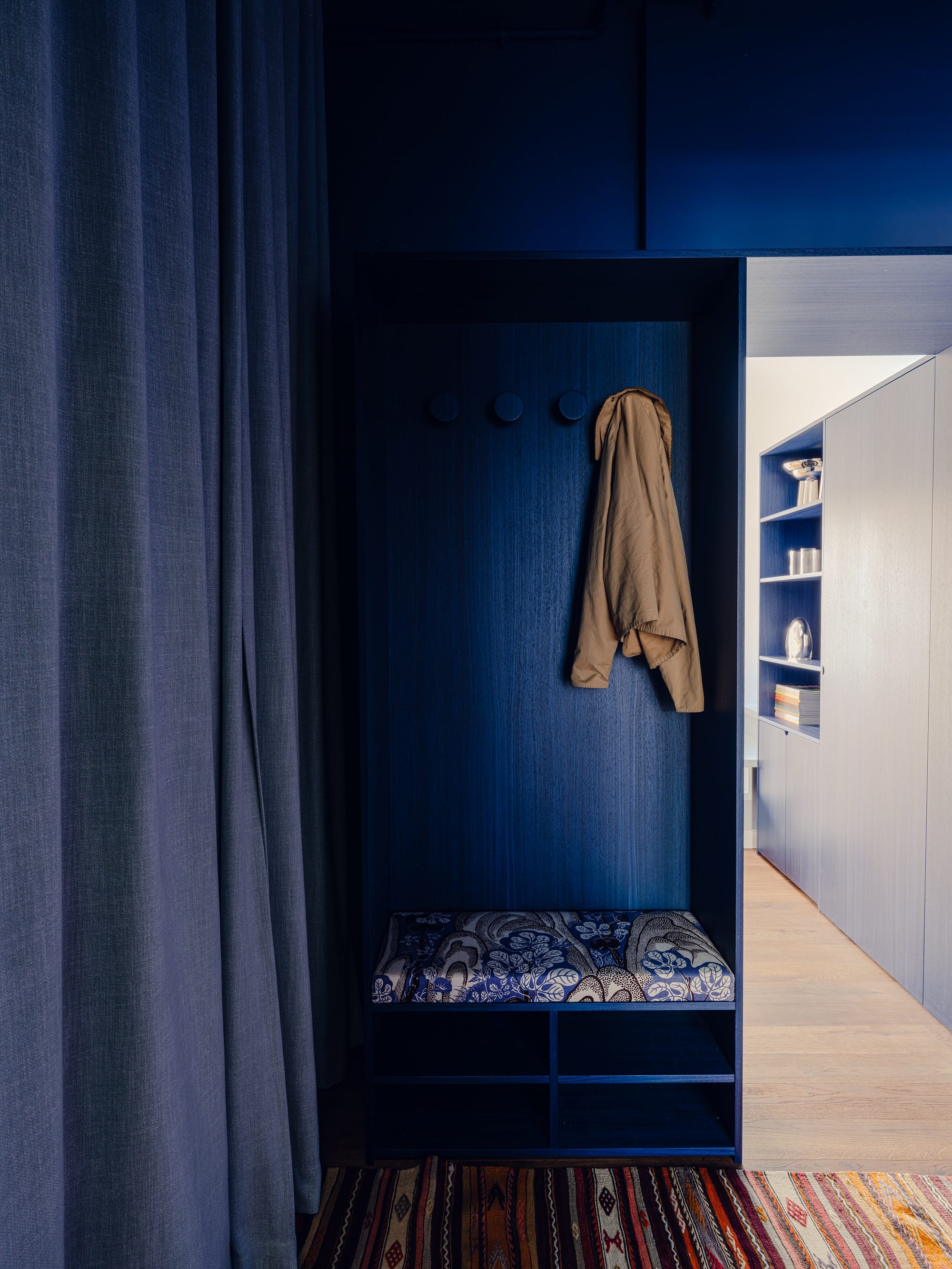 Niebieskie pudełko – bejcowane, a nie malowane, żeby uwidocznić strukturę drewna – nie przylega do ścian, można więc wokół niego chodzić. Dzięki temu plan 75-metrowego mieszkania pozostaje otwarty i pełen energii.