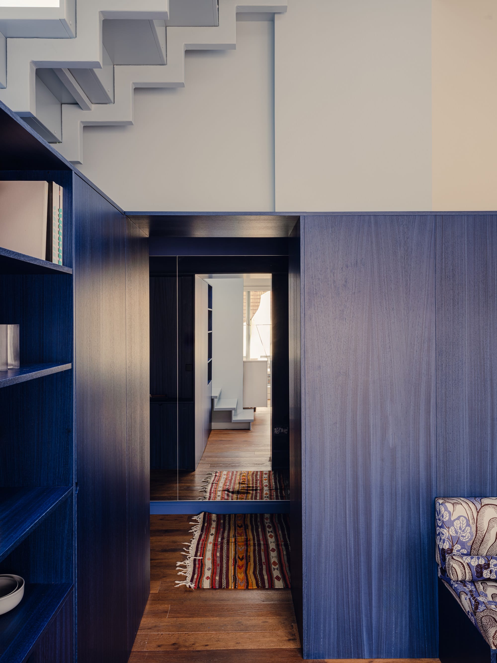 Do mieszkania wchodzi się bezpośrednio przez ciemną i stosunkowo niską bryłę zabudowy, aby następnie znaleźć się w wyższej, jaśniejszej przestrzeni, z oknem sięgającym samego sufitu. Schody w kolorze błękitnego nieba prowadzą na taras na dachu, gdzie wbudowany stół i miejsca do siedzenia tworzą przytulny kącik z panoramicznym widokiem na Berlin.