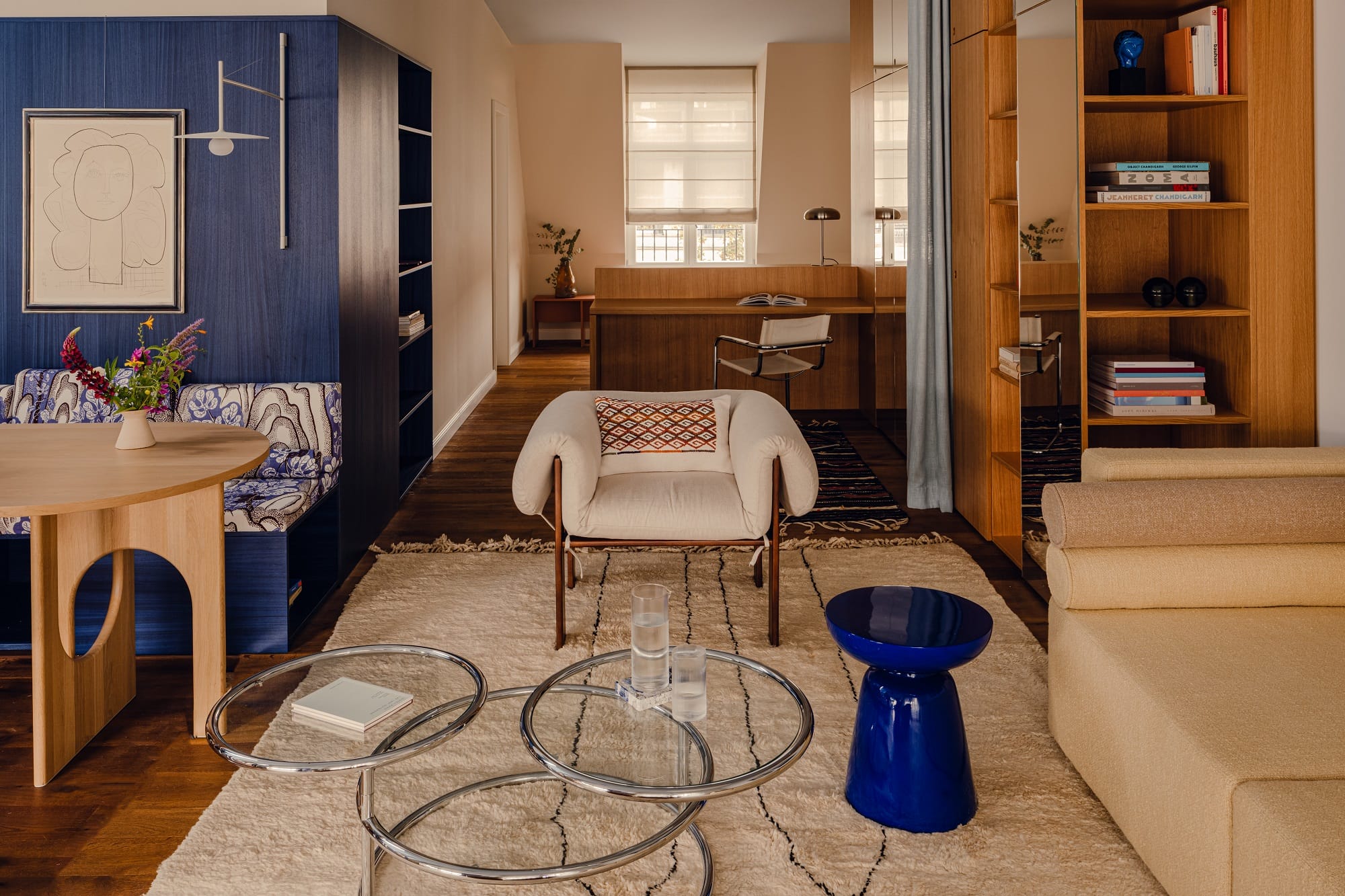 W mieszkaniu na berlińskim Prenzlauer Berg projekt nie rozgrywa się na poziomie dekoracji. Tutaj faktycznie widać architektoniczne interwencje, grę bryłą, kolorem, planem. Trick z niebieskim pudełkiem w środku skupia uwagę, ale w tym wnętrzu jest znacznie więcej udanych pomysłów