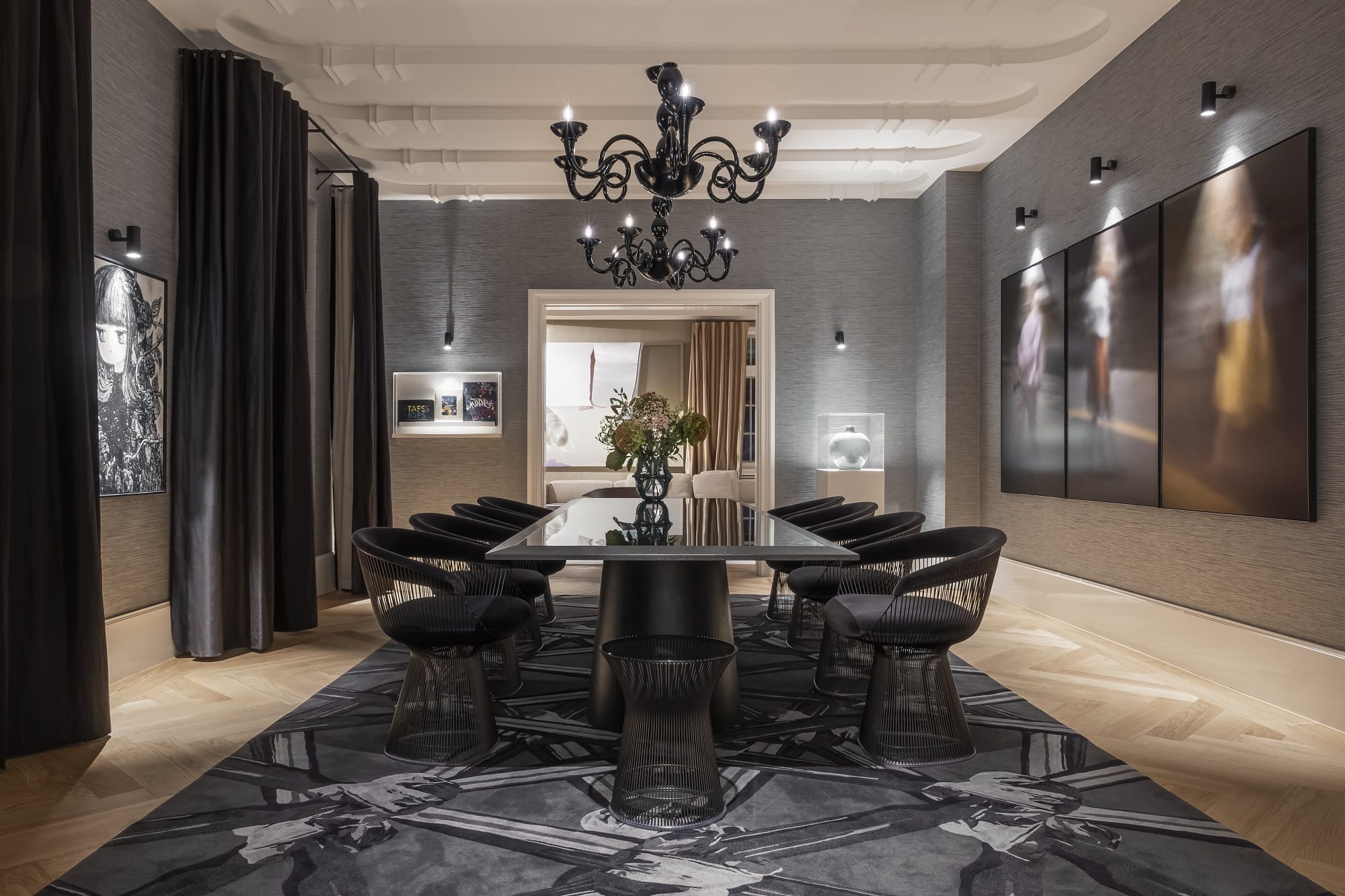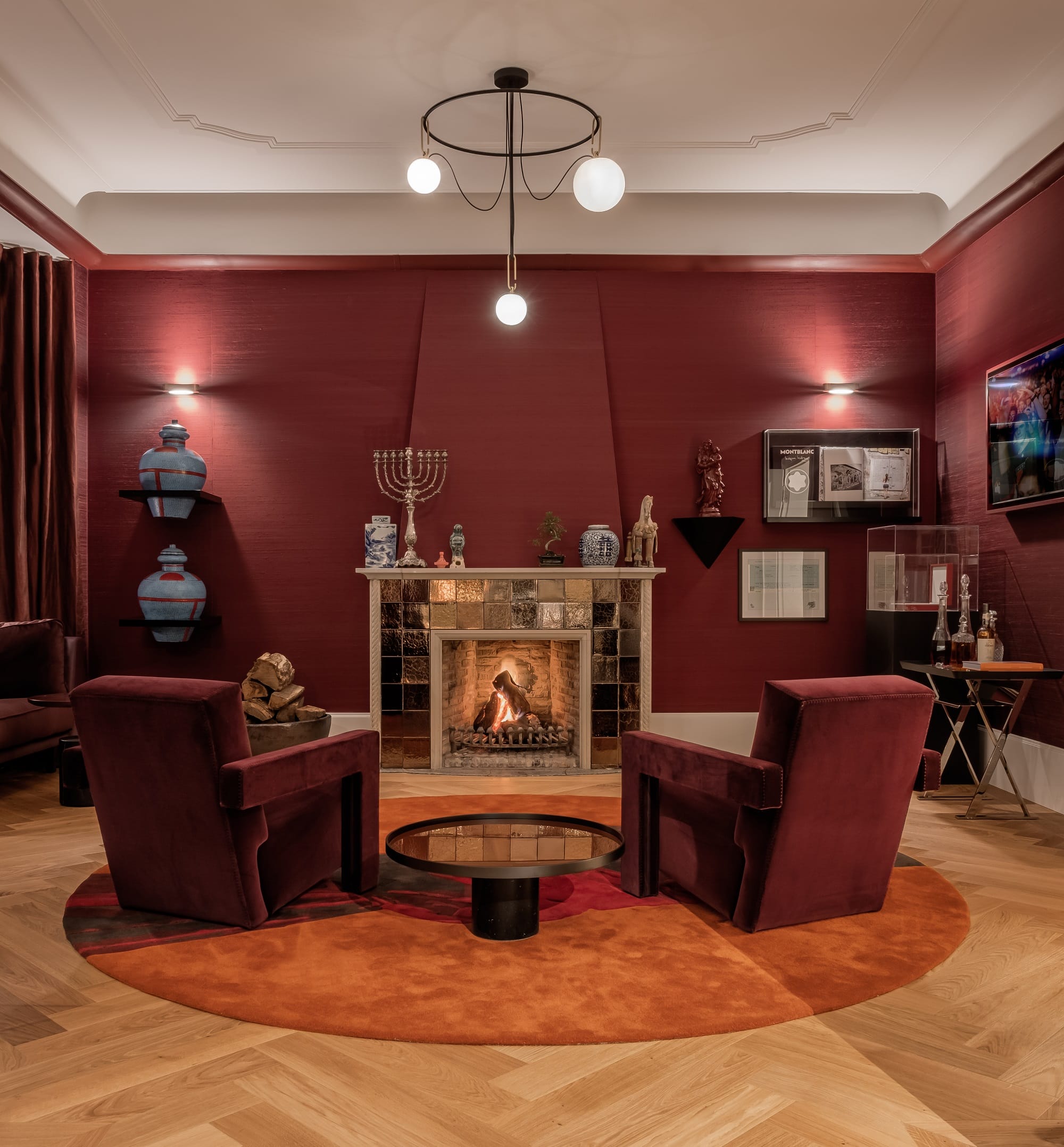 Koncepcja Kitziga osiąga swój punkt kulminacyjny w pokoju z kominkiem, w którym ceramiczne płytki i karmazynowo czerwone fotele tworzą przytulną atmosferę. Centrum aranżacji stanowi lampa wisząca nh projektu Neri&Hu, łącząca dalekowschodnią elegancję z nowoczesnością, idealnie pasująca do kolekcjonerskiego klimatu pomieszczenia z wazonami i gablotami. Model nh w wersji stojącej pojawia się także w holu.
