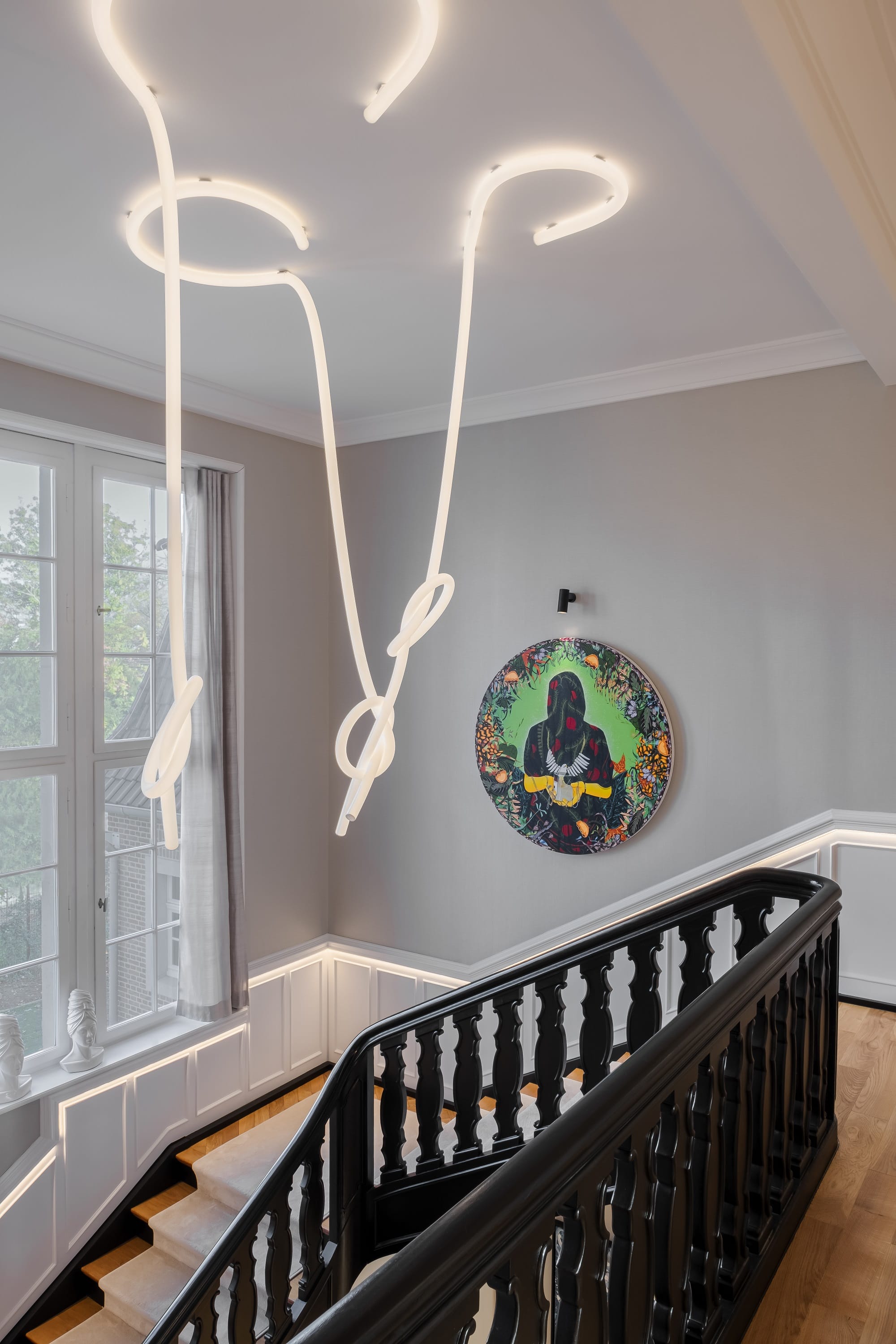 W całym budynku lampy same w sobie stają się elementami ekspozycji: lampy wiszące Gople zachwycają połyskującym szklanym korpusem, nadając charakter piwniczce na wino. Spektakularny efekt uzyskano również dzięki La Linea autorstwa Bjarke Ingels Group (BIG): niezwykle giętki świetlny wąż zawieszony w luźnych węzłach nad schodami sam w sobie staje się dziełem sztuki.