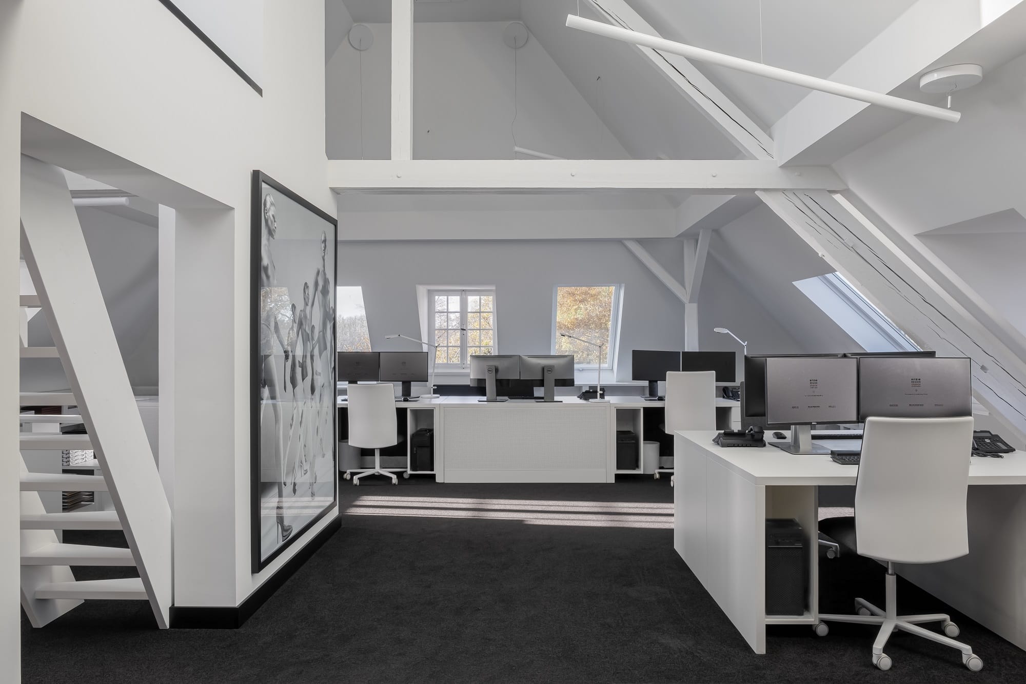 W biurze na poddaszu Olaf Kitzig postawił na kompozycje z mebli, dzieł sztuki i zaprojektowanych przez siebie dywanów. Lampy wiszące Alphabet of Light i lampy stołowe Demetra łączą tam estetykę z funkcjonalnością, a oświetlenie A.24 Sharping w kuchni biurowej zapewnia skoncentrowane światło.