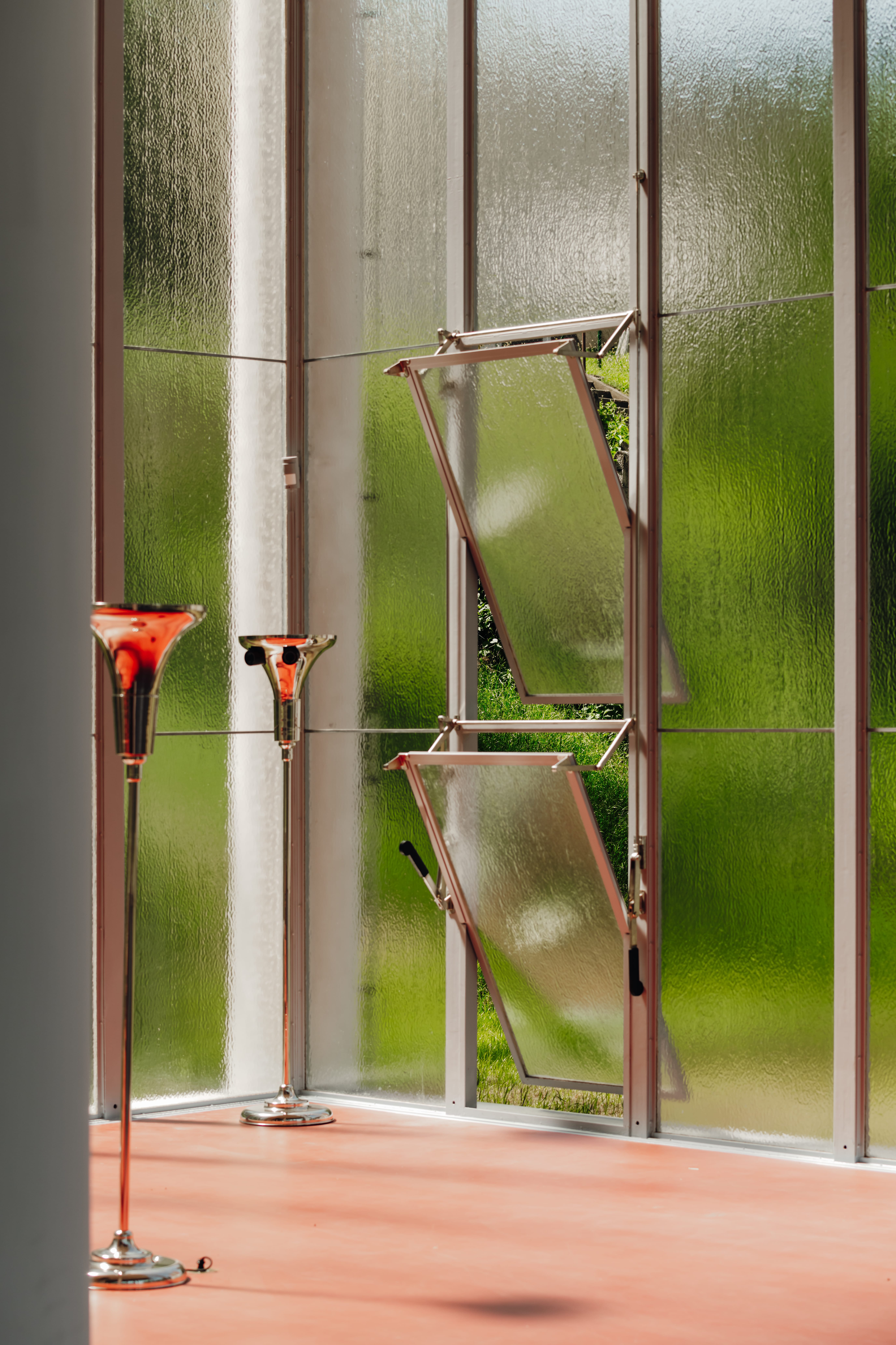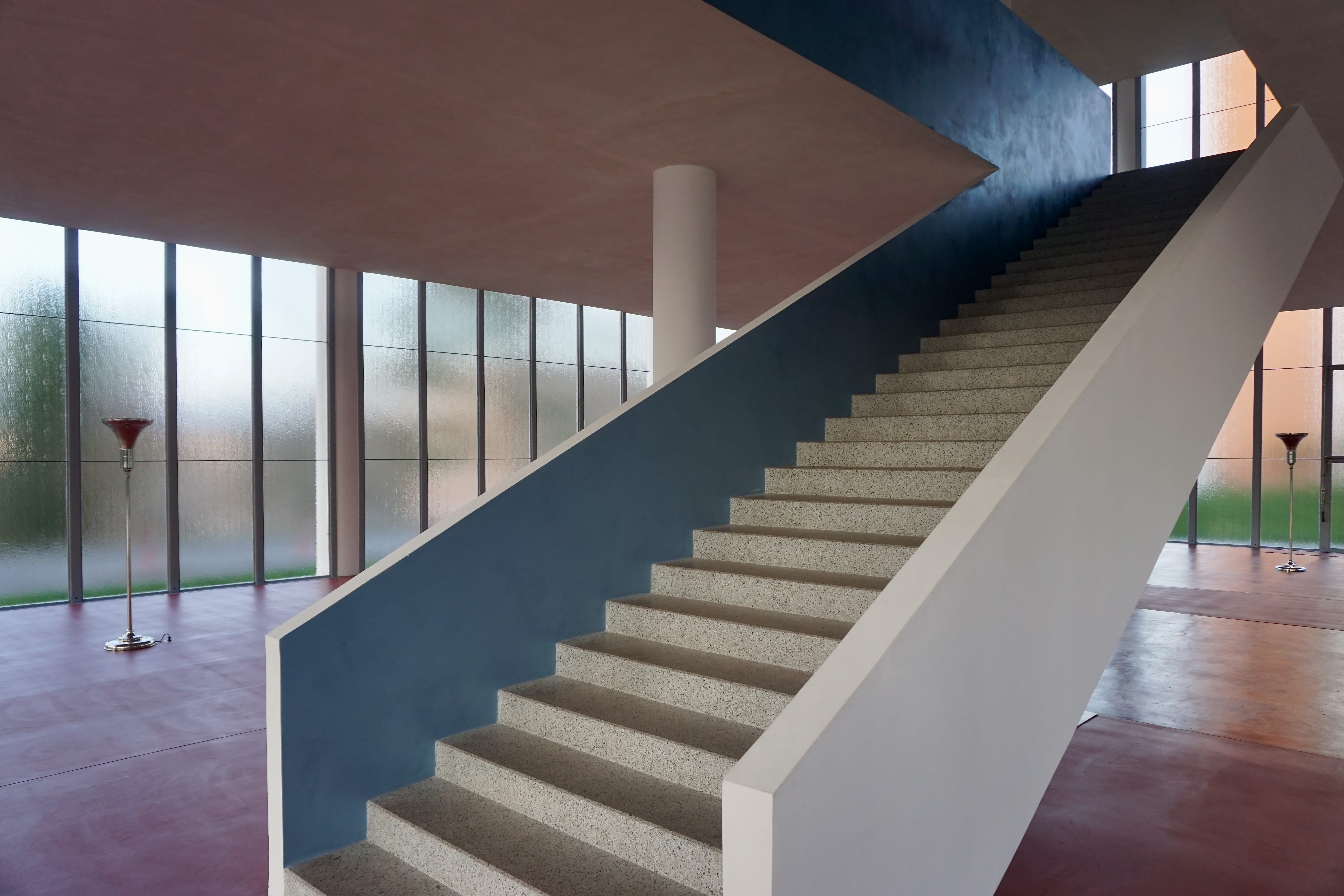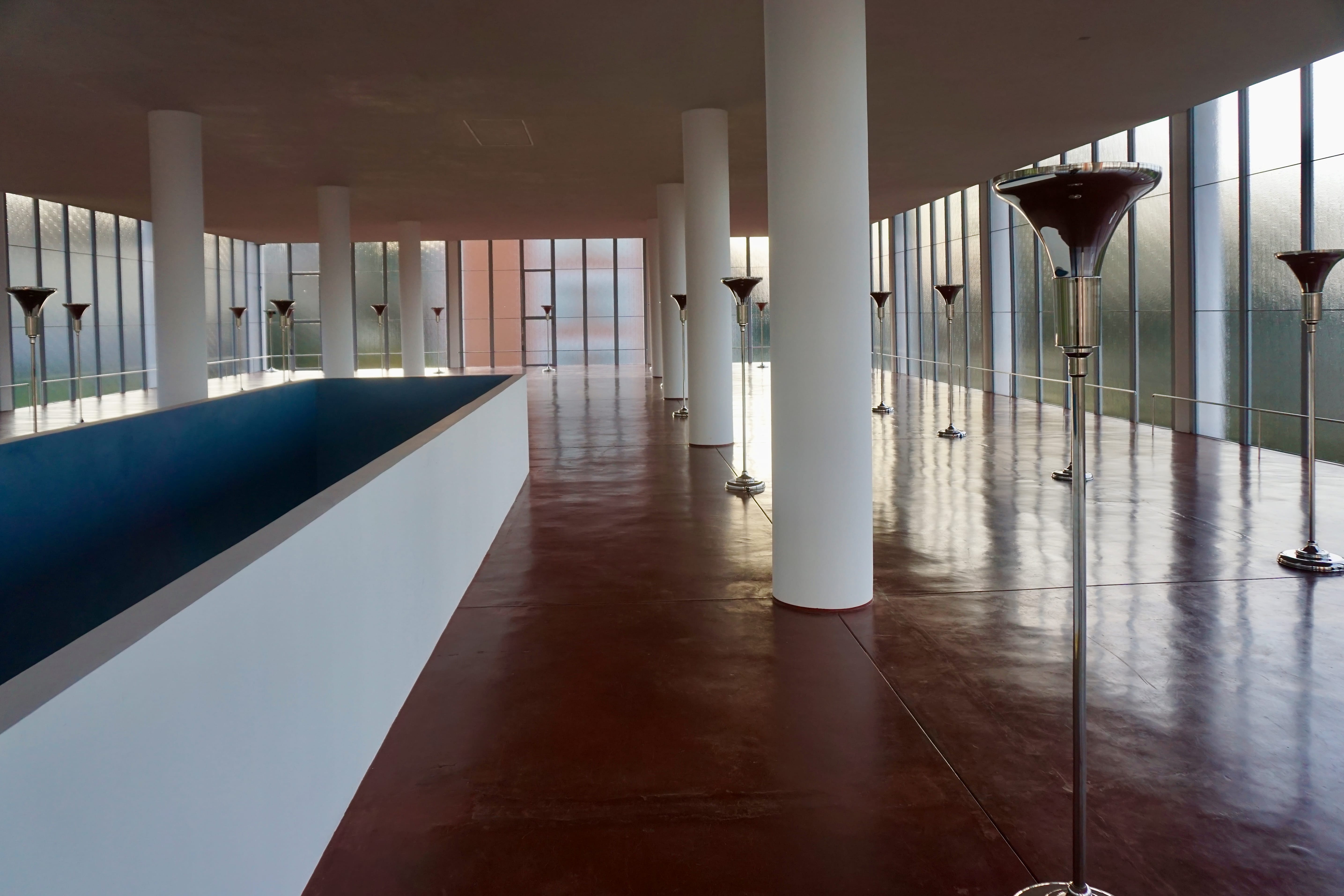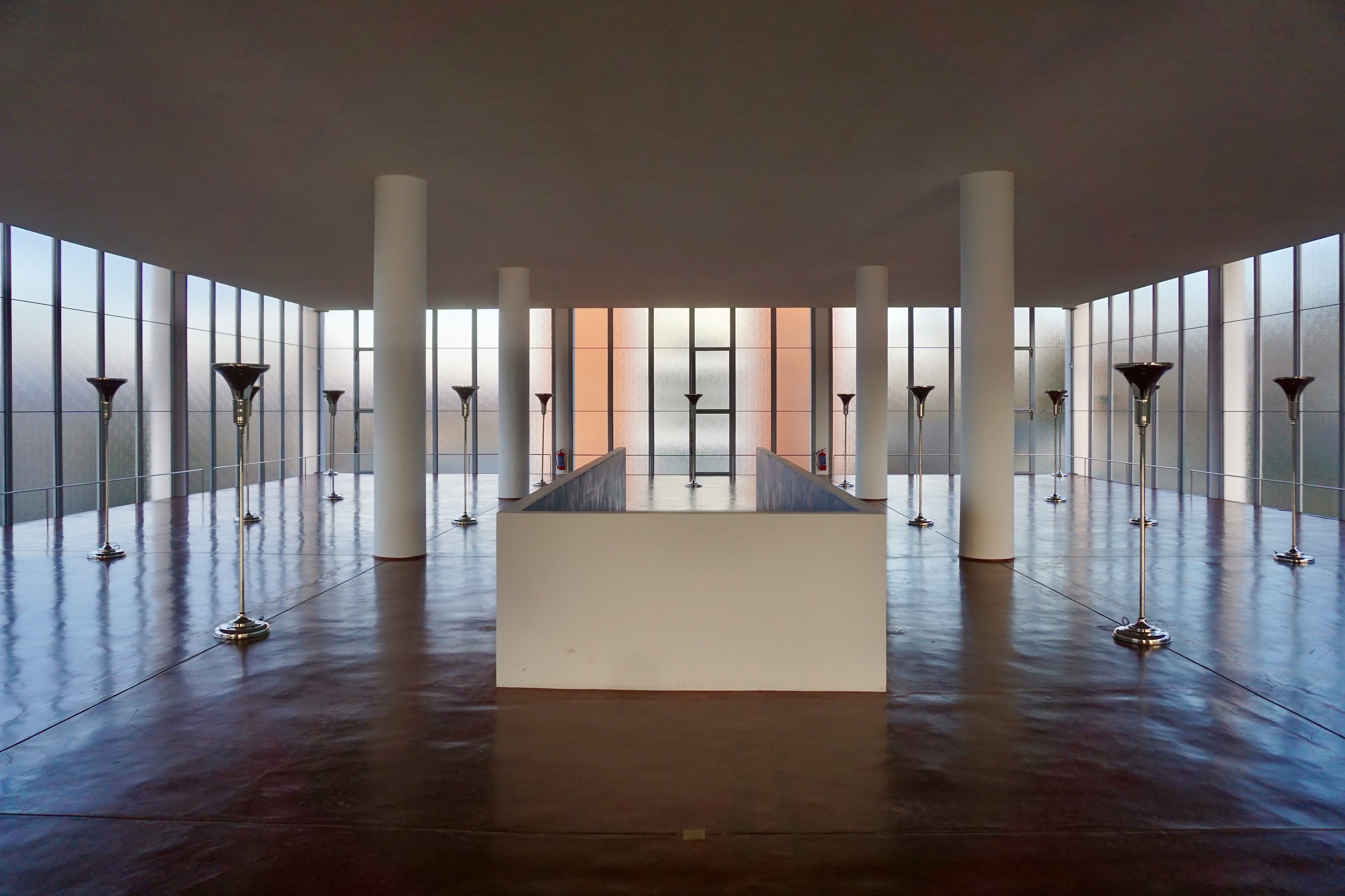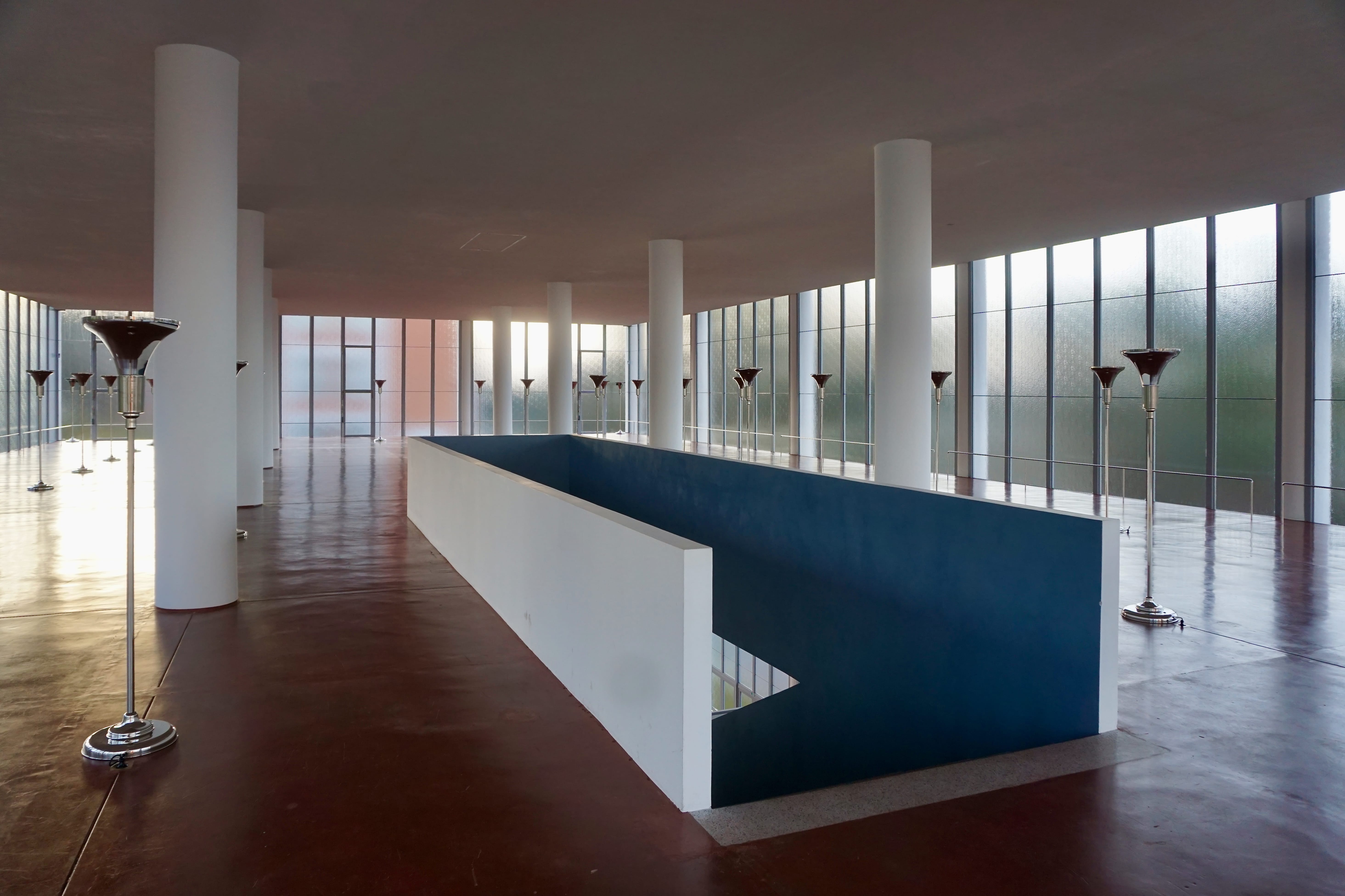Wnętrze budynku to obszerna świetlista hala bez podziałów, tak jasna, że granica między przestrzenią a światłem zgodnie z założeniami modernizmu. Szkło na elewacji otwiera przestrzeń, podtrzymywaną jedynie lekką strukturą konstrukcji.