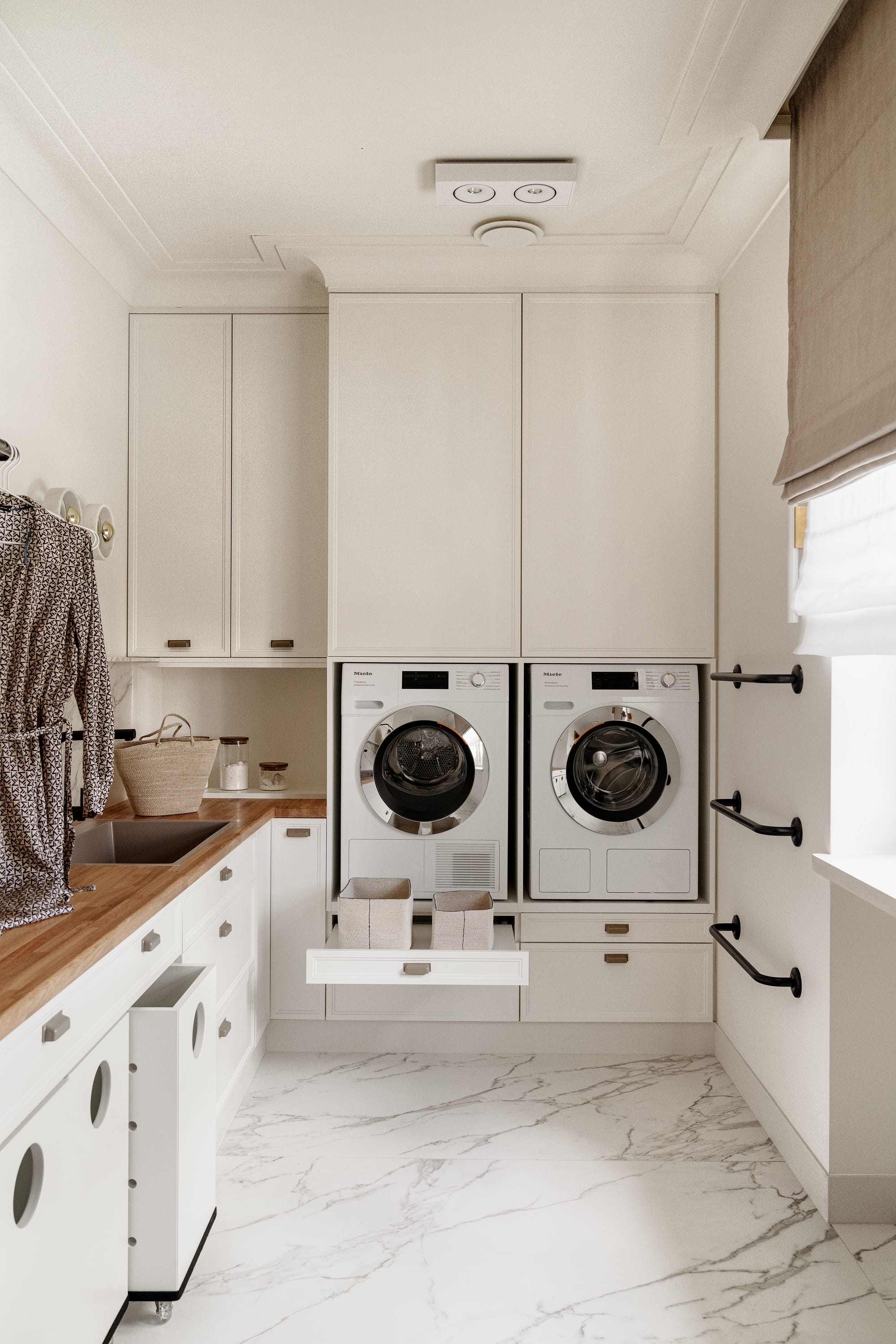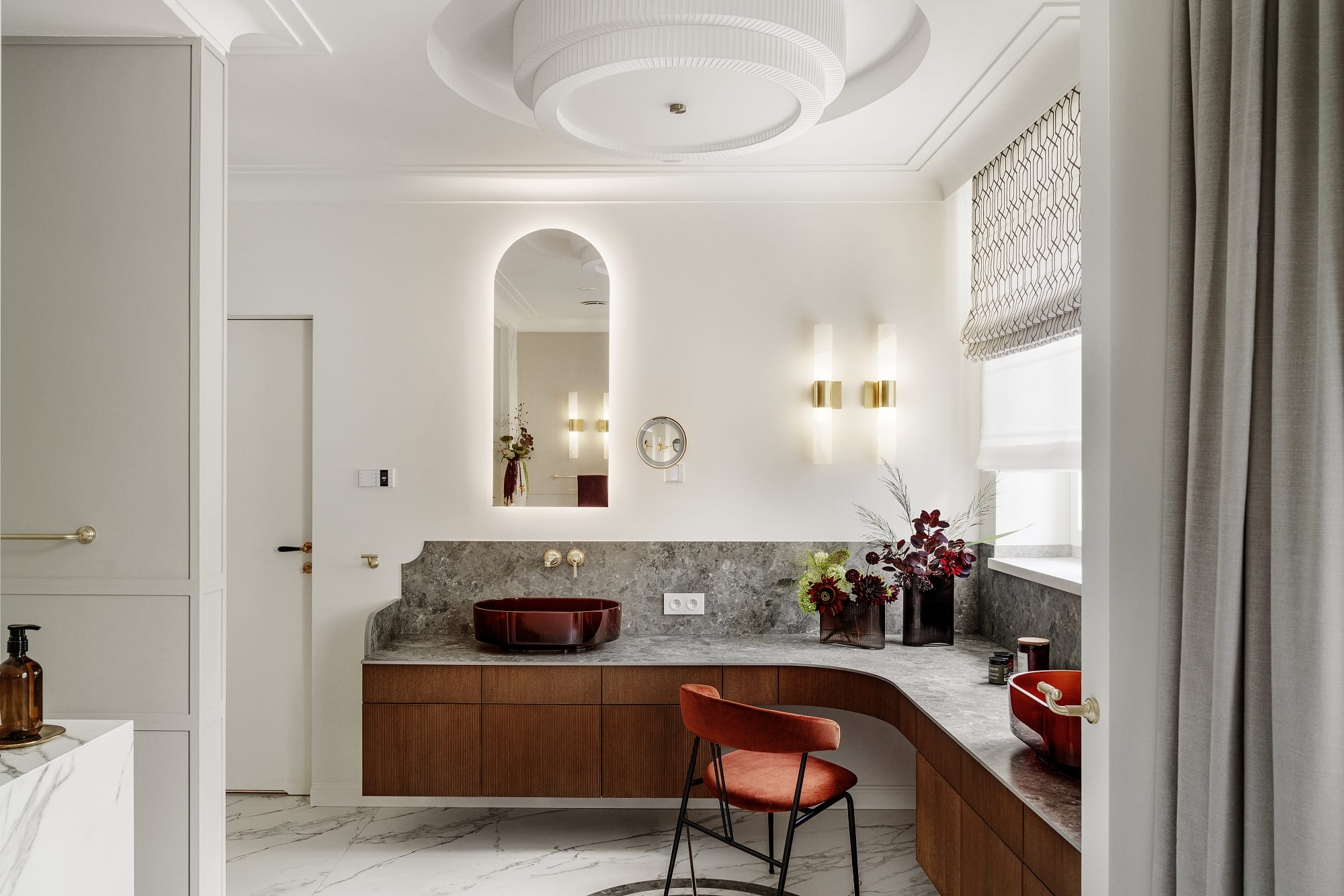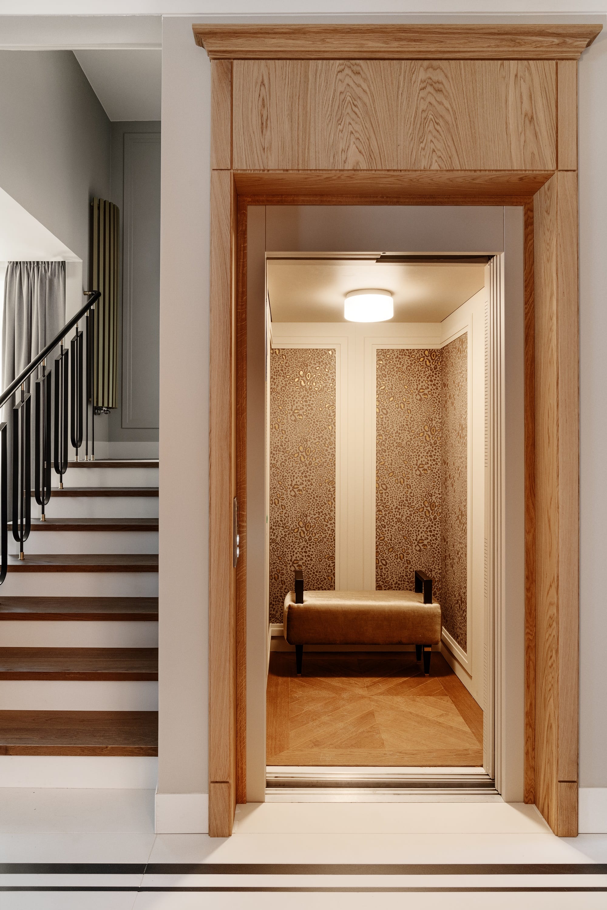 Celem było stworzenie komfortowej przestrzeni dla rodziny 2+3, której zależało na klasycznym stylu z elementami ArtDeco, ale również na pełnym arsenale nowoczesnych udogodnień. Rekuperacja, klimatyzacja, ogrzewanie ścienne i podłogowe, odkurzacz centralny, obrotnica w garażu, a nawet winda łącząca cztery kondygnacje – ten dom działa jak dobrze zsynchronizowana maszyna.