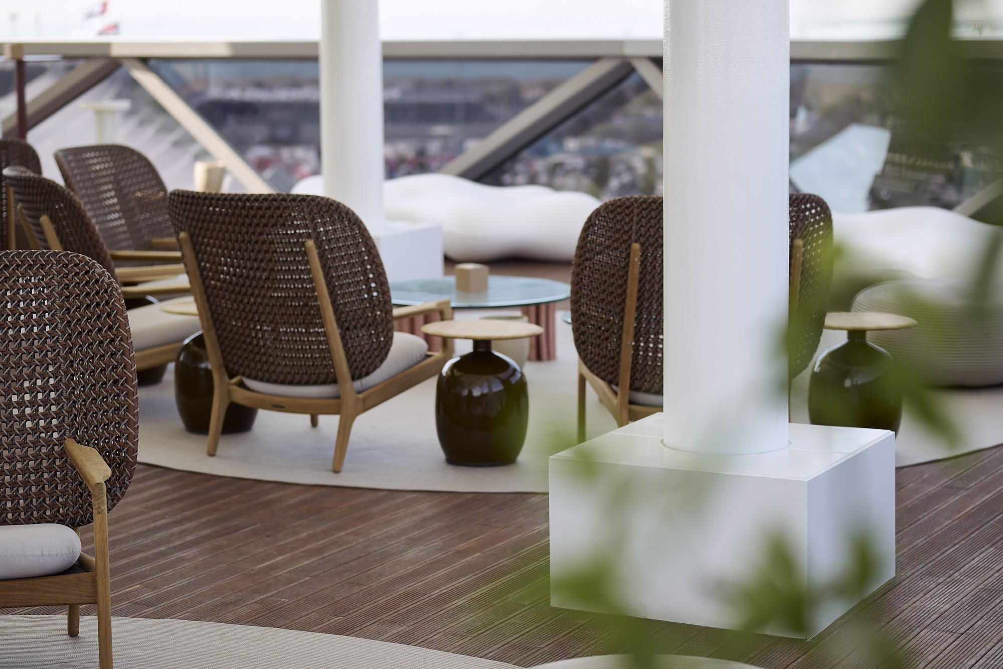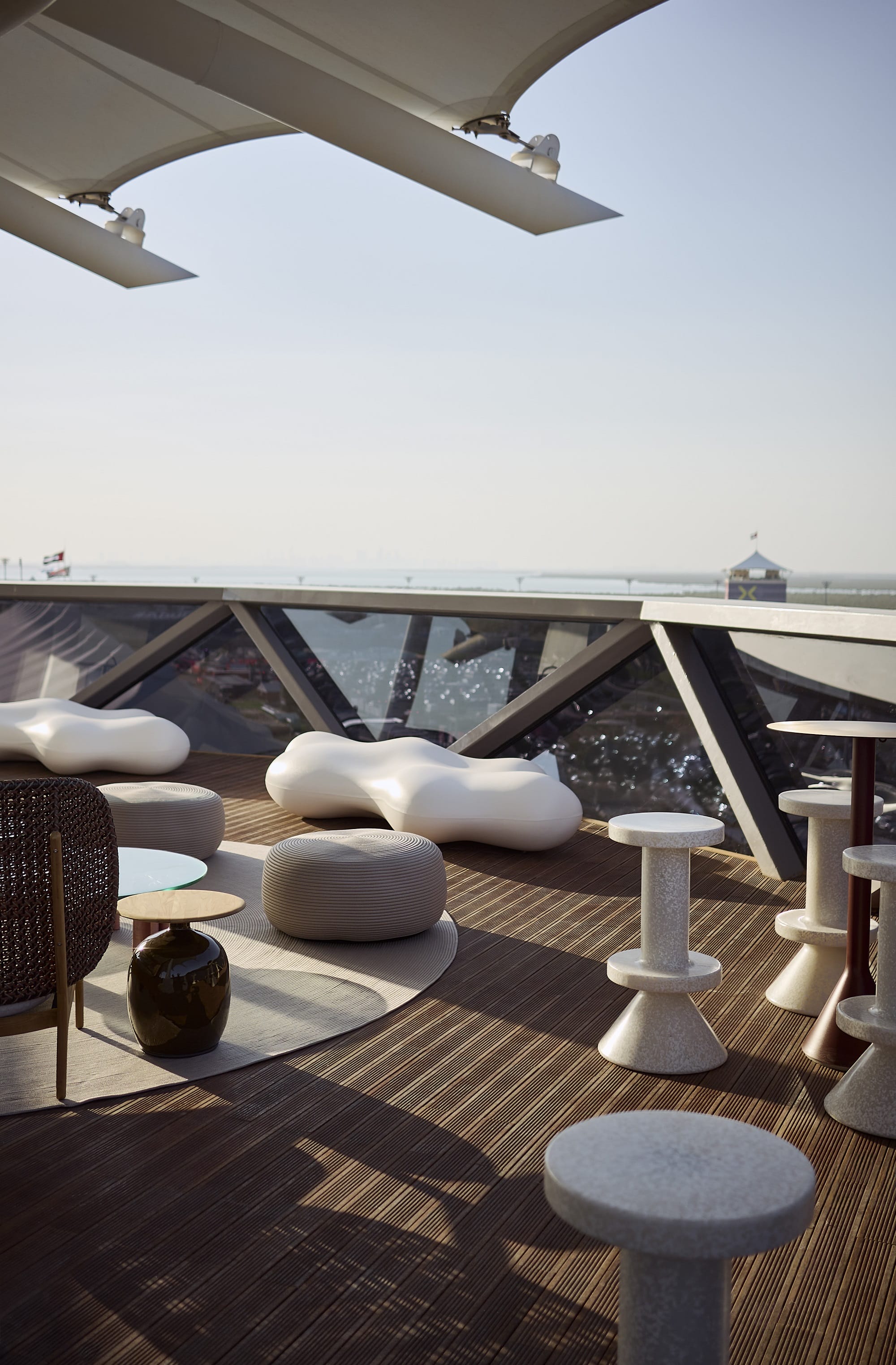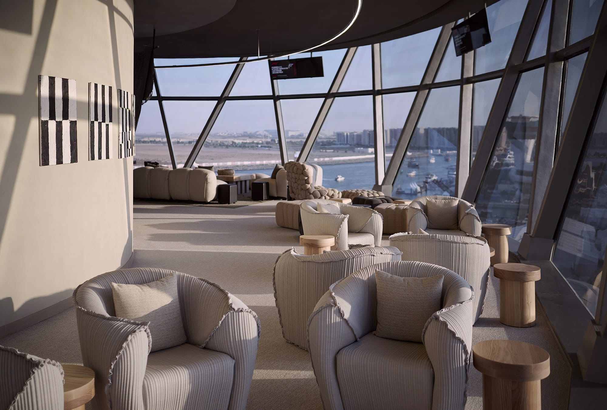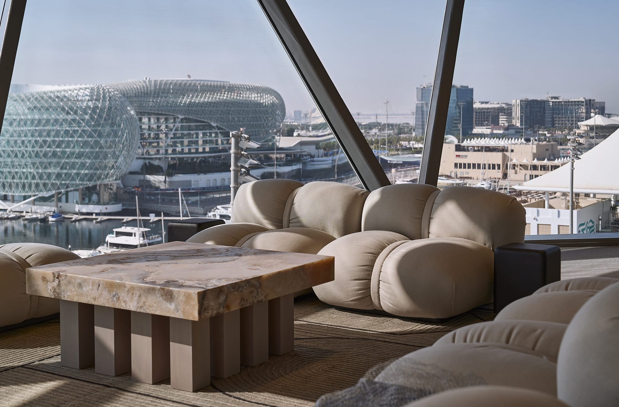 Lounge rozciąga się na dwóch kondygnacjach zwieńczonych panoramicznym tarasem, osłoniętym namiotową konstrukcją. Panorama obejmuje 360 stopni, ale najlepsze miejsca skierowane są bezpośrednio na linię mety toru Yas Marina.