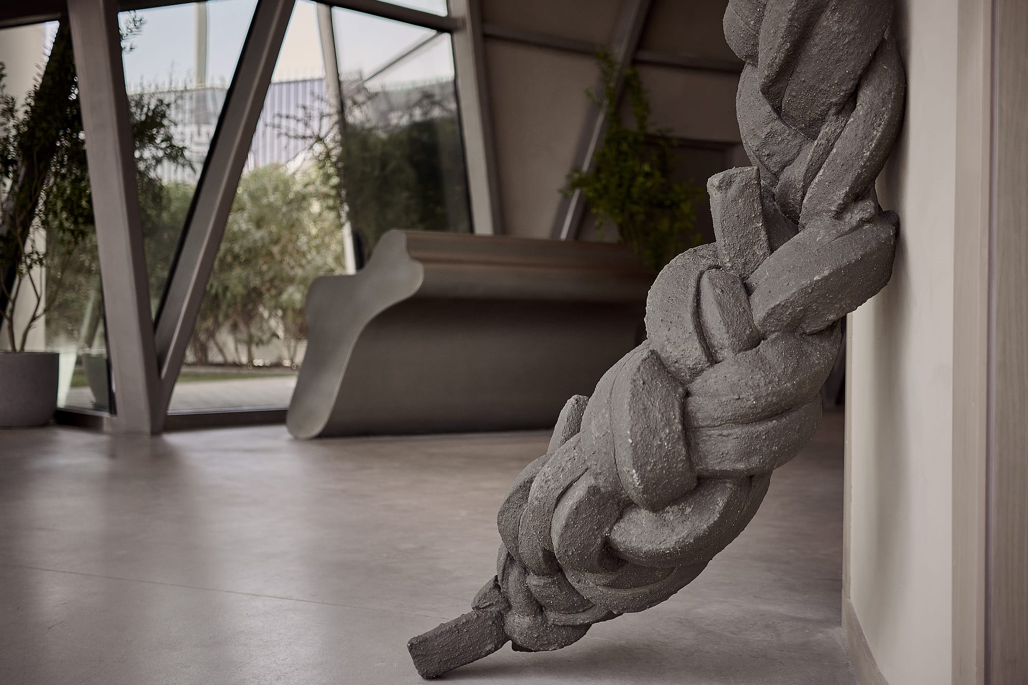 Jedną z najbardziej charakterystycznych prac jest rzeźba emirackiej artystki przypominająca pleciony warkocz, o powierzchni przywodzącej na myśl asfalt. Utrzymuje się na jednym gwoździu, wygląda lekko, niemal przeczy grawitacji, a jednocześnie ma w sobie energię ruchu maszyn.