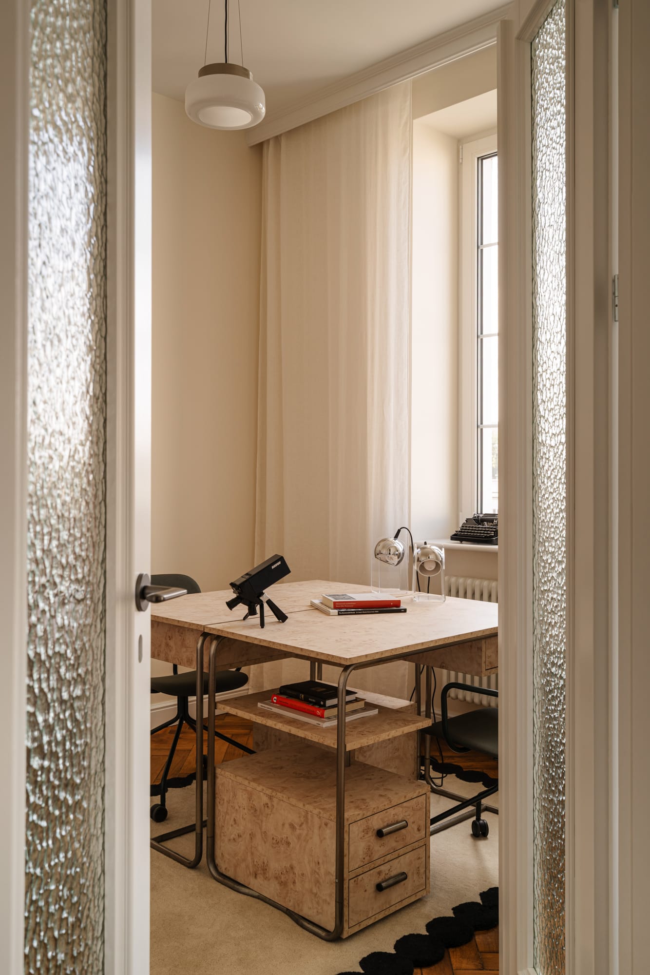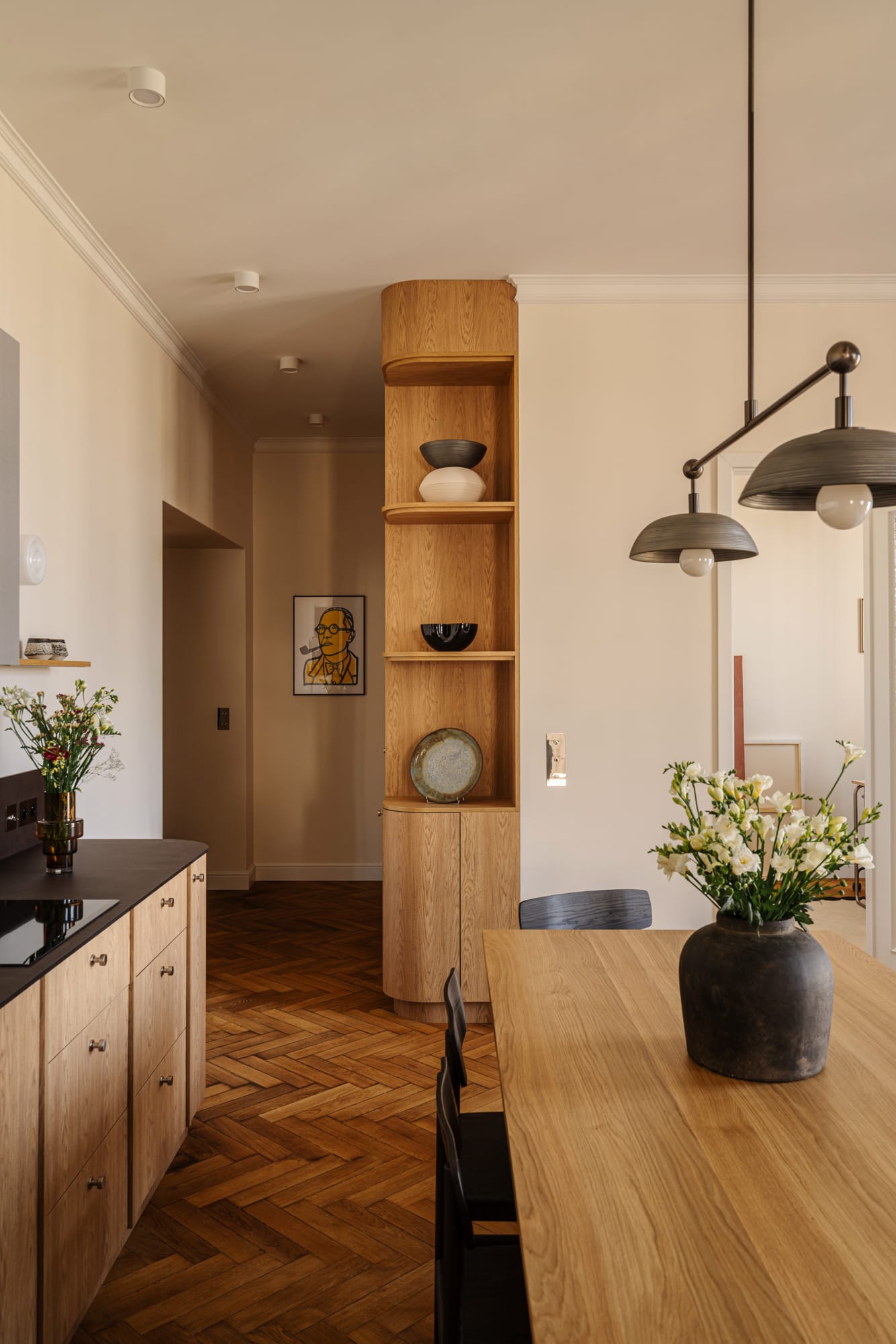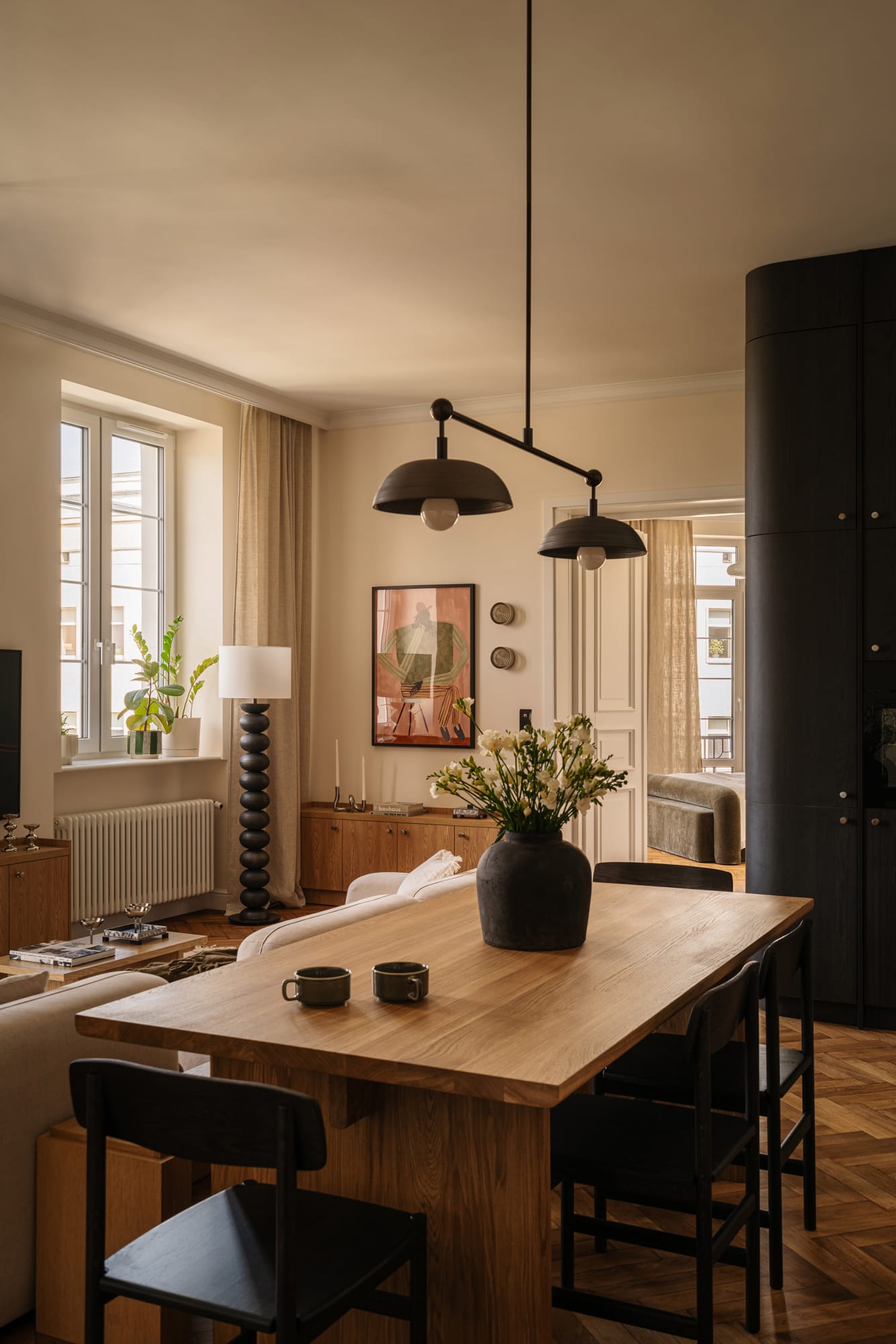 Aranżację uzupełniają elementy vintage, częściowo odrestaurowane na potrzeby tego mieszkania, m.in. biurka lekarskie z oryginalnymi stelażami, fotel Delta Chair marki Wilkhahn czy Soft Pad Chair EA 216 projektu Ray’a i Charlesa Eamesów.