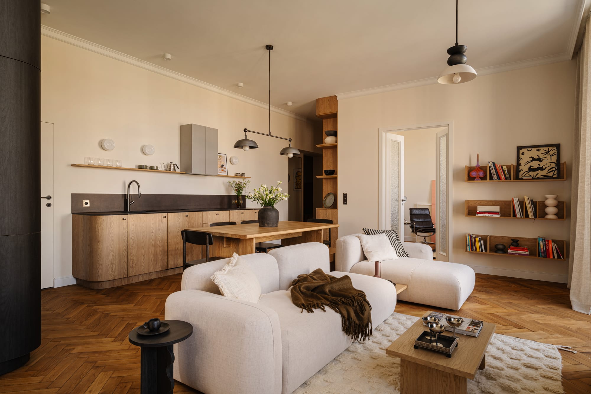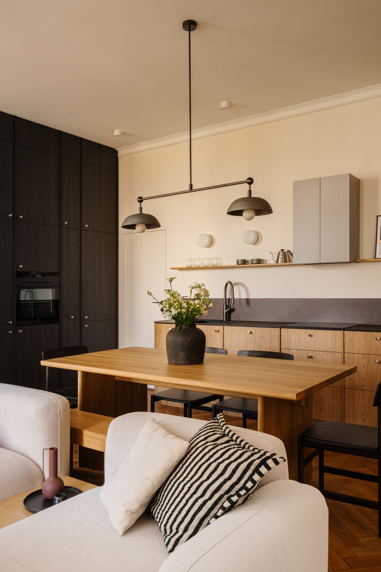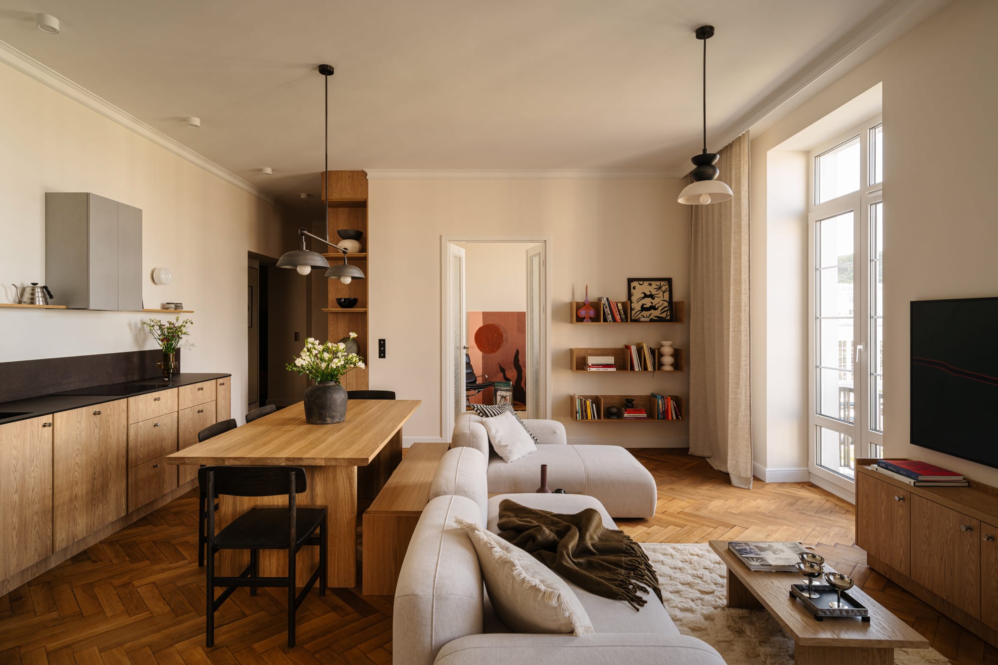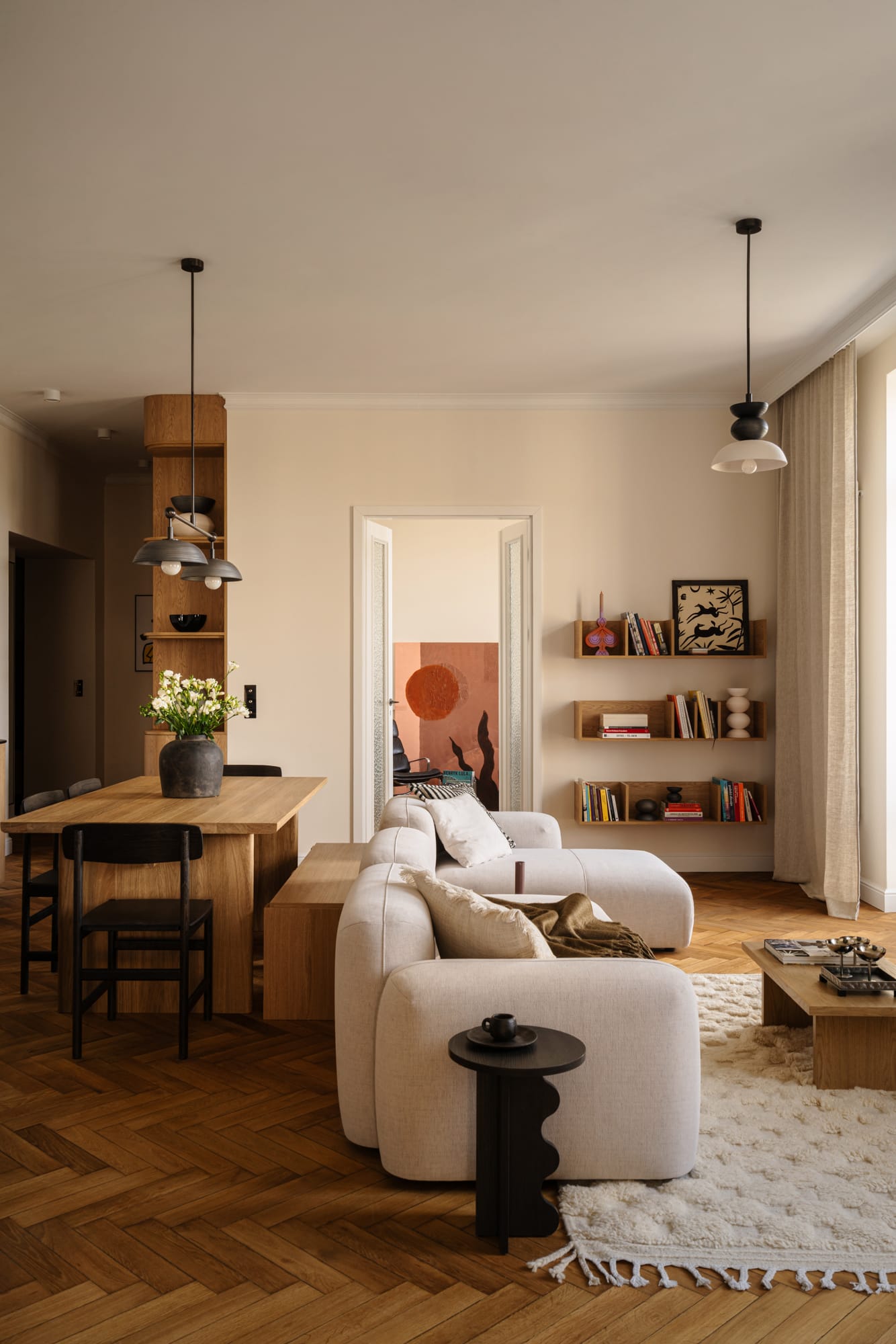 Blisko 100-metrowe mieszkanie znajduje się w przedwojennej kamienicy przy ul. Wójta Radtkego w Gdyni – gmachu dawnego Państwowego Banku Rolnego z 1933 roku, zaprojektowanego przez Mariana Lalewicza. Budynek zachował wiele ze swych oryginalnych cech: wysokie sufity, duże okna i charakterystyczne detale, które stały się punktem wyjścia do projektu wnętrza Justyny Hys-Bochińskiej z J Creative Studio.
