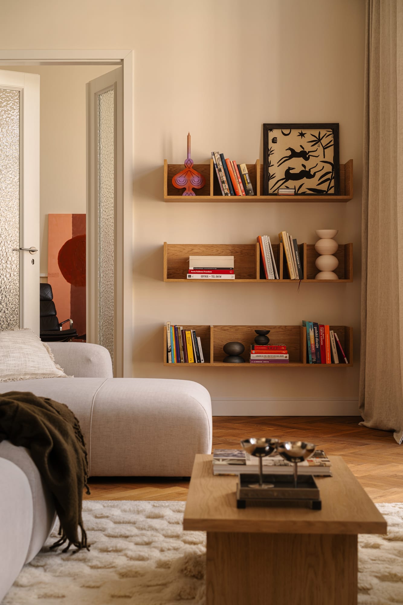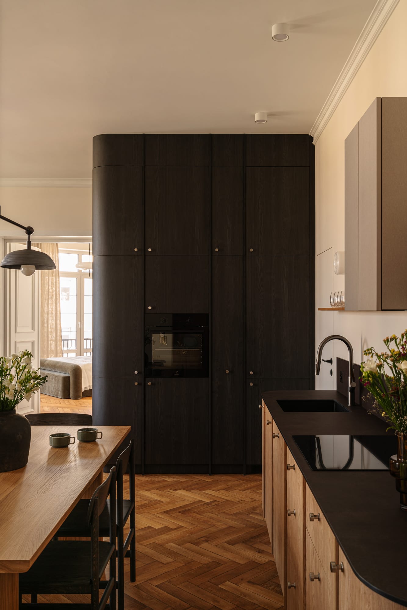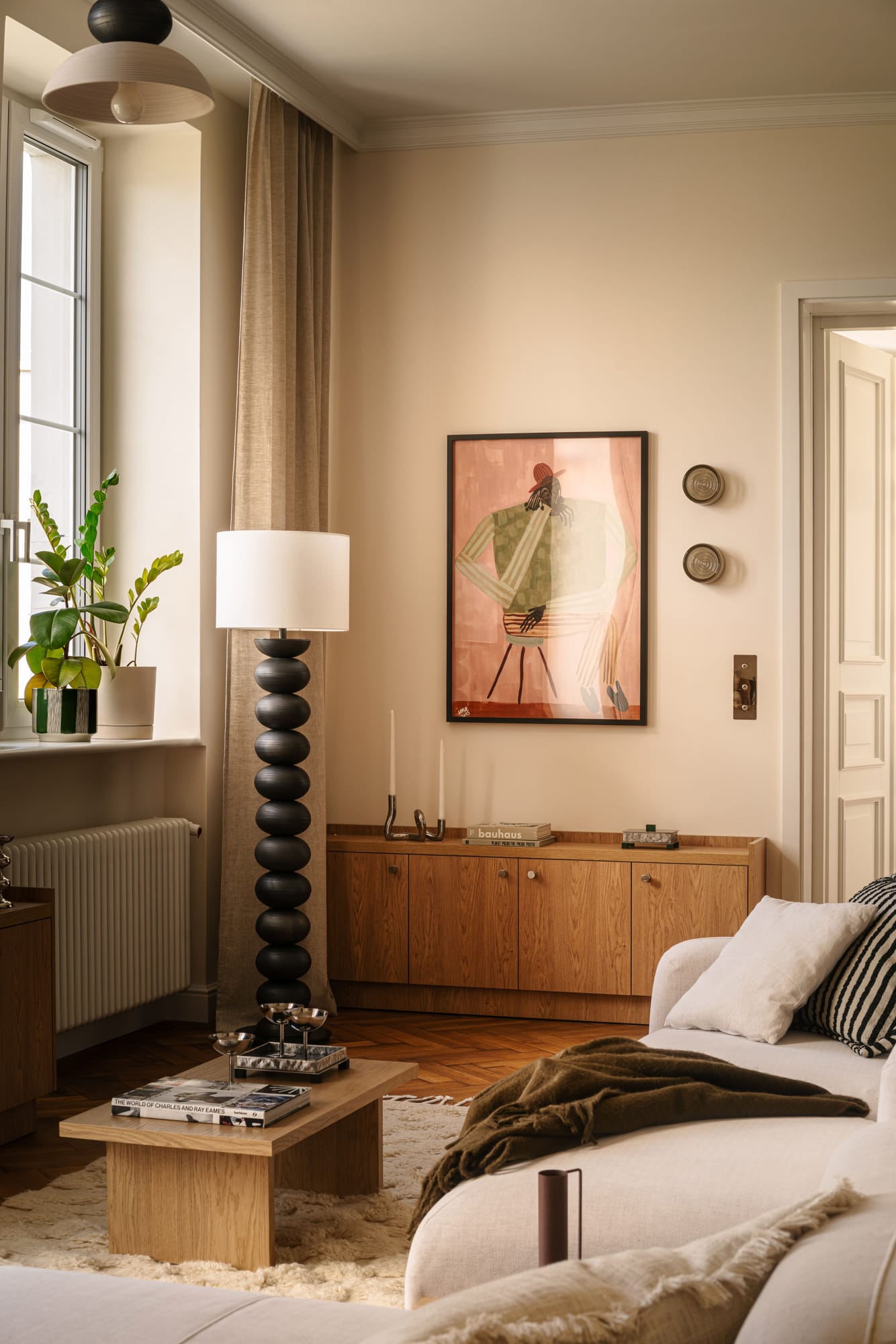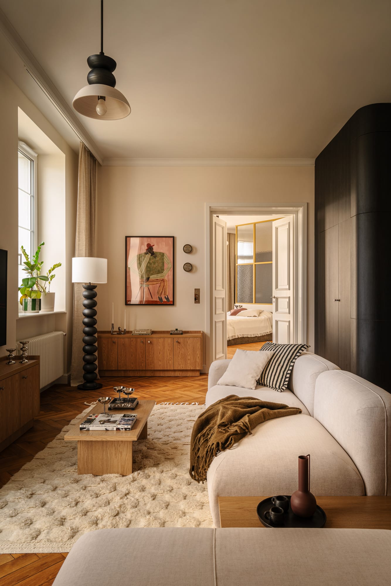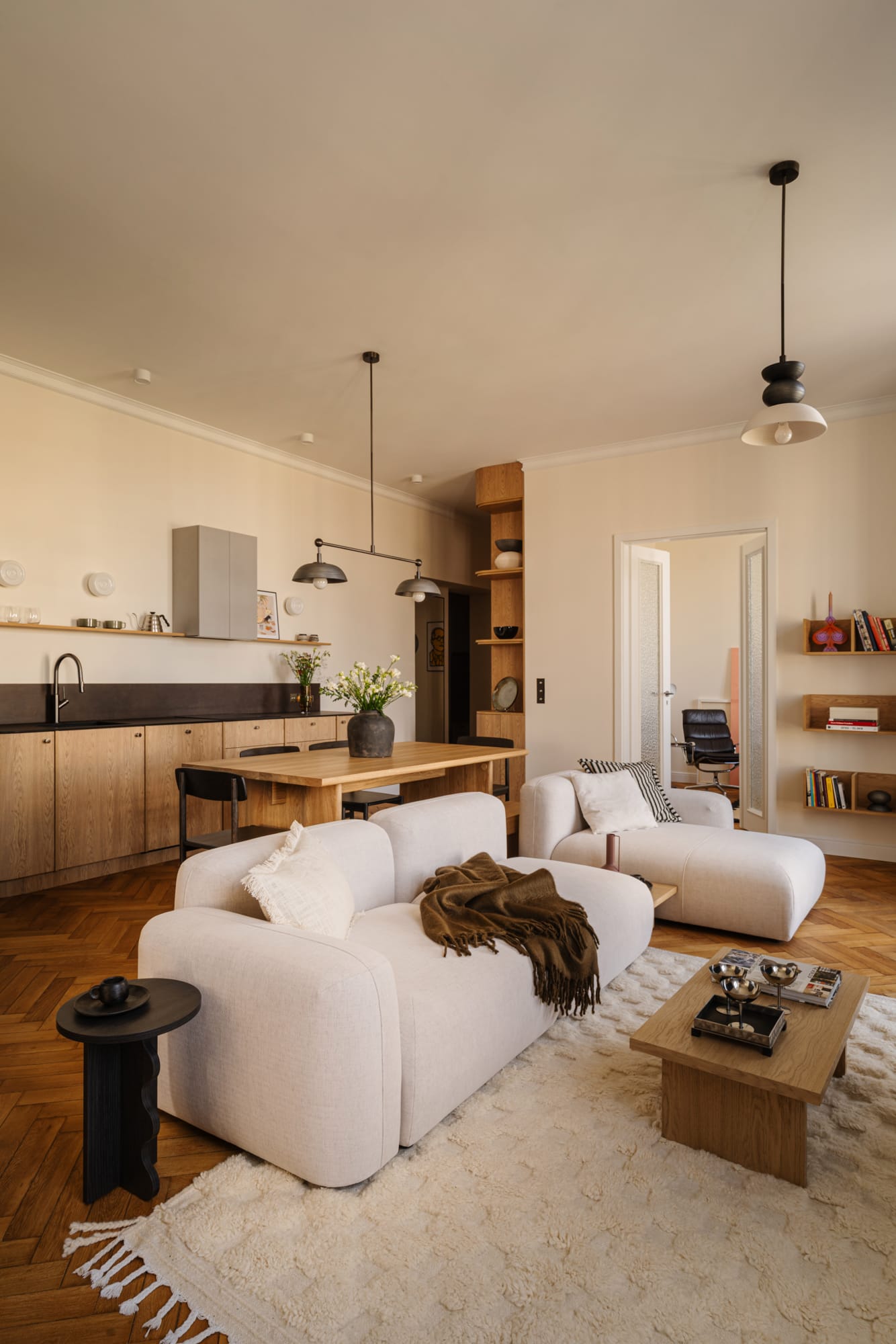Blisko 100-metrowe mieszkanie znajduje się w przedwojennej kamienicy przy ul. Wójta Radtkego w Gdyni – gmachu dawnego Państwowego Banku Rolnego z 1933 roku, zaprojektowanego przez Mariana Lalewicza. Budynek zachował wiele ze swych oryginalnych cech: wysokie sufity, duże okna i charakterystyczne detale, które stały się punktem wyjścia do projektu wnętrza Justyny Hys-Bochińskiej z J Creative Studio.
