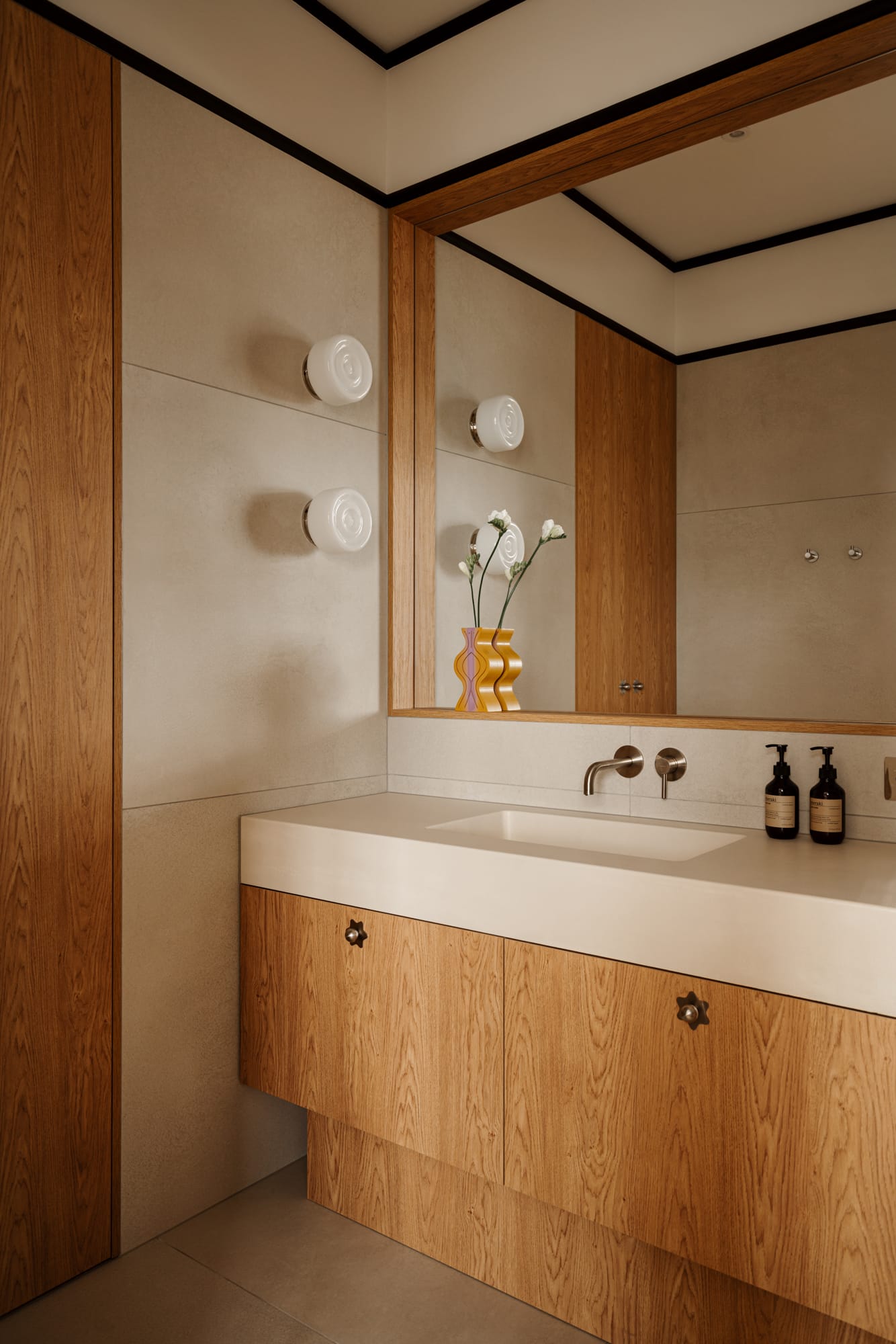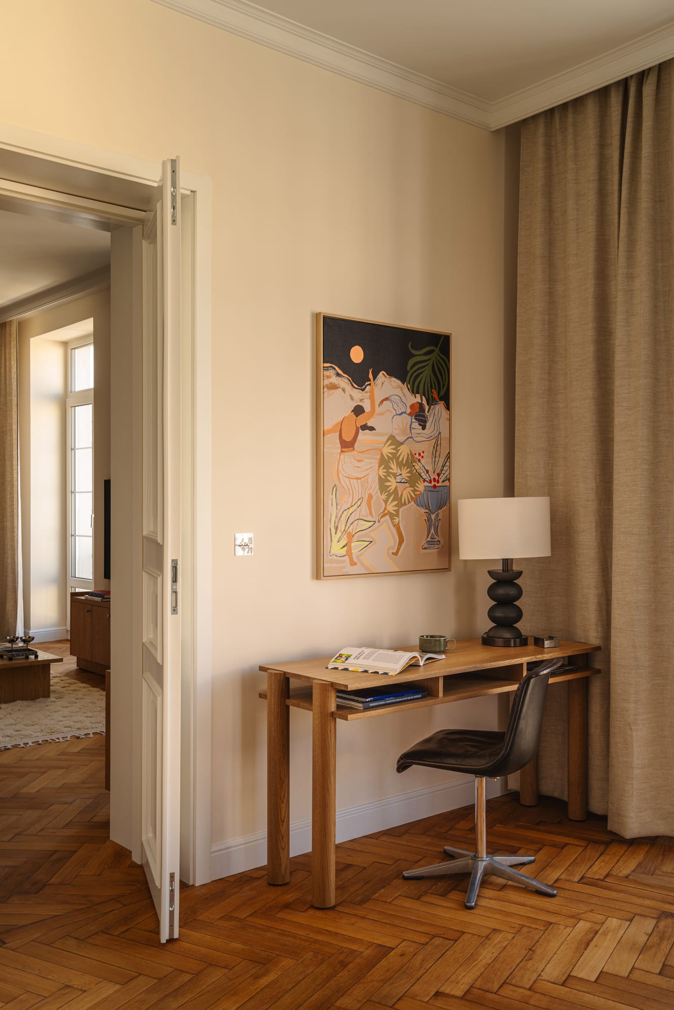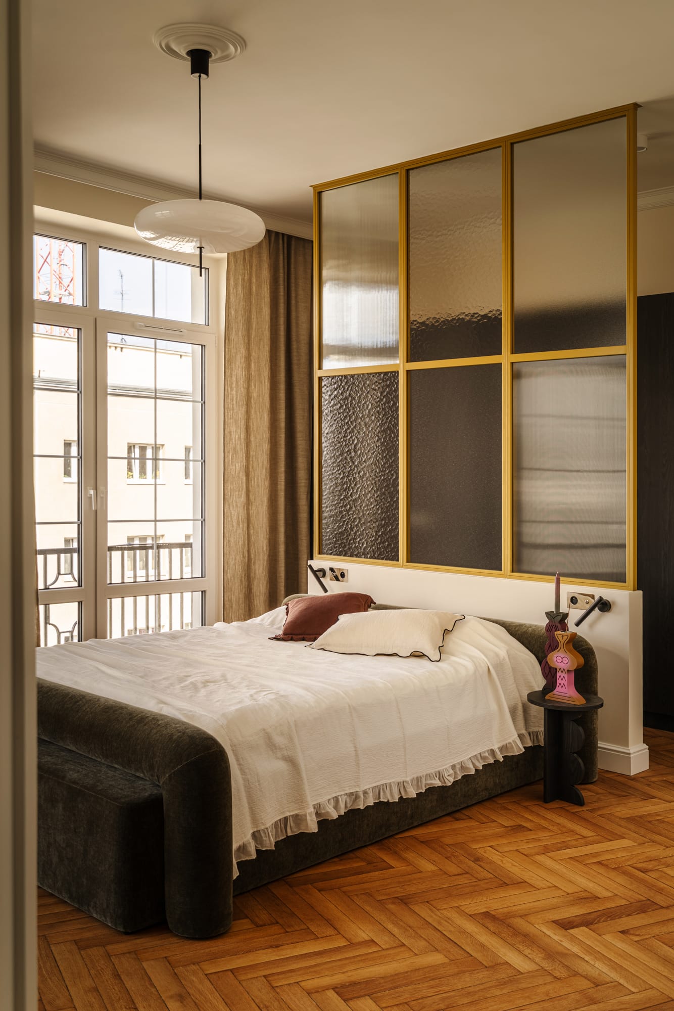 Część prywatna obejmuje sypialnię z półotwartą garderobą oraz dużą łazienką en suite. Wysokość wnętrz – zawrotne 320 cm – pozwoliła zachować proporcje typowe dla architektury lat 30.