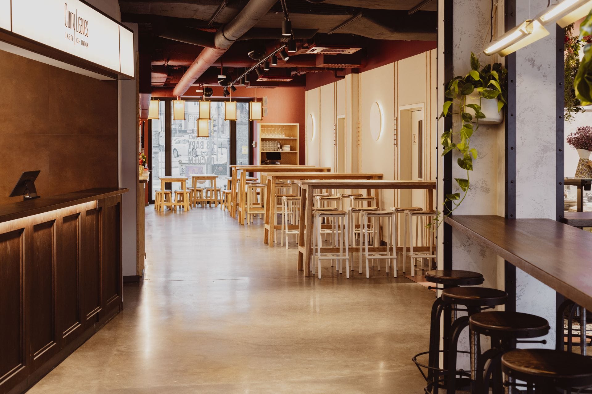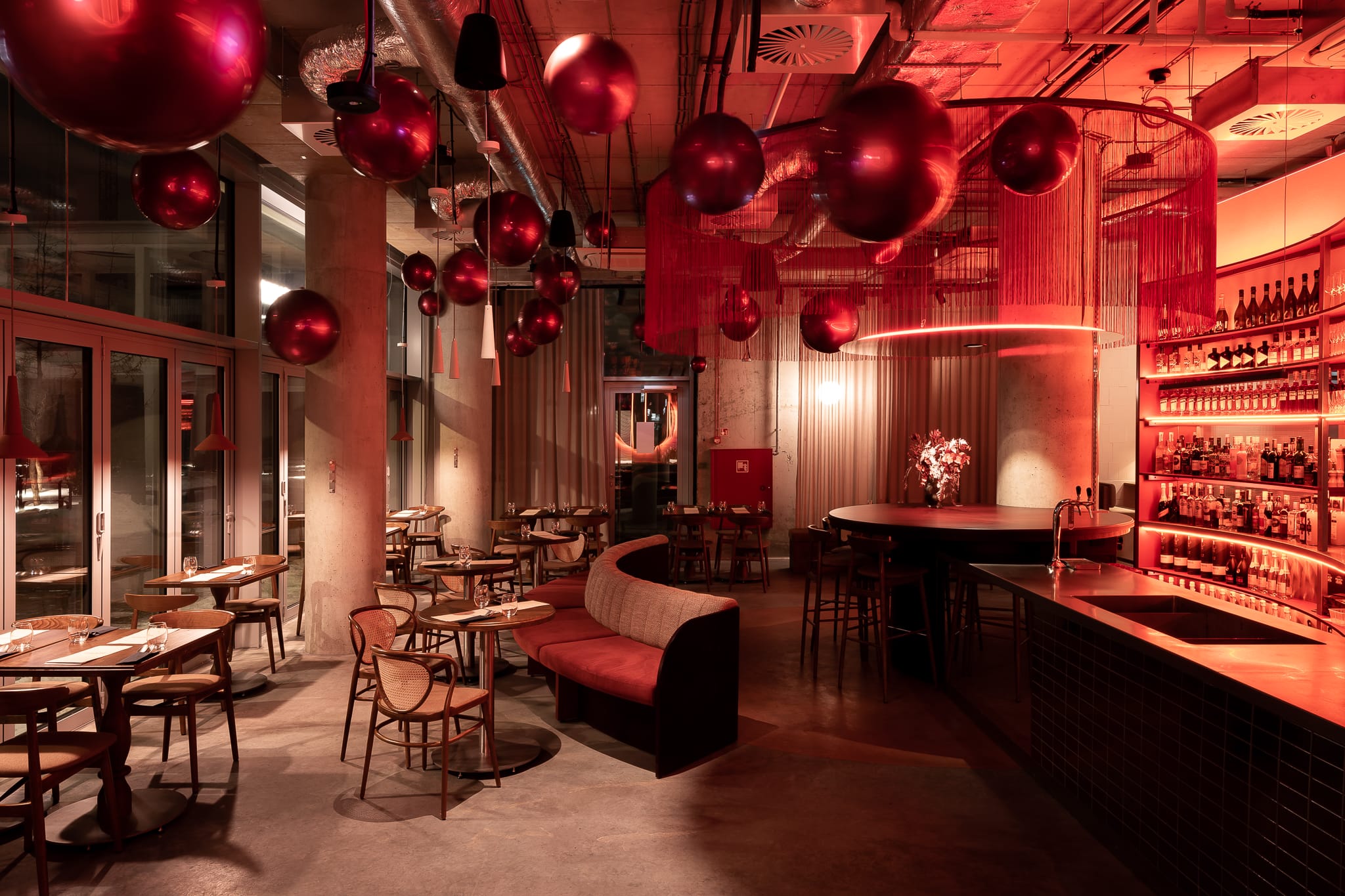 Projekt wnętrza autorstwa CUDO studio opiera się na świadomie budowanych przeciwieństwach. Surowy żelbet zestawiono z eleganckim drewnem, industrialne detale z miękkimi, przytulnymi tkaninami, a formułę self-service z pełną obsługą kelnerską. Materiały i kolorystyka nawiązują do serwowanego menu. W scenariuszu wieczornym pojawia się głębia czerwieni i różu wina, poranki natomiast inspirowane są lekkością i chrupkością wypieków. Tkaniny wprowadzają ciepło i przytulność, a jednocześnie eksponują surową strukturę ścian i kontrastują z eleganckimi detalami stolarki.