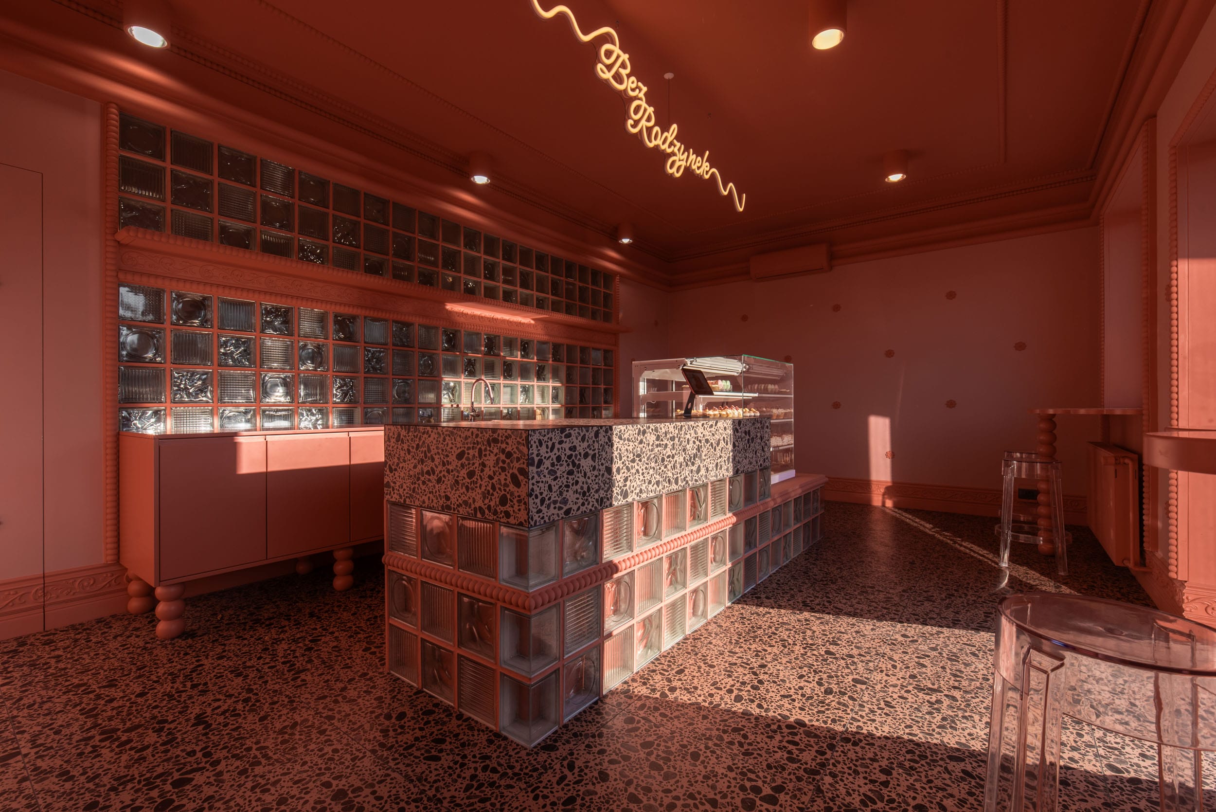 Wnętrze zanurzono w ciepłym odcieniu różu. Na jego tle wyraźnie odcina się długi kontuar z witryną na wypieki, którego podstawa została zbudowana z przezroczystych pustaków szklanych o różnych fakturach, które w świetle dziennym łapią refleksy, zniekształcają obraz i wprowadzają subtelny efekt „galaretki”. Blat kontuaru oraz posadzkę wykończono płytkami o wyrazistym, nieregularnym rysunku, przywodzącym na myśl pokruszoną czekoladę.