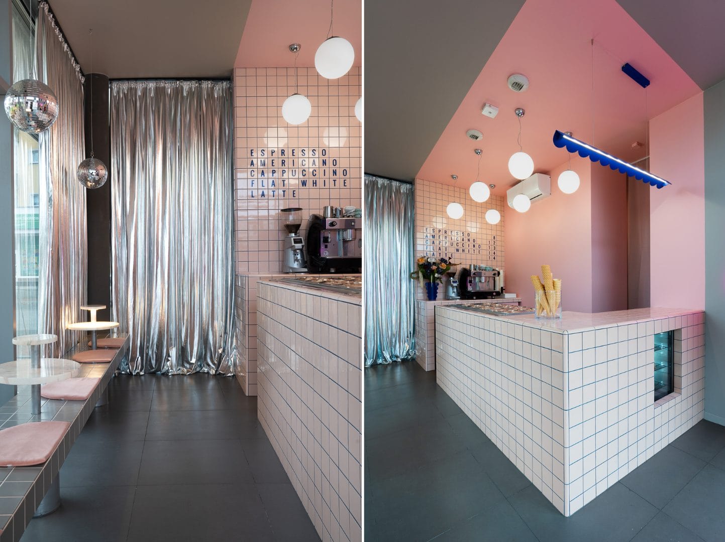 Lokal ma zaledwie 18 m kw., dlatego każdy centymetr starannie zaplanowano. W centrum stanęła lada wykończona płytkami w kolorze lodów truskawkowych, nad którą zawisła kobaltowa lampa Bisquit marki Thoro. Kobalt subtelnie przewija się również w fudze pomiędzy różowymi płytkami oraz w menu kawowym na ścianie.
