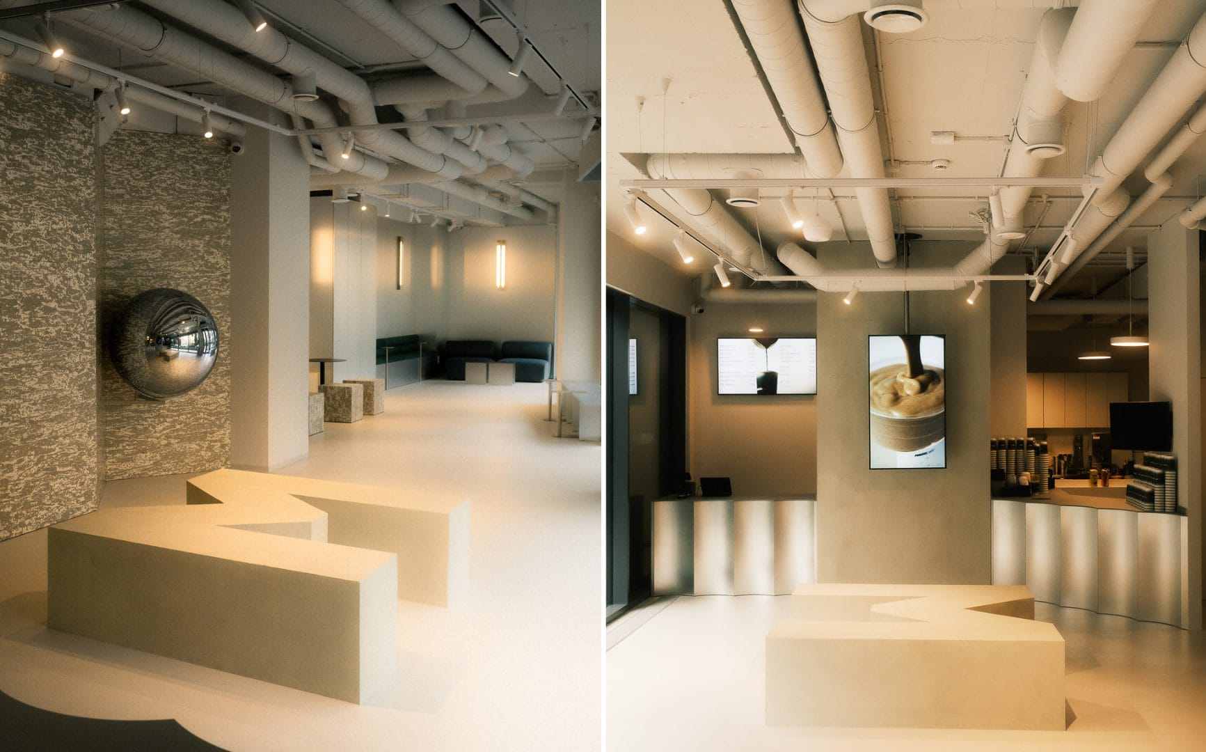 Wnętrze pomyślano jako estetyczne tło dla tej energii – czyste, nowoczesne w formie, oparte na jasnych, neutralnych barwach i miękkim, rozproszonym świetle. Materiały dobrano tak, by podkreślały charakter konceptu – ściany oraz lada kawiarni wykończono jasnym metalem, podłogę pokrywa mikrocement, a ciemna zieleń tapicerki i detali to jedyny, oszczędny akcent kolorystyczny, jednoznacznie kojarzący się z matchą.