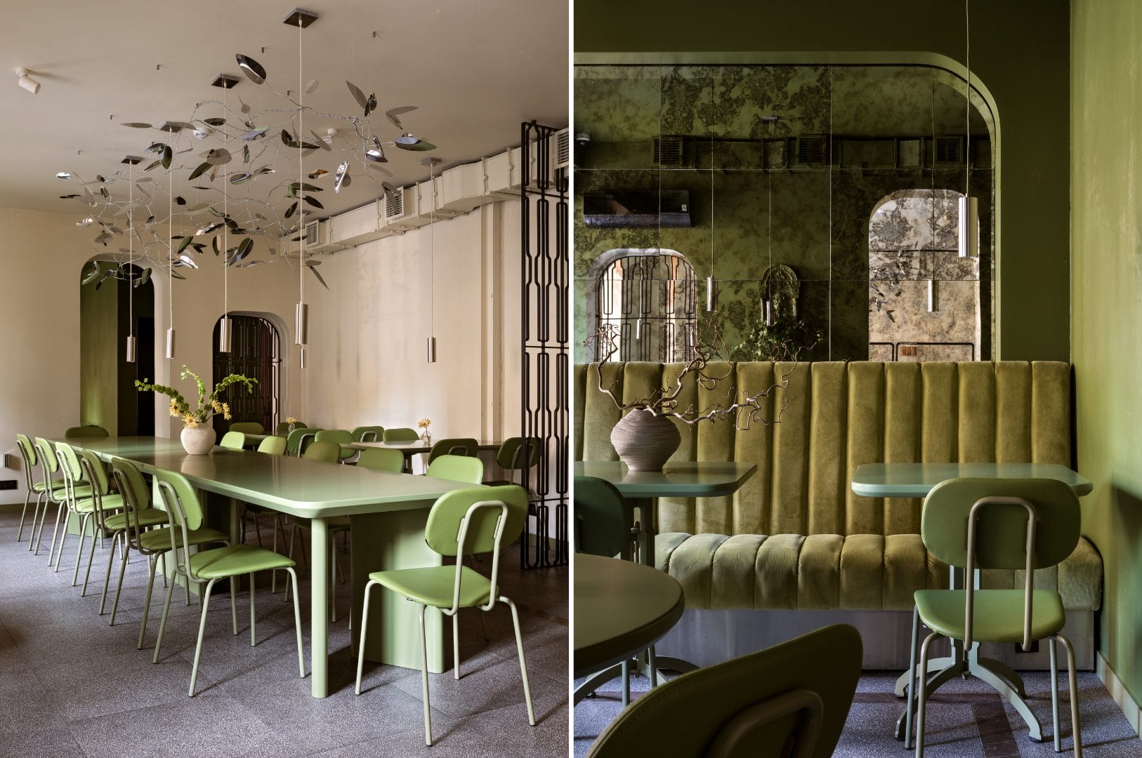 Centralnym punktem aranżacji jest wiekowe drzewo oliwne sprowadzone z Hiszpanii, budujące tożsamość miejsca już od progu. Nad długim, zielonym stołem zawisła autorska instalacja „silver leaves” ze stali nierdzewnej. Jej chłodna, metaliczna forma stanowi świadomy kontrast dla miękkiej, organicznej narracji całego wnętrza.