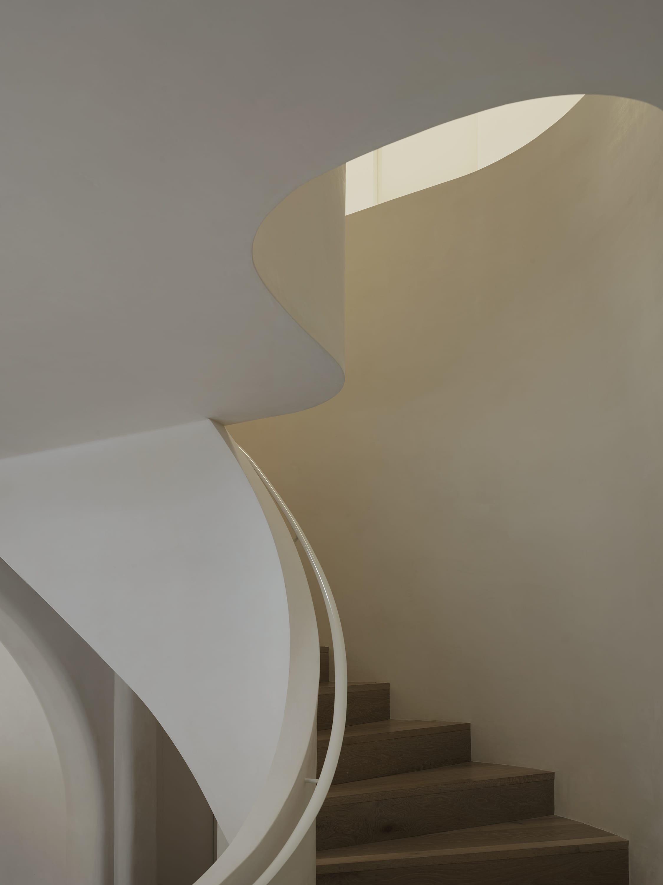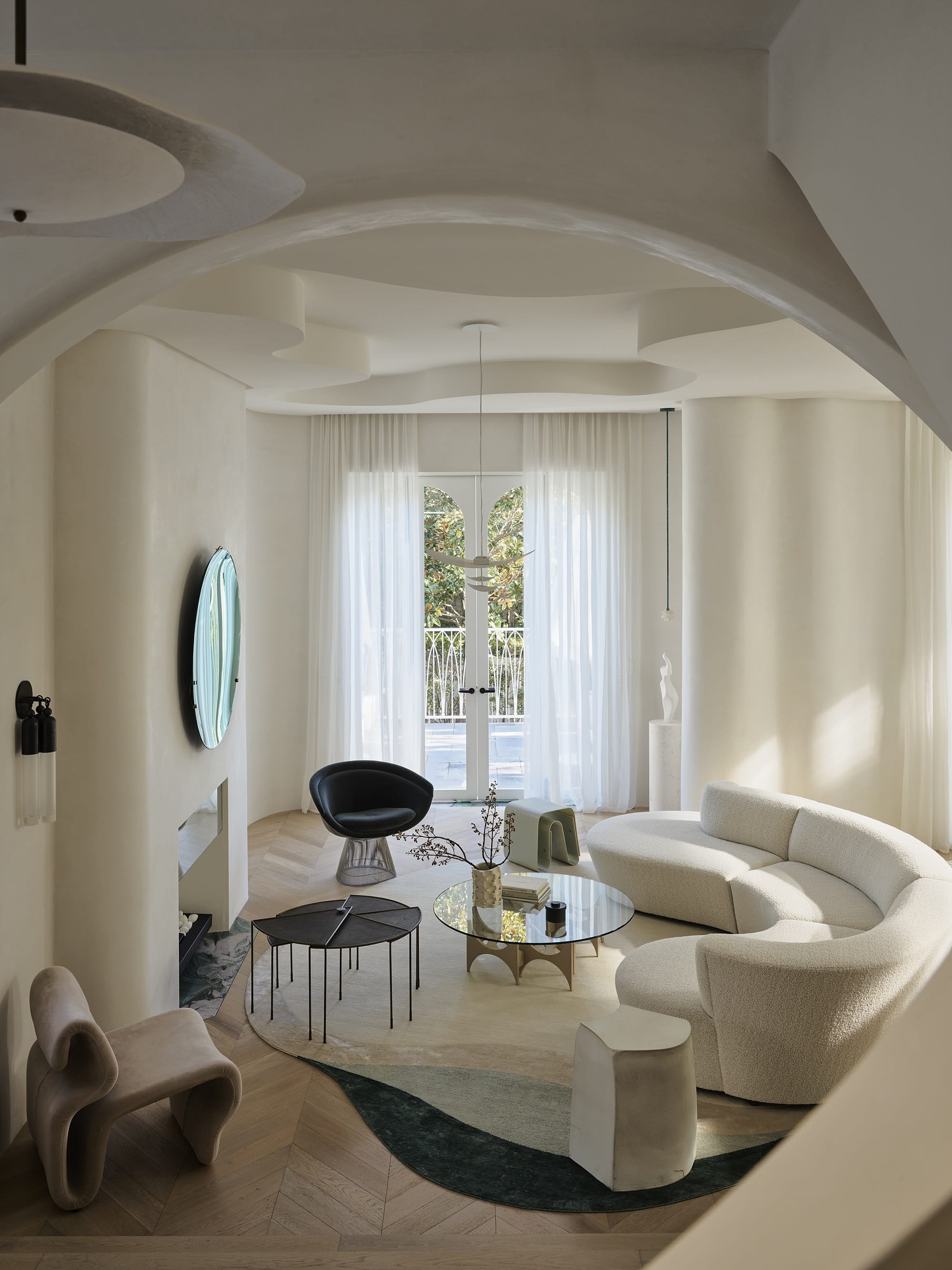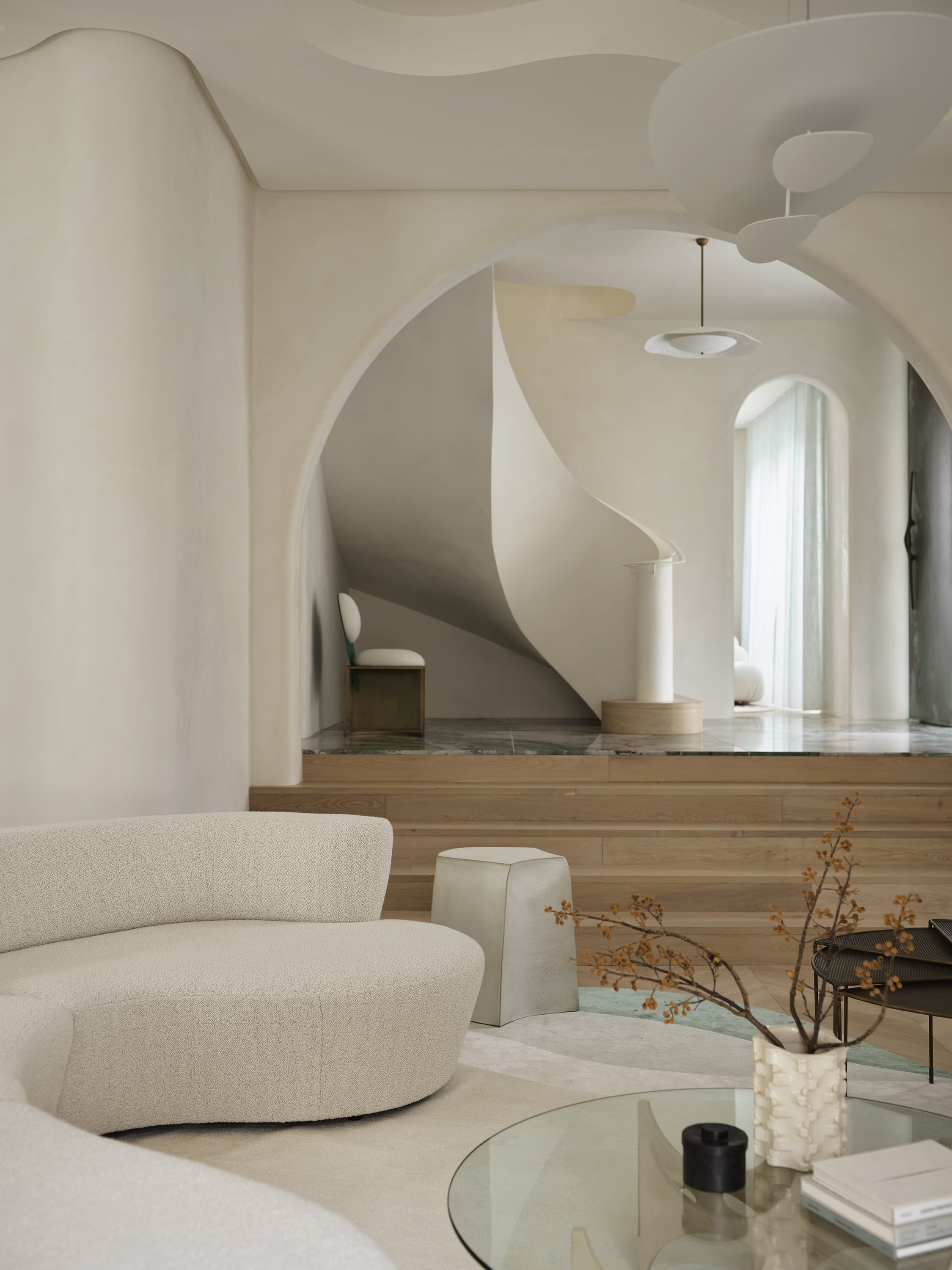 – Zależało mi, aby miękkie linie fasady znalazły swoje odbicie we wnętrzach. Chciałem też stworzyć poczucie płynnego ruchu między pomieszczeniami, nawiązując do greckiej architektury Cyklad, w której jedna krzywizna łagodnie przechodzi w następną – wyjaśnia architekt Greg Natale.
