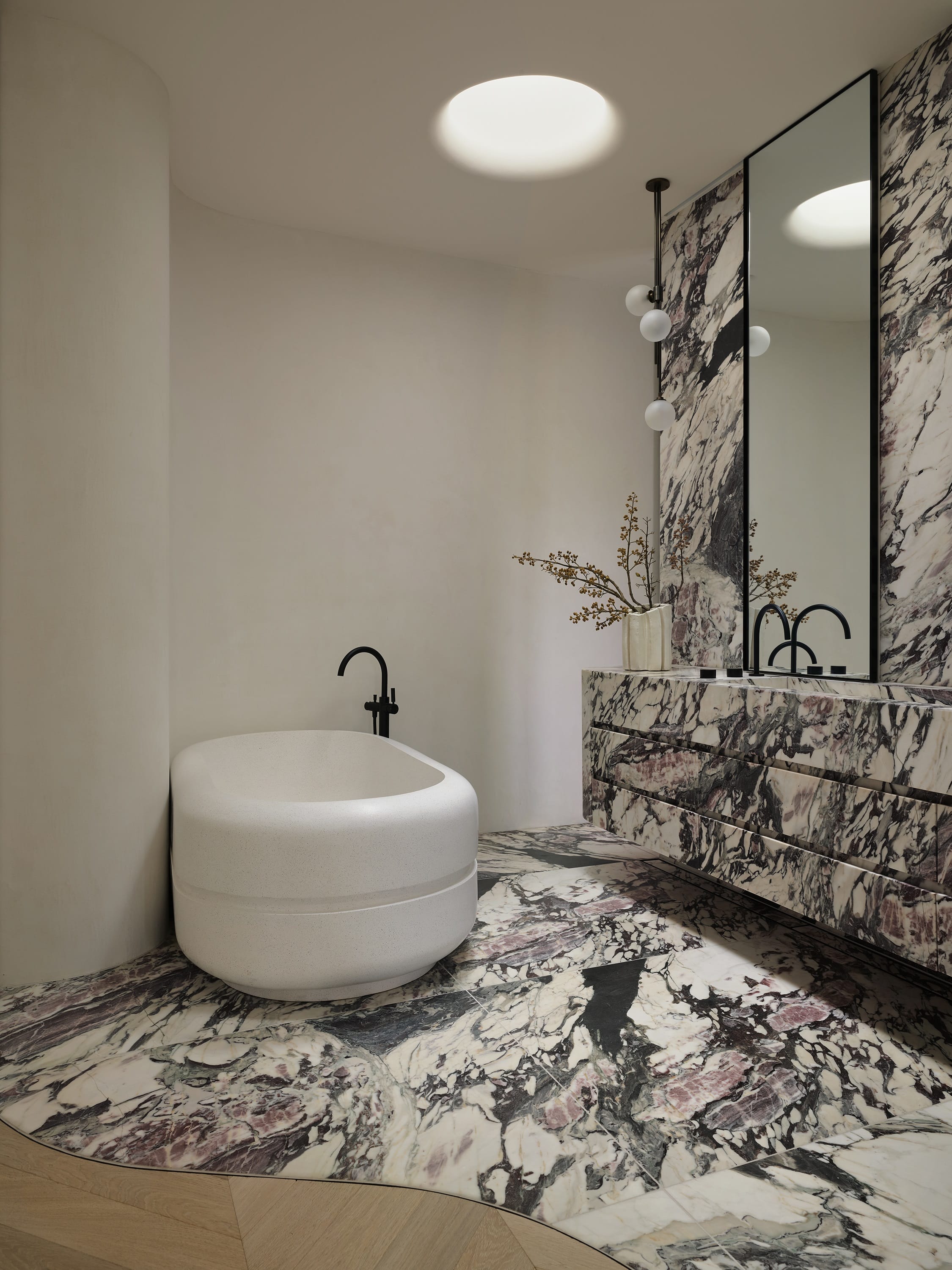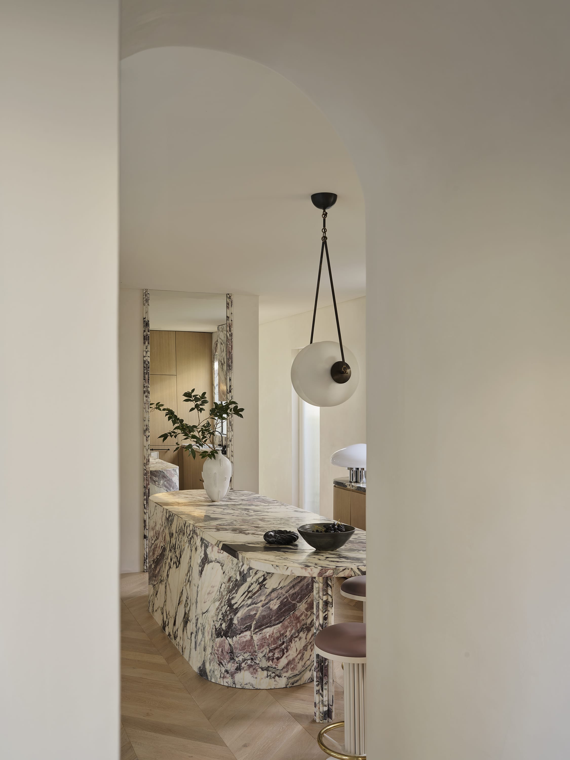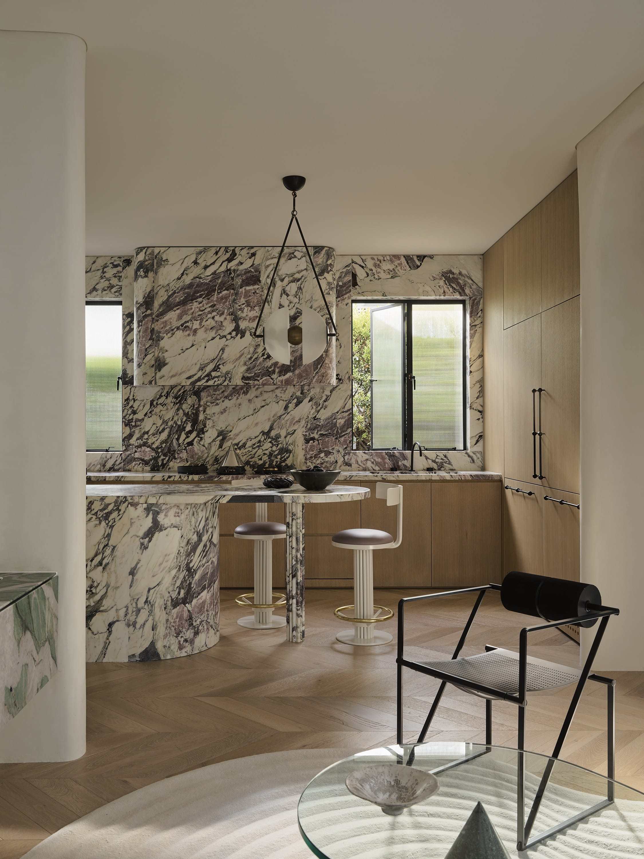– Zależało mi, aby miękkie linie fasady znalazły swoje odbicie we wnętrzach. Chciałem też stworzyć poczucie płynnego ruchu między pomieszczeniami, nawiązując do greckiej architektury Cyklad, w której jedna krzywizna łagodnie przechodzi w następną – wyjaśnia architekt Greg Natale.