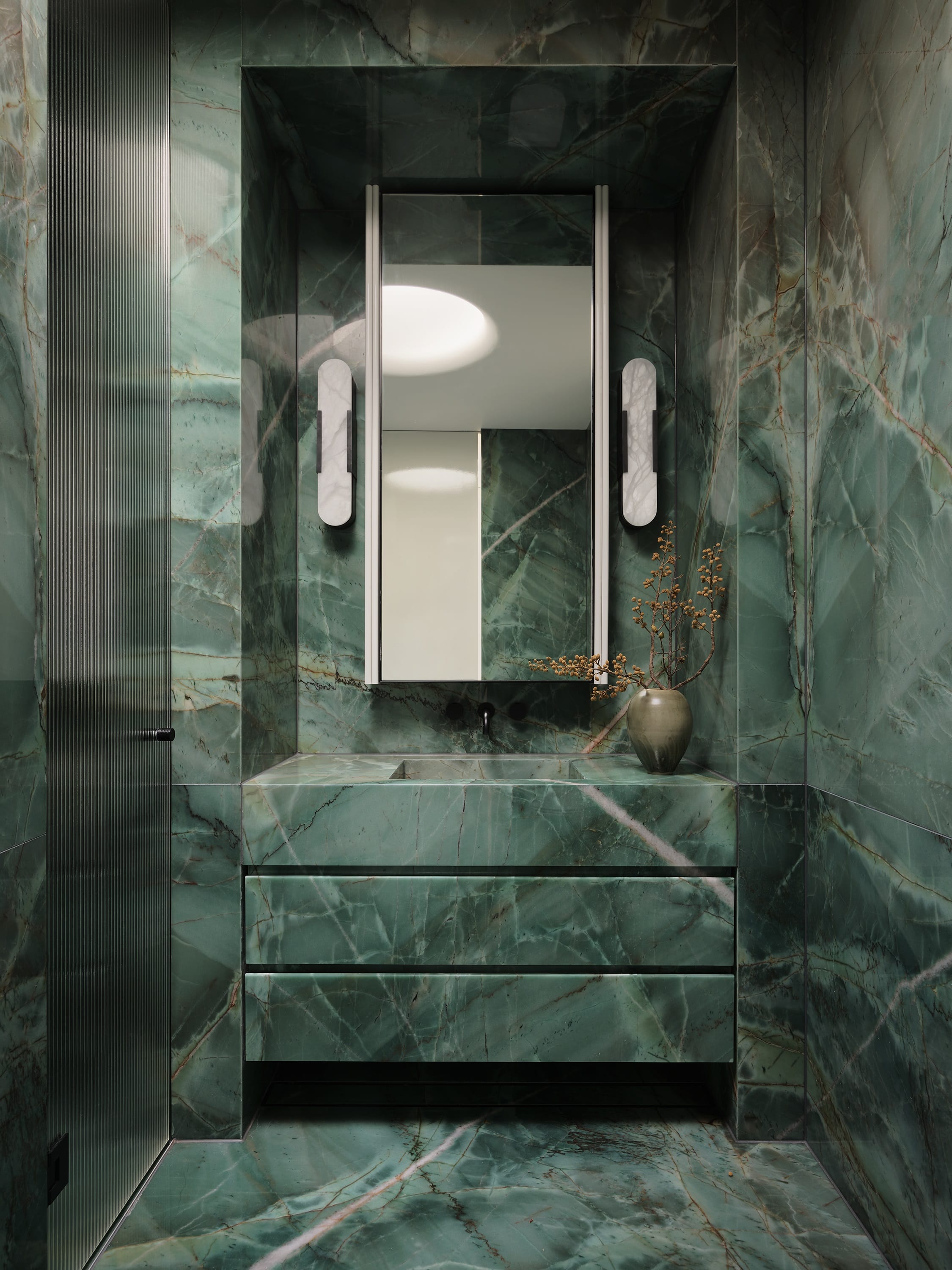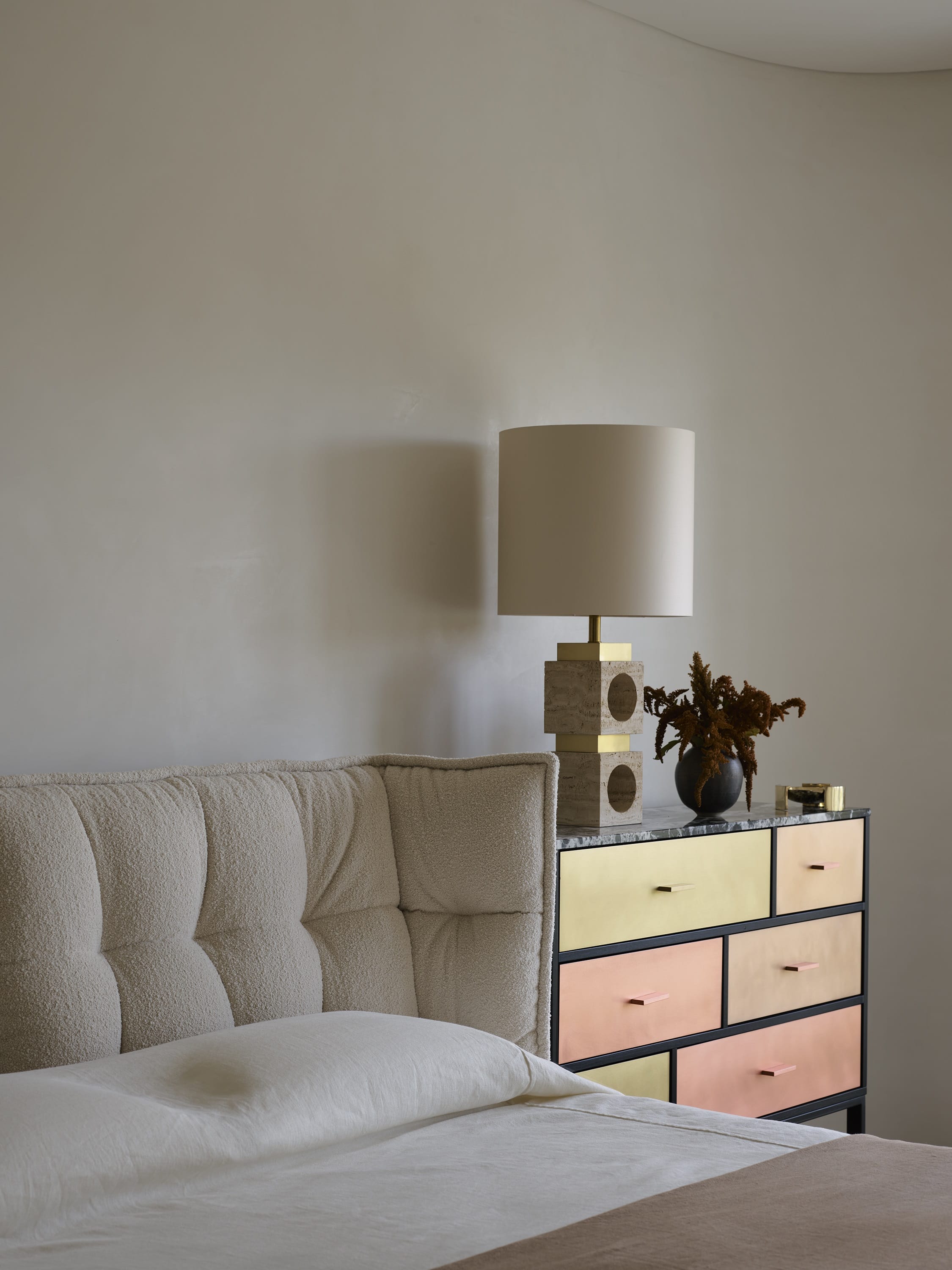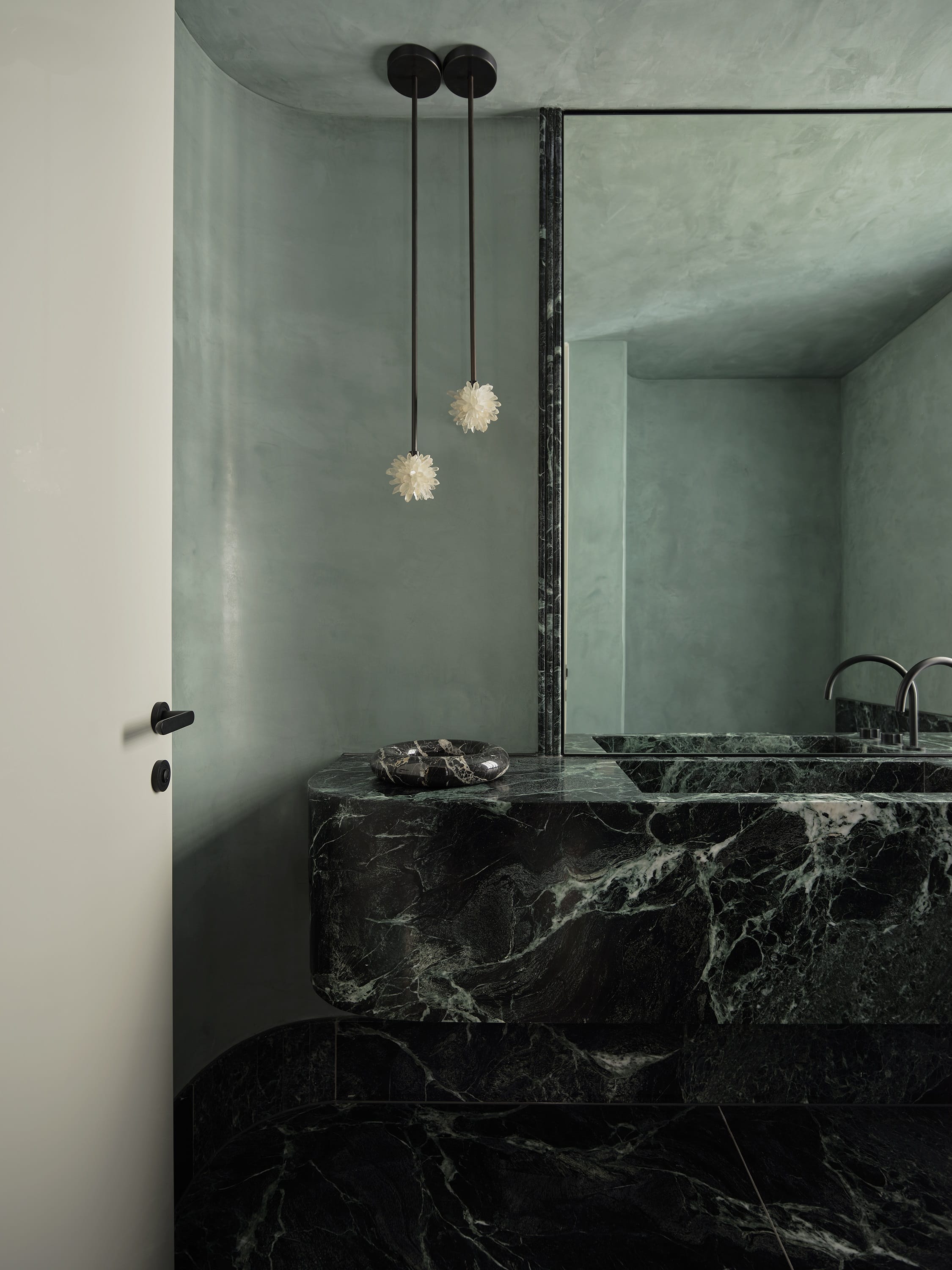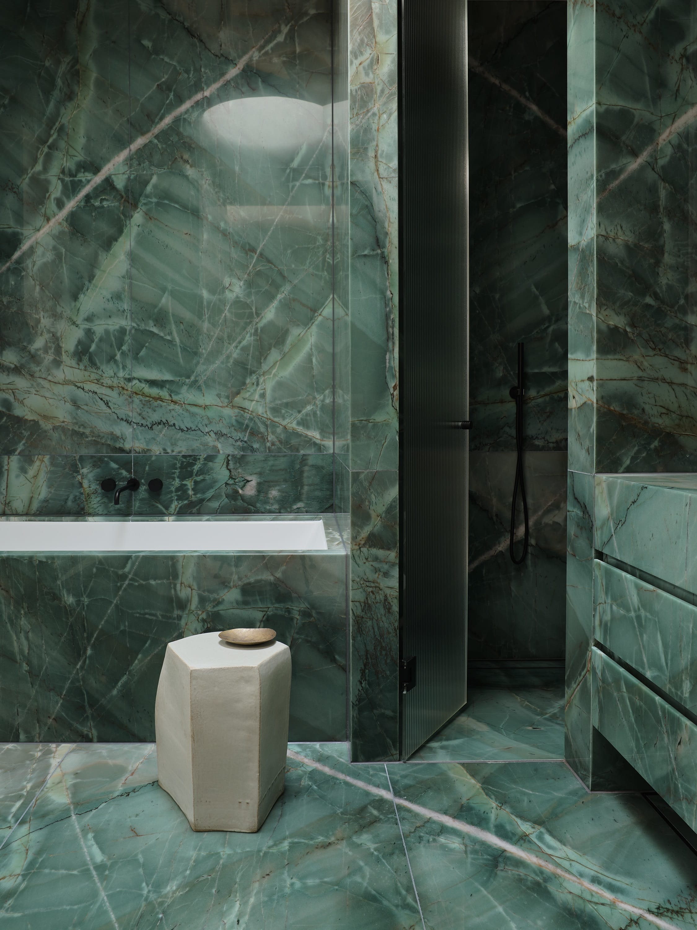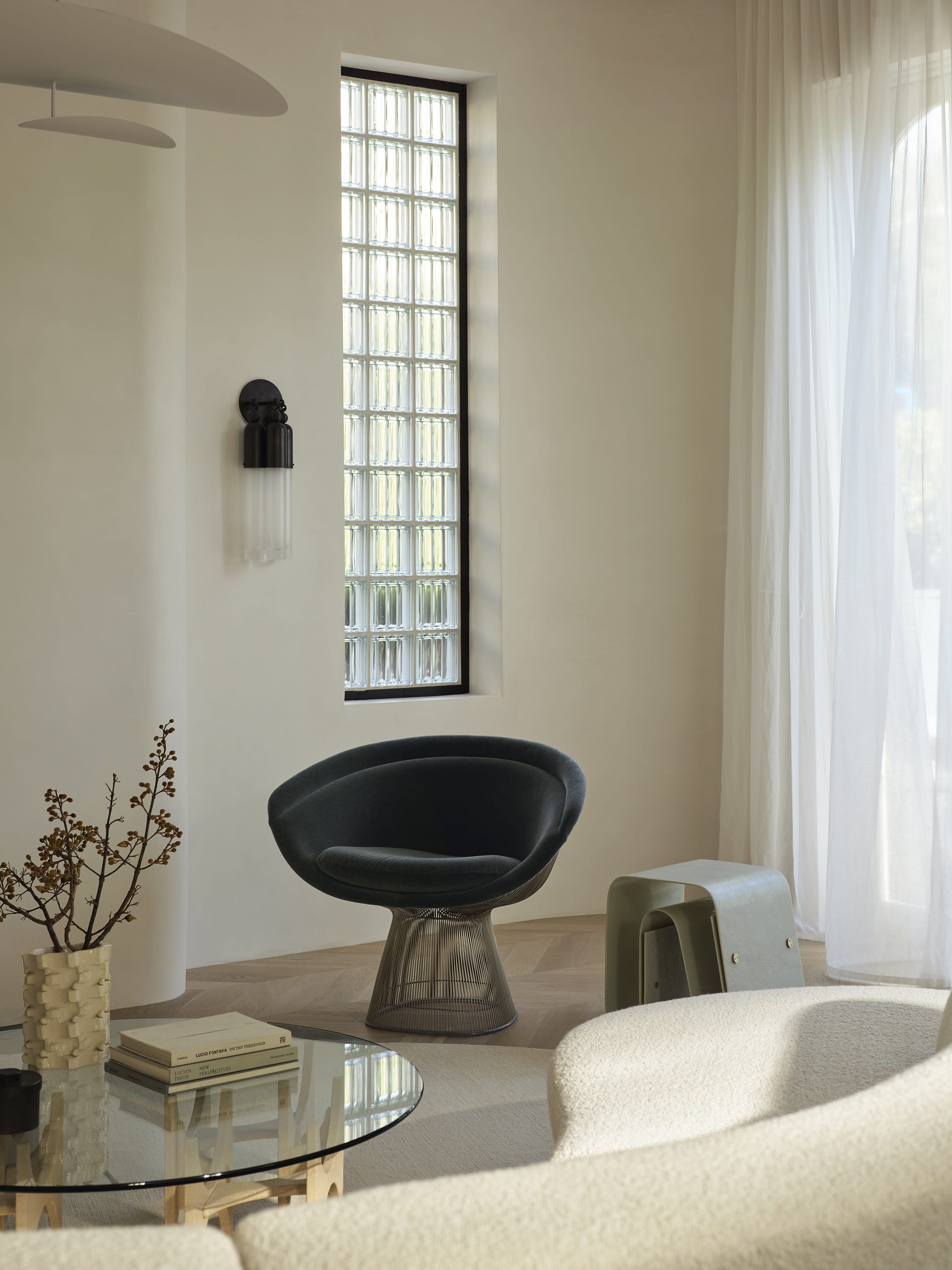 W salonie z architektonicznym rozfalowaniem komponuje się sofa Vladimira Kagana, obita kremową tkaniną bouclé. Dywan na zamówienie nawiązuje kolorystycznie do kominka z kwarcytu Patagonia Verde. Lampy Masai marki Icone wiszą jak chmurki nad szklanym stołem jadalnianym, a metaliczne stoliki nocne w sypialni dodają wnętrzu delikatnego blasku. – Nazywam to europejskim minimalizmem – puentuje swoją eklektyczną stylistykę Greg Natale.