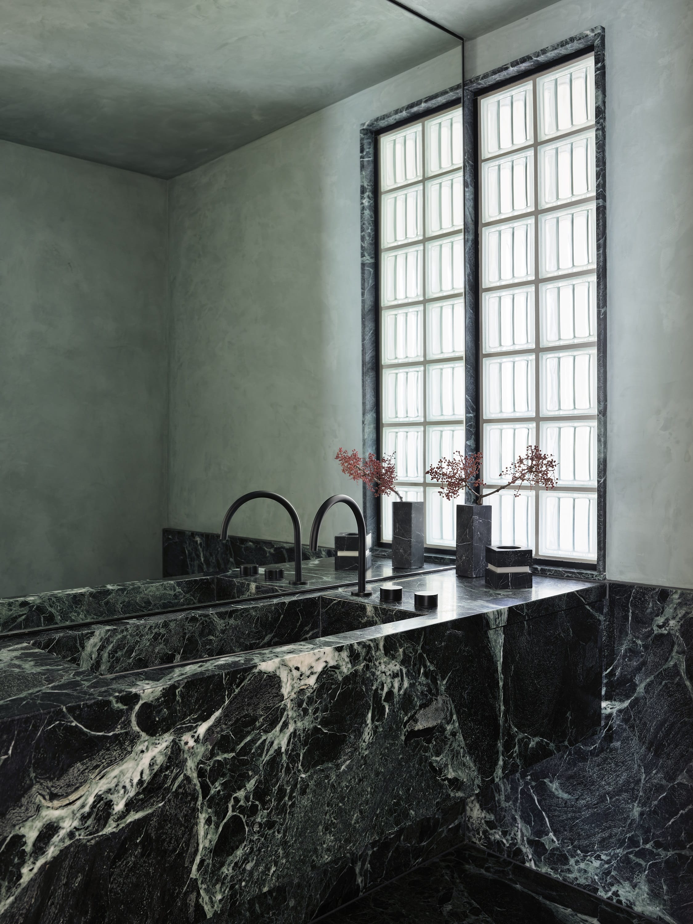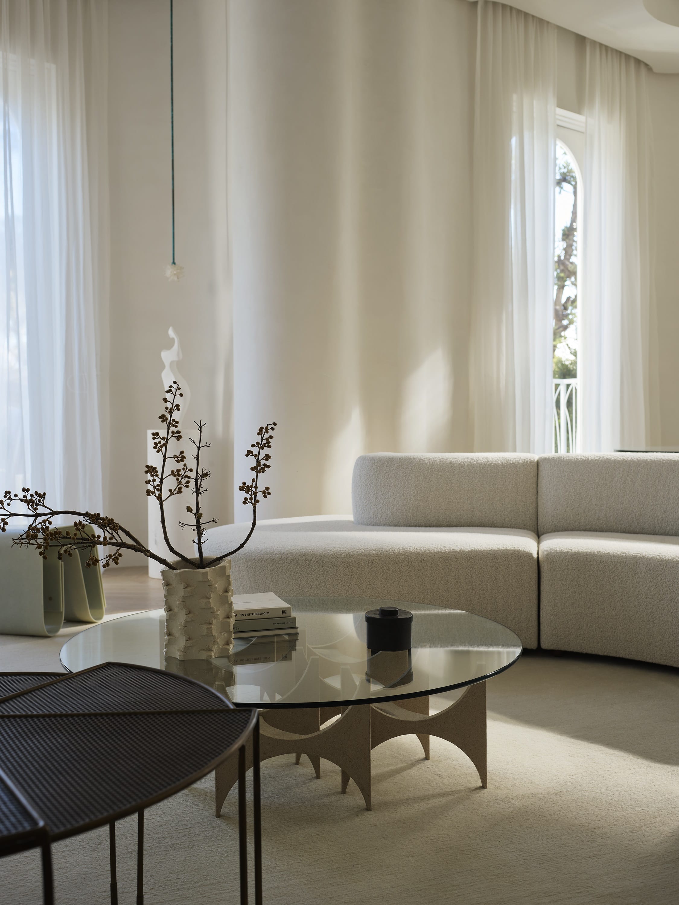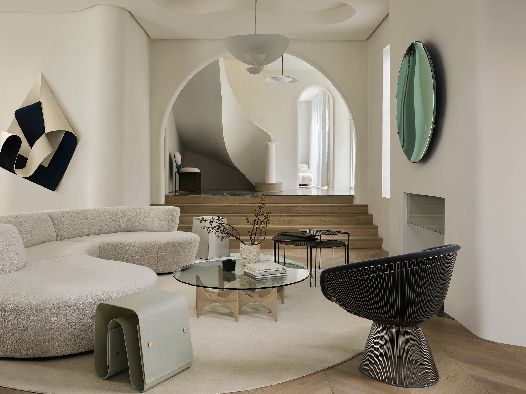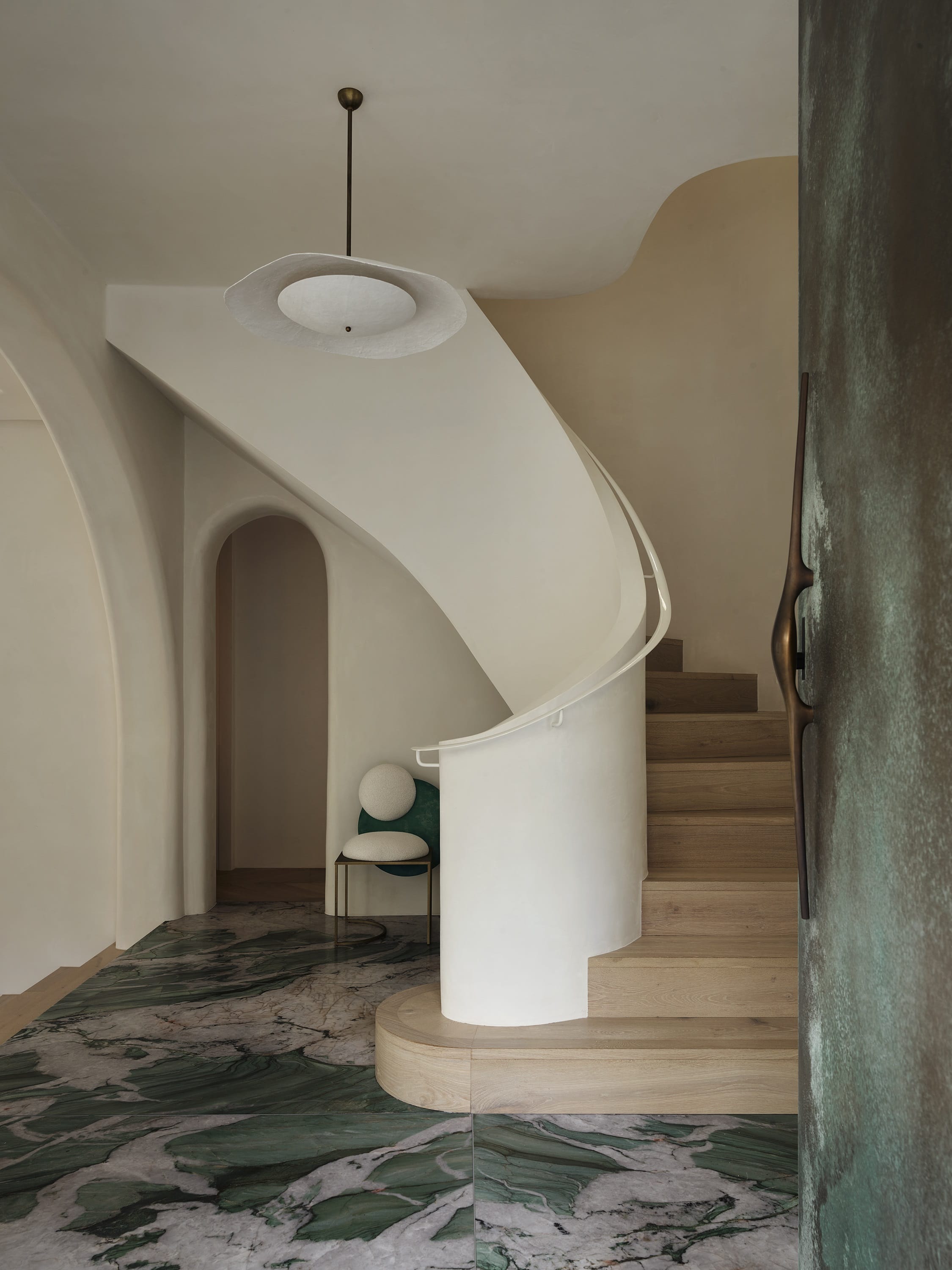W miejsce nieco przestarzałych wnętrz pojawił się miękki, zmysłowy dom – nowoczesna wariacja na temat tradycyjnej cykladzkiej architektury. Możliwość cofnięcia się i rozpoczęcia projektu od nowa miała dla architekta niemal rytualny wymiar – była symbolicznym odzwierciedleniem jego twórczej ewolucji. Płynność linii zaczyna się już w holu wejściowym, gdzie spektakularnie wijące się schody kontrastują z posadzką z kwarcytu Patagonia Verde.