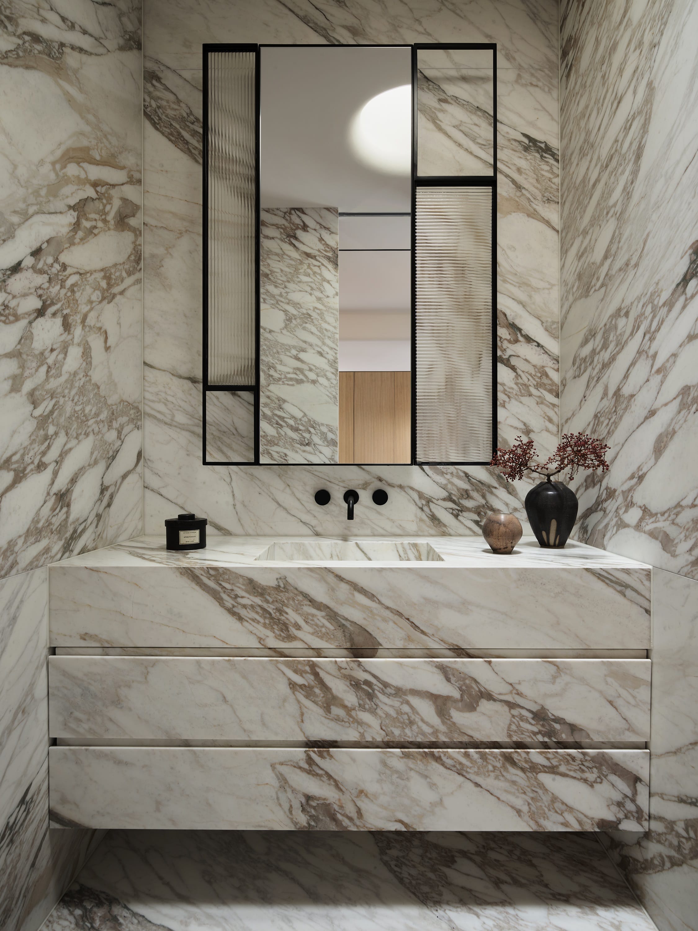 Zachwyt malarską fakturą naturalnego kamienia to jeden z motywów przewodnich tego wnętrza – widać to także w kuchni, gdzie dla odmiany znajdziemy marmur Breccia Capraia z wyrafinowanym fioletowym użyleniem. Falująca ściana w holu płynnie przechodzi aż do jadalni, a wrażenie płynności wzmacniają łagodne łuki sufitów.
