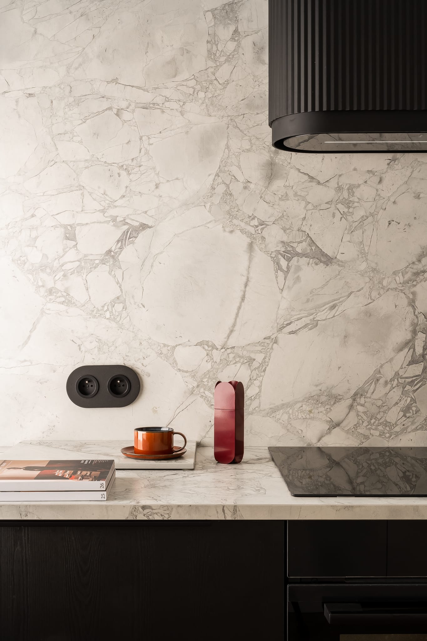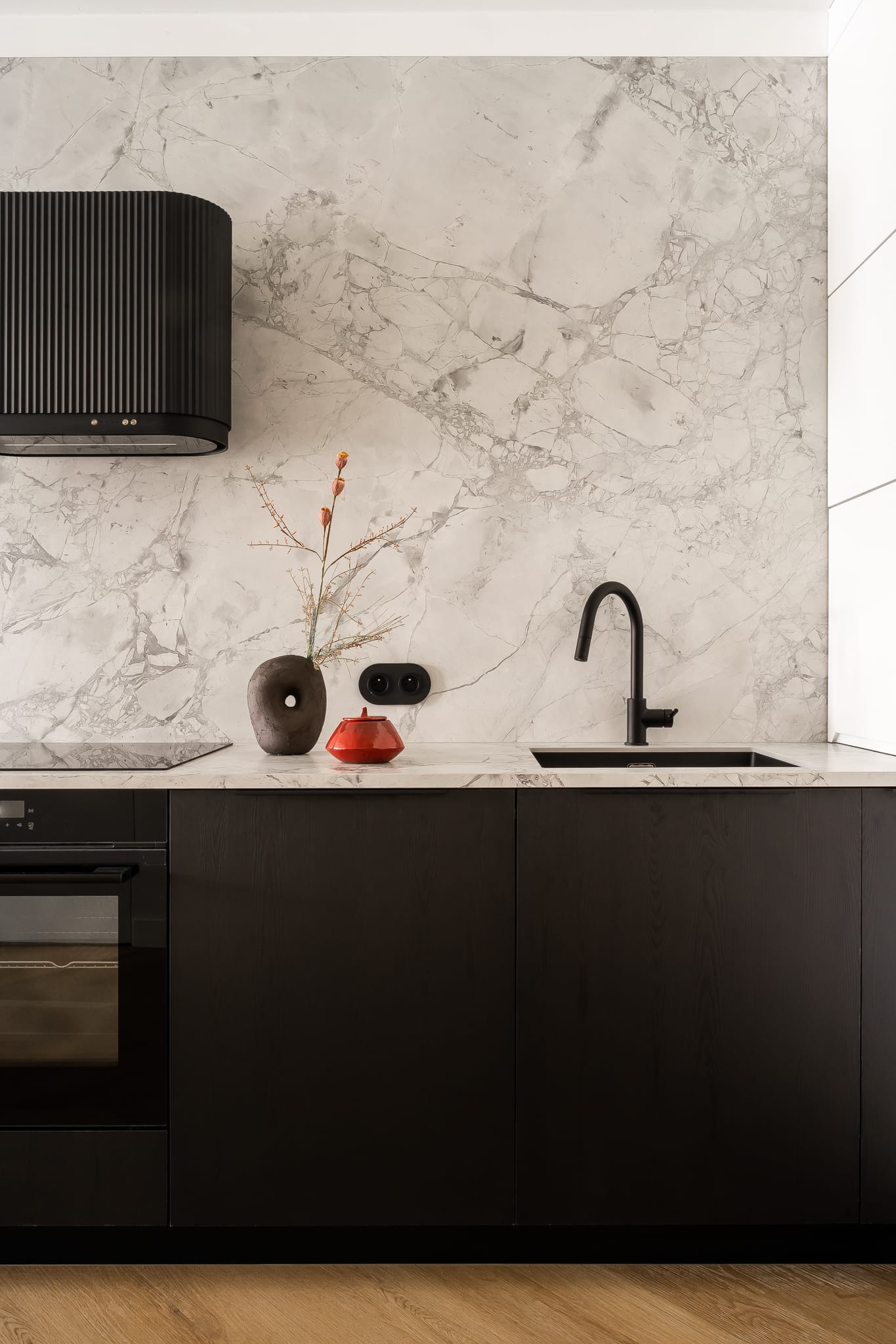 W kuchni zrezygnowano z górnych szafek, aby spotęgować wrażenie przestronności. Surowe połączenie ciemnego drewna i kamienia o wyrazistym rysunku równoważy miękka forma kanapy i obecność dużego lustra, które dodatkowo rozświetla i „otwiera” przestrzeń.