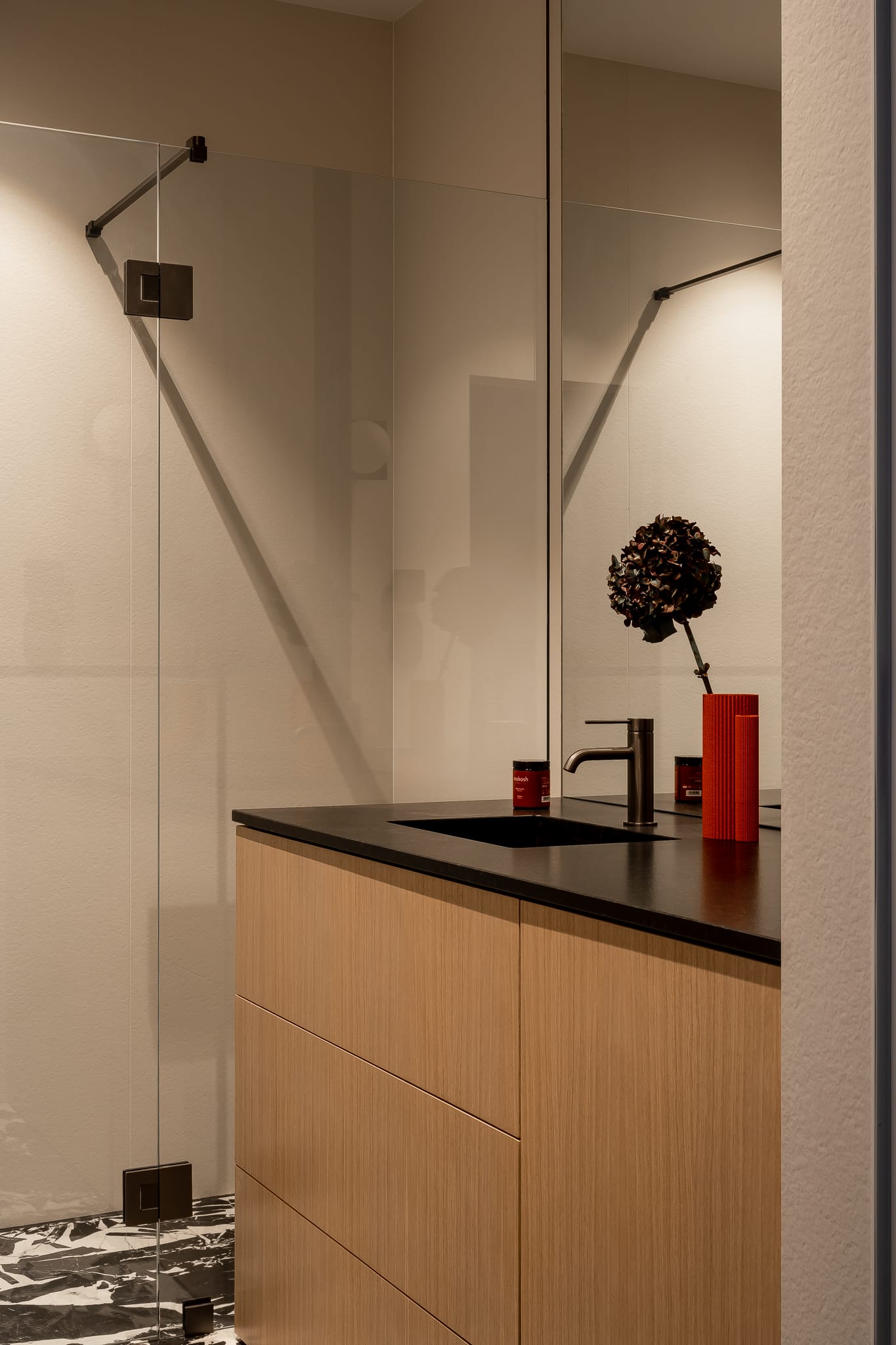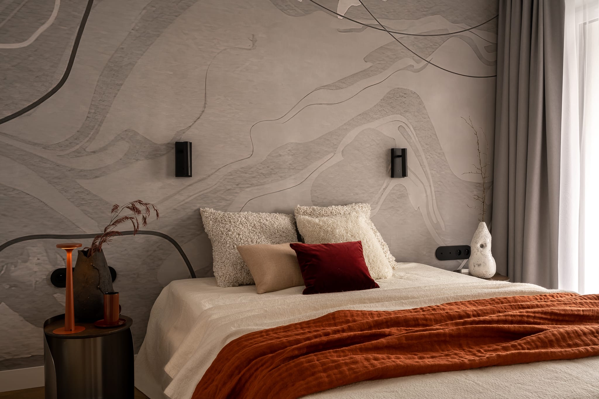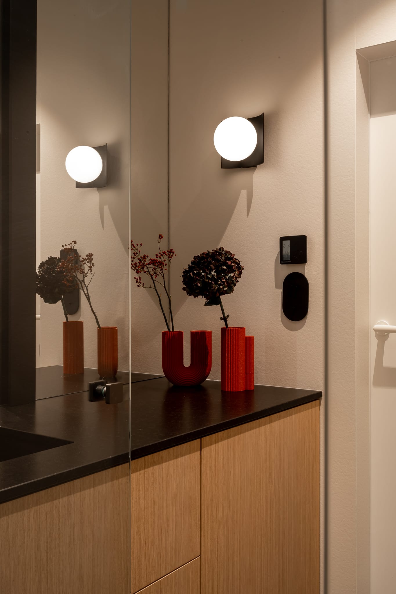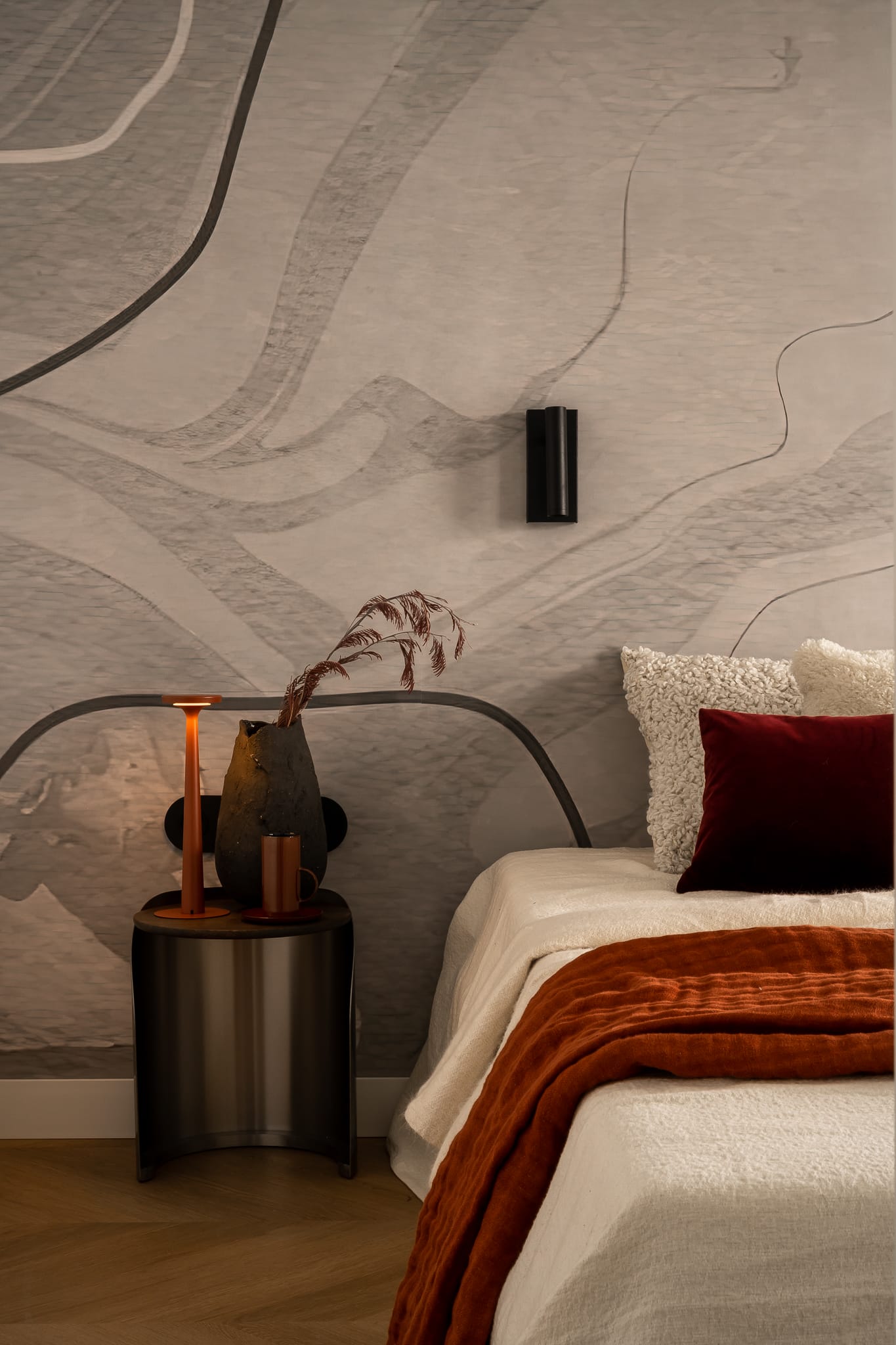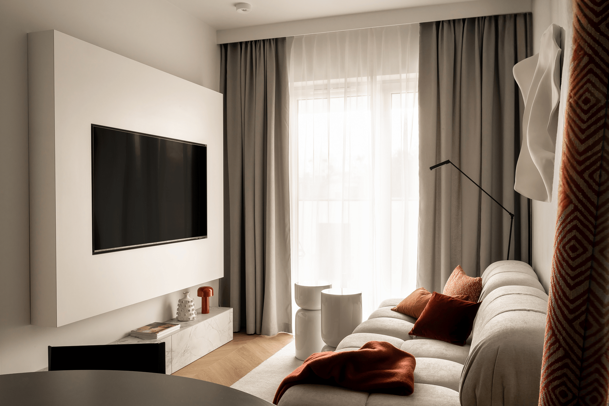 – Detale są tu istotne, ale nie dominujące – zauważa Karolina Holda. Oprócz wspominanego lustra, będącego autorskim projektem Holda Studio, w mieszkaniu pojawia się również ceramika Lui&Clay oraz przestrzenne obrazy Izabeli Starzyk. Rude akcenty, precyzyjnie rozlokowane w całym mieszkaniu, przełamują stonowaną kolorystykę i ocieplają wnętrze.