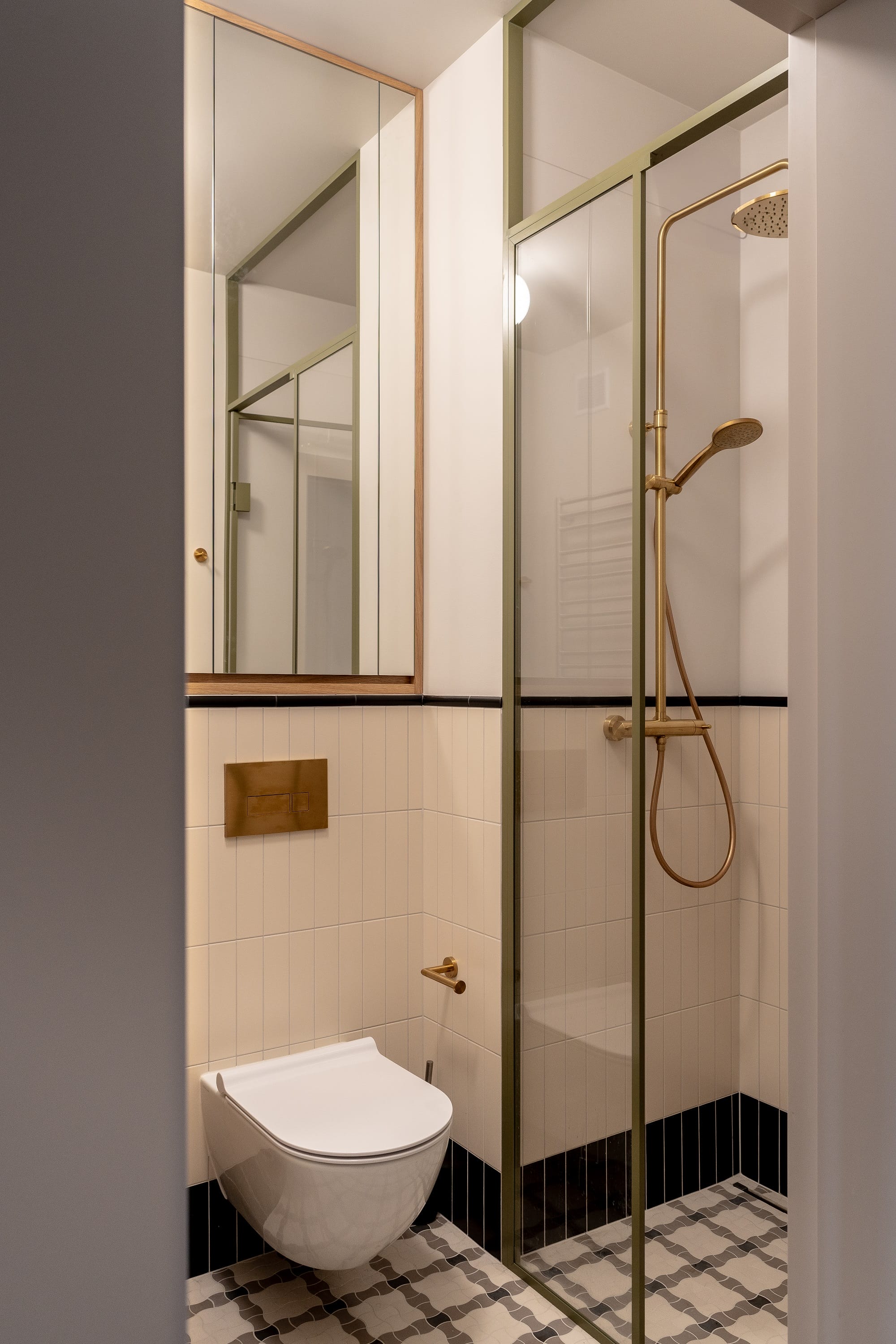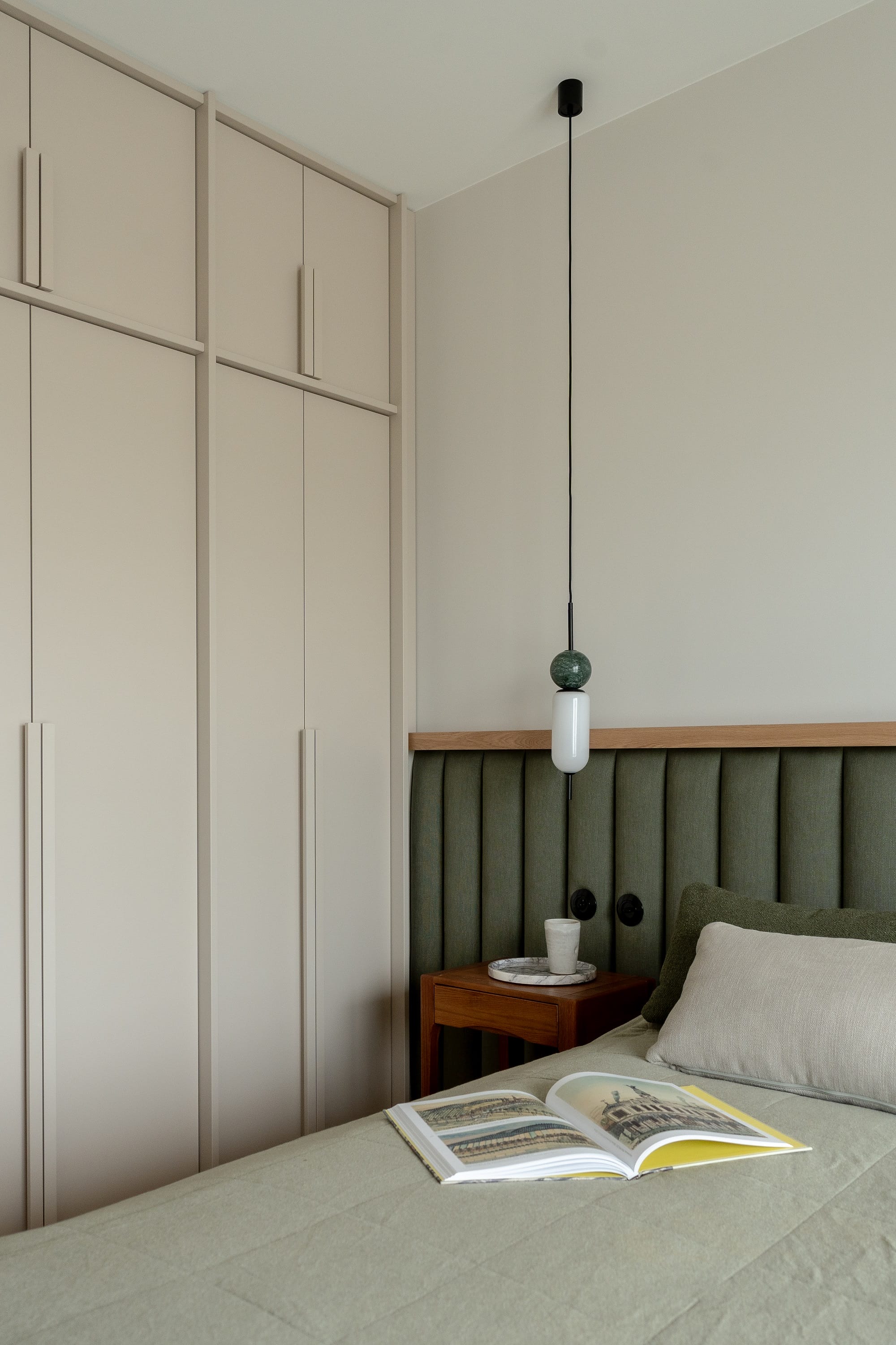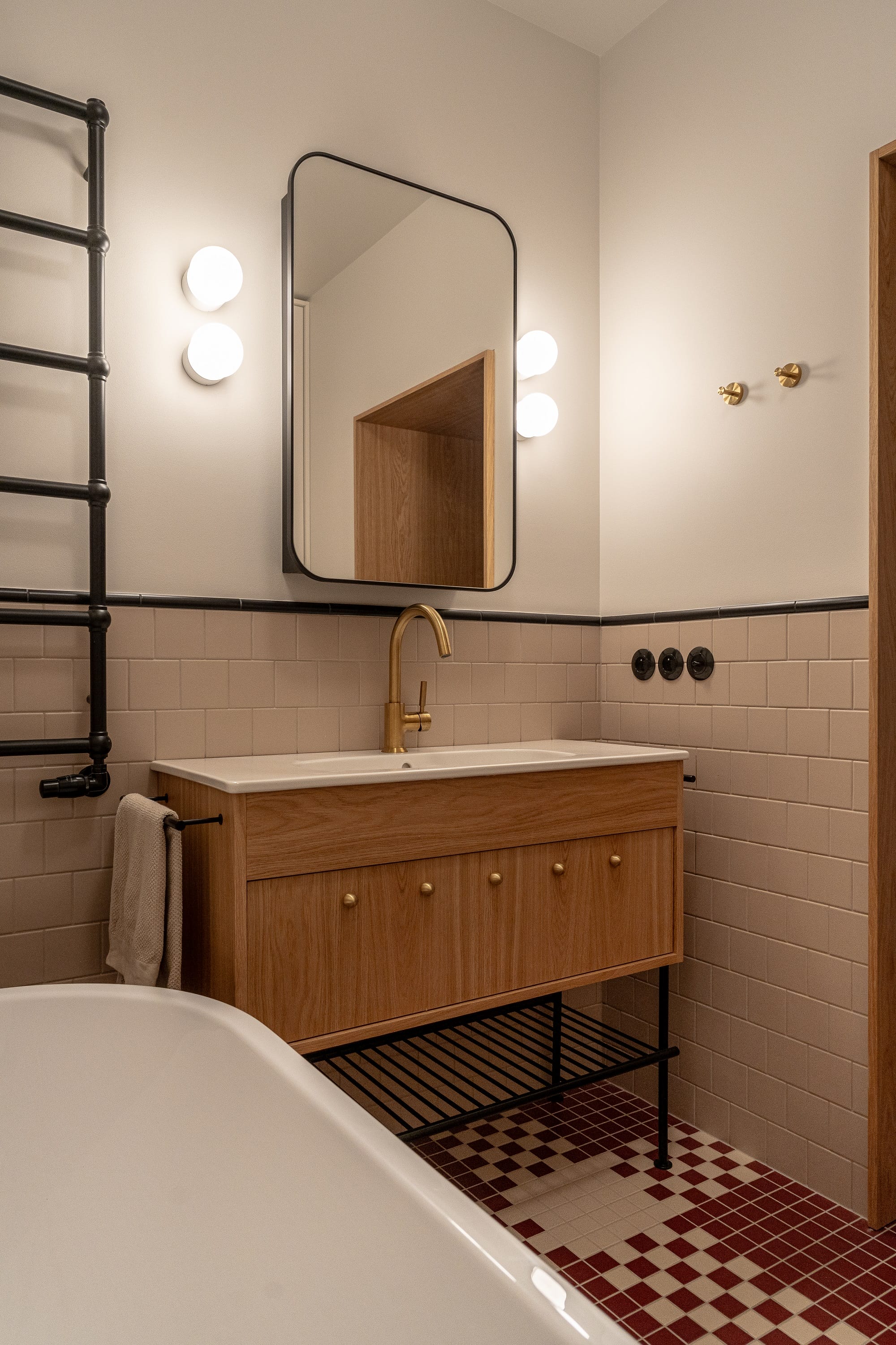 Wszystko tutaj nie jest na chwilę. W łazienkach klasyczne tło tworzą modernistyczne gorseciki (współczesne, ale idealnie odwzorowujące te z lat 30.), czeczotowe okładziny na meblach i drobne detale – grzejnik ze spawanych rurek czy bakelitowe włączniki. W sypialni z kolei fantastycznie zagrało nietypowe wezgłowie tapicerowane naturalnym lnem. Zostało zaprojektowane z myślą o tym wnętrzu i odgrywa w nim nie tylko praktyczną, ale i dekoracyjną rolę, ozdabiając ścianę miękką strukturą.