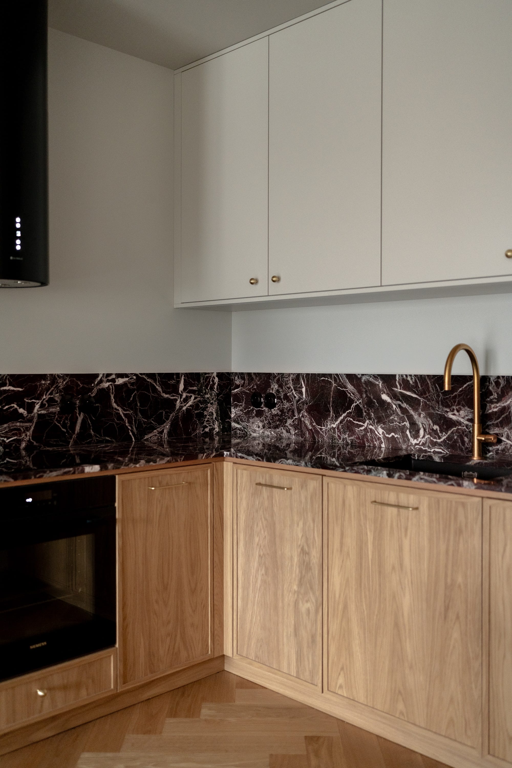 Klienci dużą wagę przywiązywali do materiałów wykończeniowych. Zależało im, żeby były wysokiej jakości i ponadczasowe, ładnie się starzały, nabierając z czasem szlachetnej patyny, i dobrze komponowały z wysublimowaną kolorystyką. A ta nie jest tutaj na sezon czy dwa – winne bordo, zielenie i spokojne beże przełamane akcentami czerni i złota to ponadczasowa baza, która nie daje się efemerycznym modom.