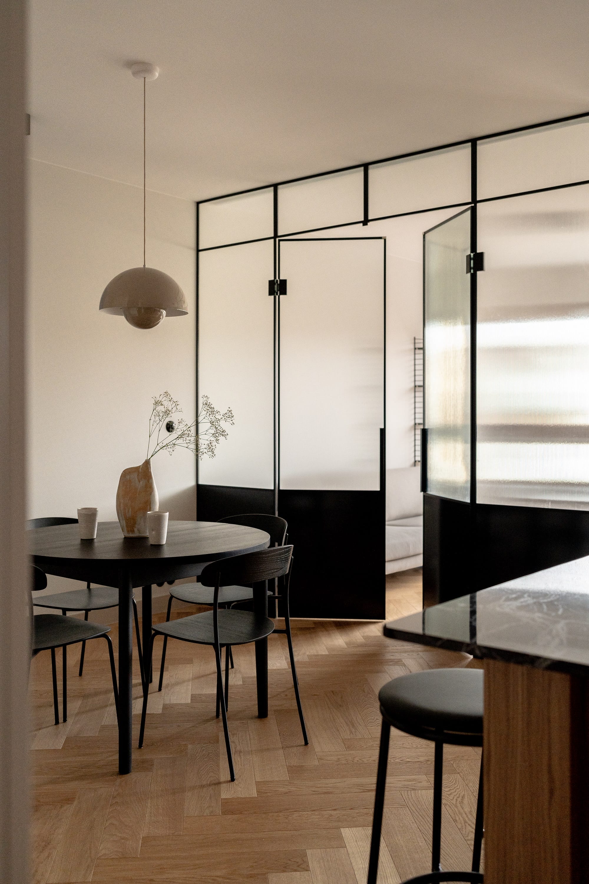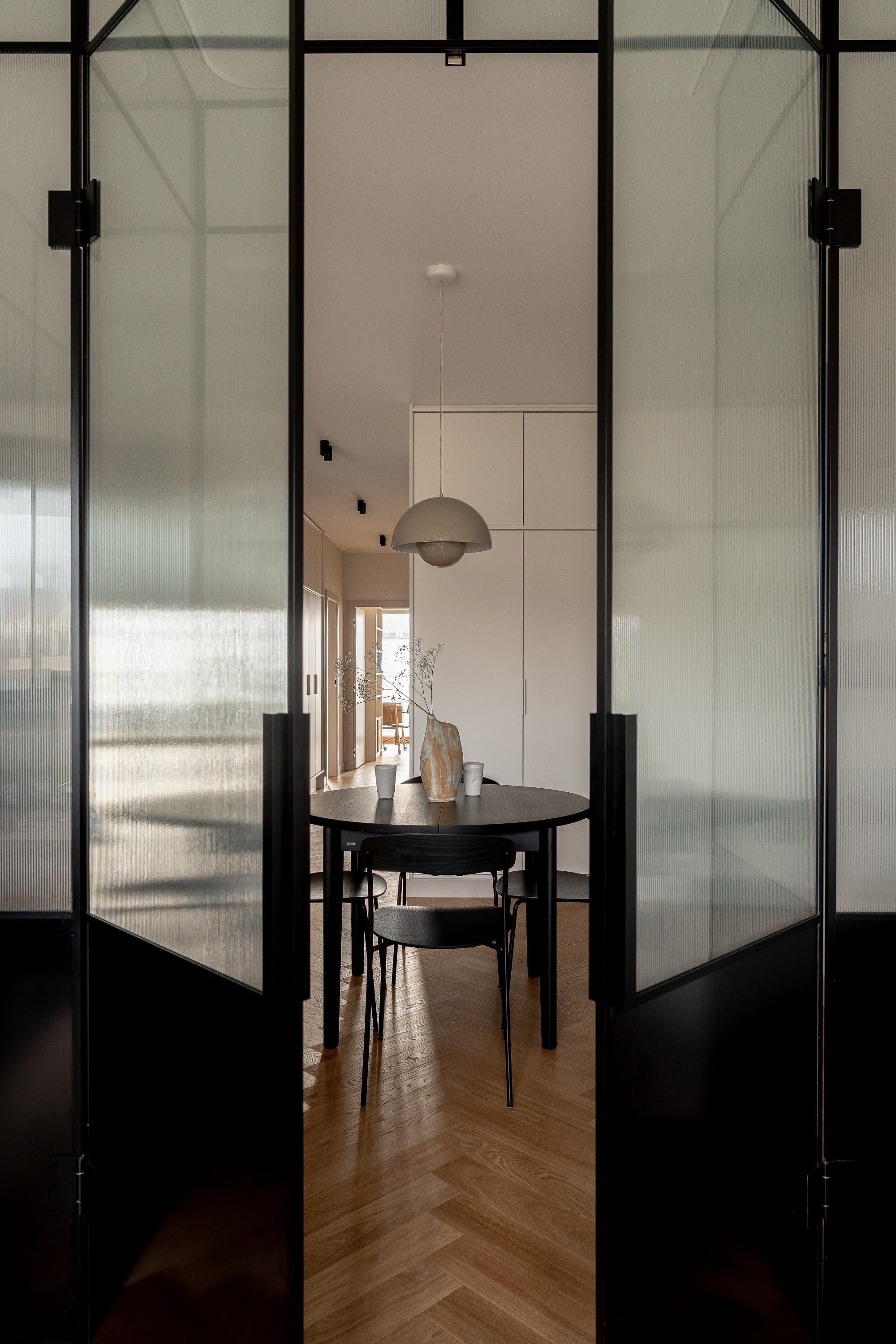 Całkiem spora, bo ponad stumetrowa przestrzeń aż się prosiła, żeby podzielić ją na część wspólną, w której będą mogli przebywać razem i gościć znajomych, oraz prywatną – z łazienką master, garderobą i pokojem córki. I tak w dużym salonie spotkało się kilka funkcji: otwarta kuchnia, jadalnia i strefa livingu. Na życzenie klientów udało się nawet wydzielić osobny pokój do pracy. Układ okien pozwolił za lekką ścianą ze stali i szkła zaprojektować niewielki gabinet. W razie potrzeby może on pełnić funkcję pokoju gościnnego, bo strukturalne szklane tafle są nieprzezierne, a dodatkowo można je przesłonić tkaninami dla zachowania większej intymności.