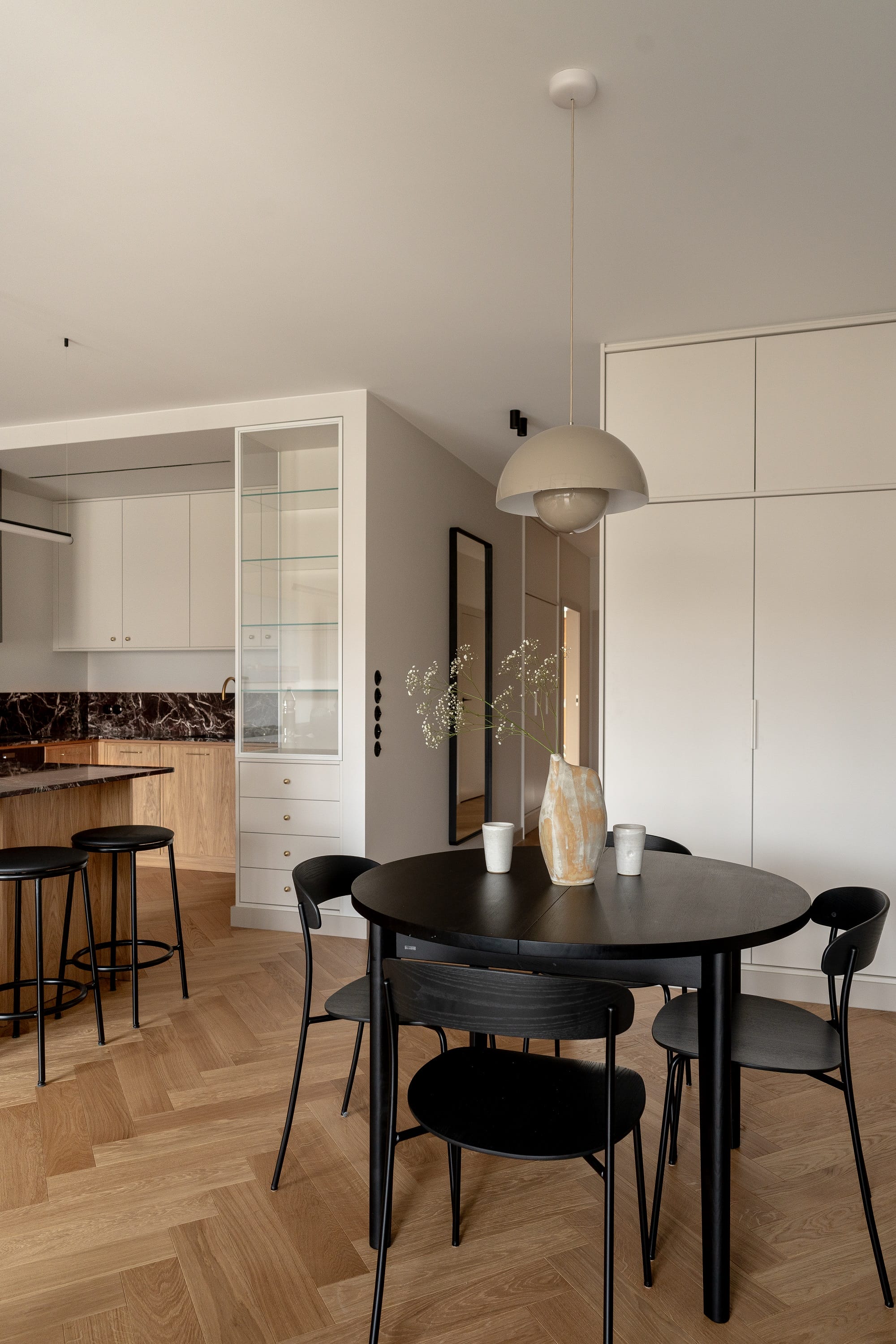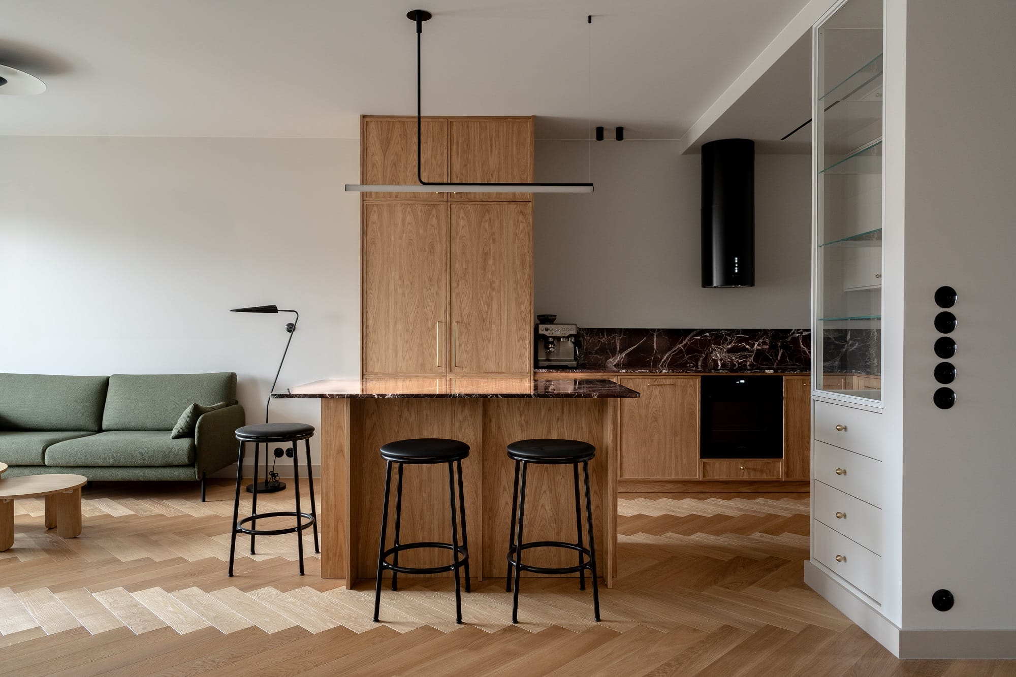 W zaprojektowanym przez Katję Sadziak apartamencie z przedwojennym rodowodem graficzne mozaiki, szlachetne forniry i naturalny kamień budują współczesny etap życia wnętrza.