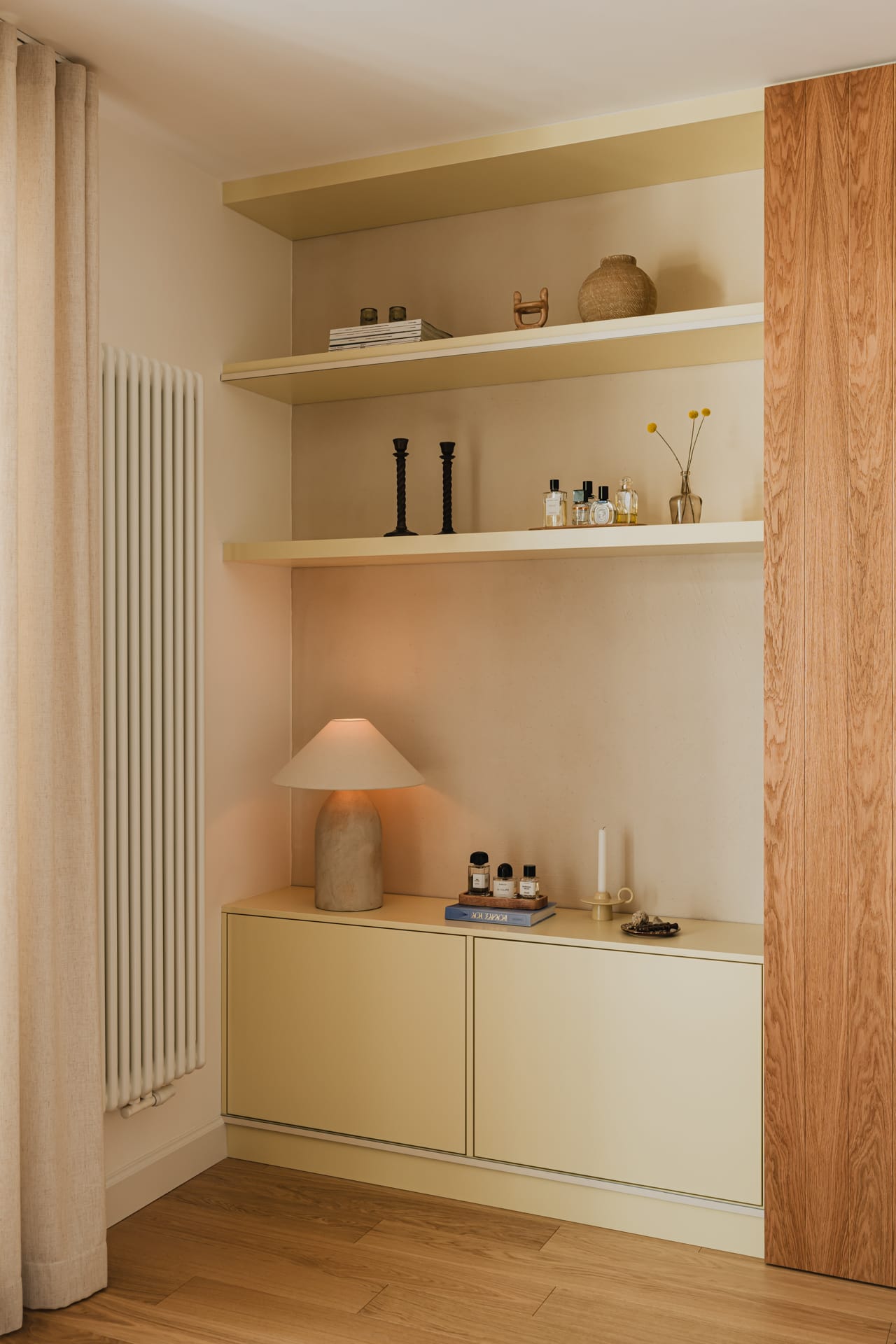 Olfaktoryczne inspiracje zaowocowały wnętrzem opartym na neutralnych kolorach, naturalnych materiałach i rzemieślniczych detalach. Na podłodze zestawiono ze sobą dwa mocne akcenty: beżowe cegiełki o wyraźnie nierównej fakturze, które mają przywodzić na myśl klimat południowej willi, oraz szczotkowaną dębową podłogę. Do tego tynk strukturalny oraz naturalny fornir w zabudowach meblowych.