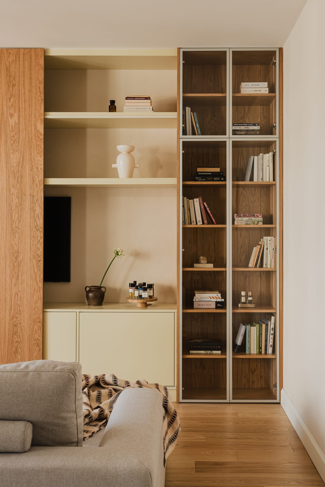 Przynależąca do otwartej strefy dziennej drewniana zabudowa aneksu kuchennego po prawej maskuje pion wentylacyjny, a po lewej – zabudowaną lodówkę oraz szafę od strony wejściowej.