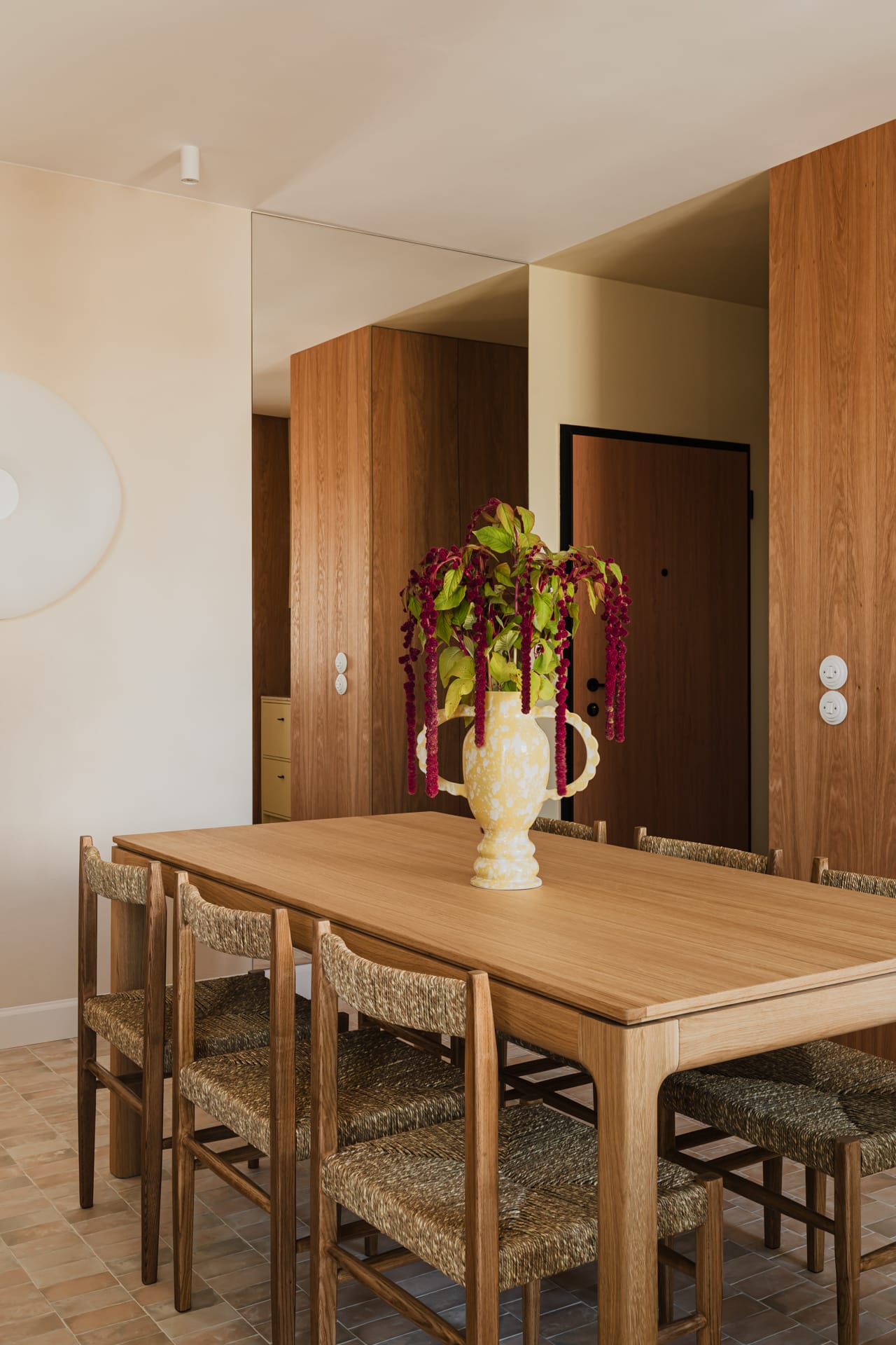 Projekt dopełnia staranna selekcja mebli i dodatków. Oprócz drewnianych krzeseł z oparciem z plecionej trawy morskiej znalazły się tu stalowe akcenty i elementy polskiego rękodzieła – ceramika i wazony Paititi Studio.