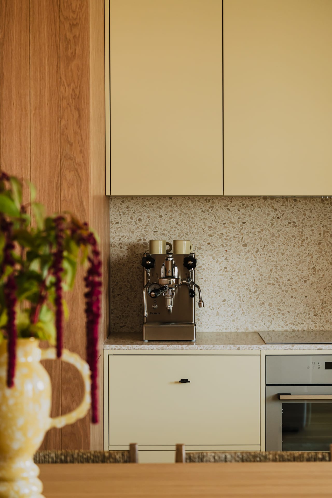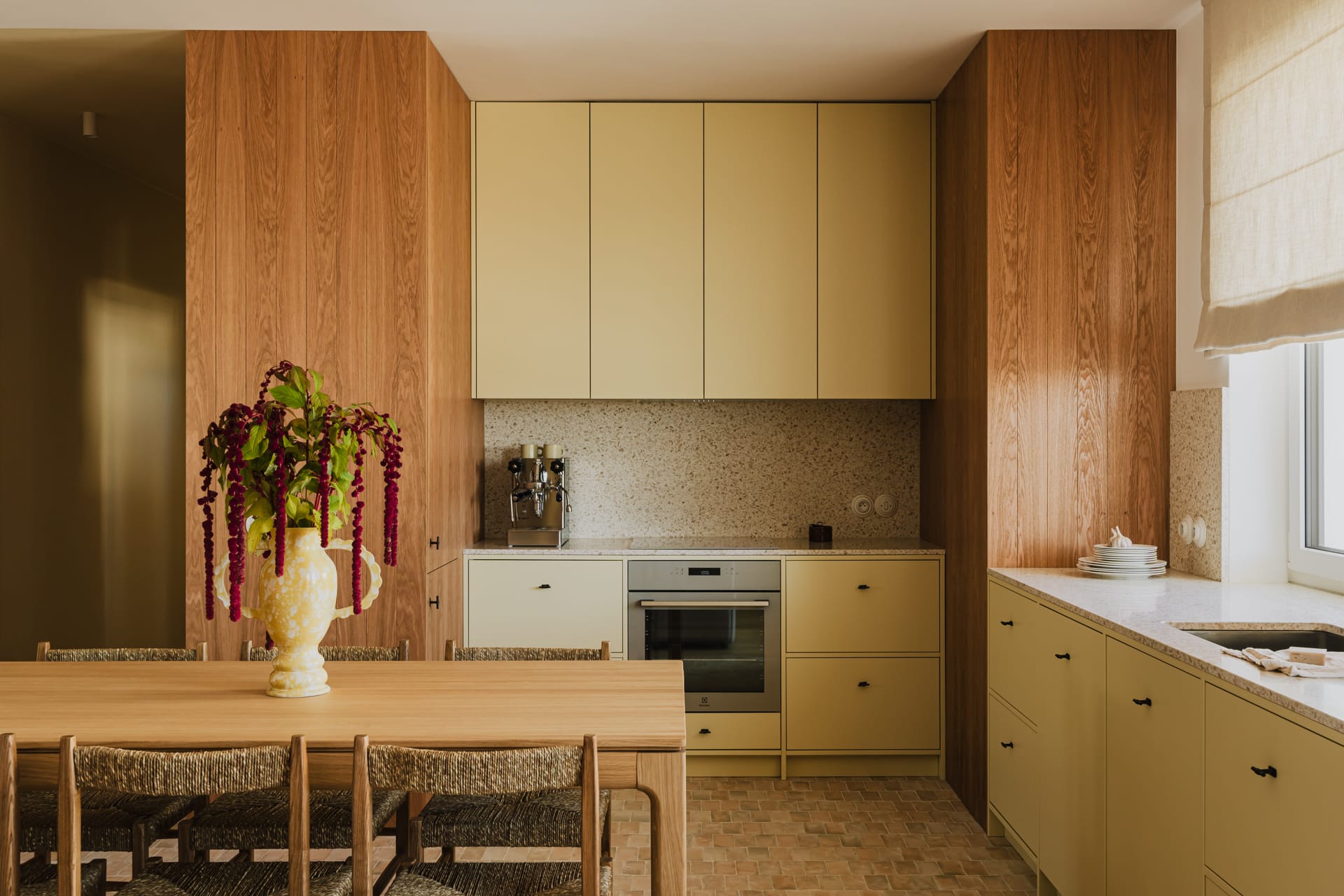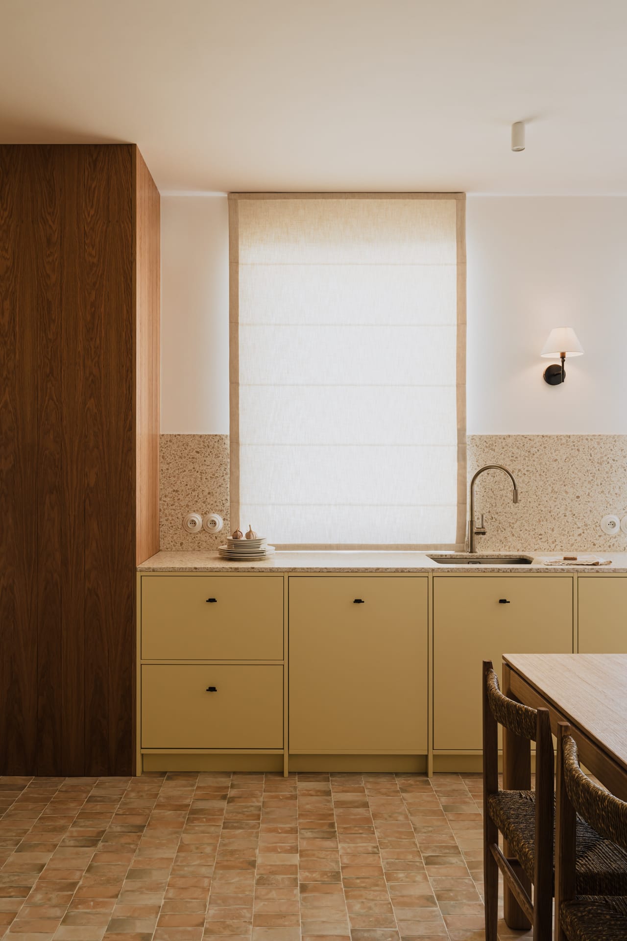 Wzory wprowadzono subtelnie, ale konsekwentnie. Lastryko z drobnego, beżowego kruszywa pojawia się w kuchni – na blacie i backsplashu – oraz w łazience, gdzie wykorzystano je do wykonania monolitycznej umywalki z ukrytym odpływem.