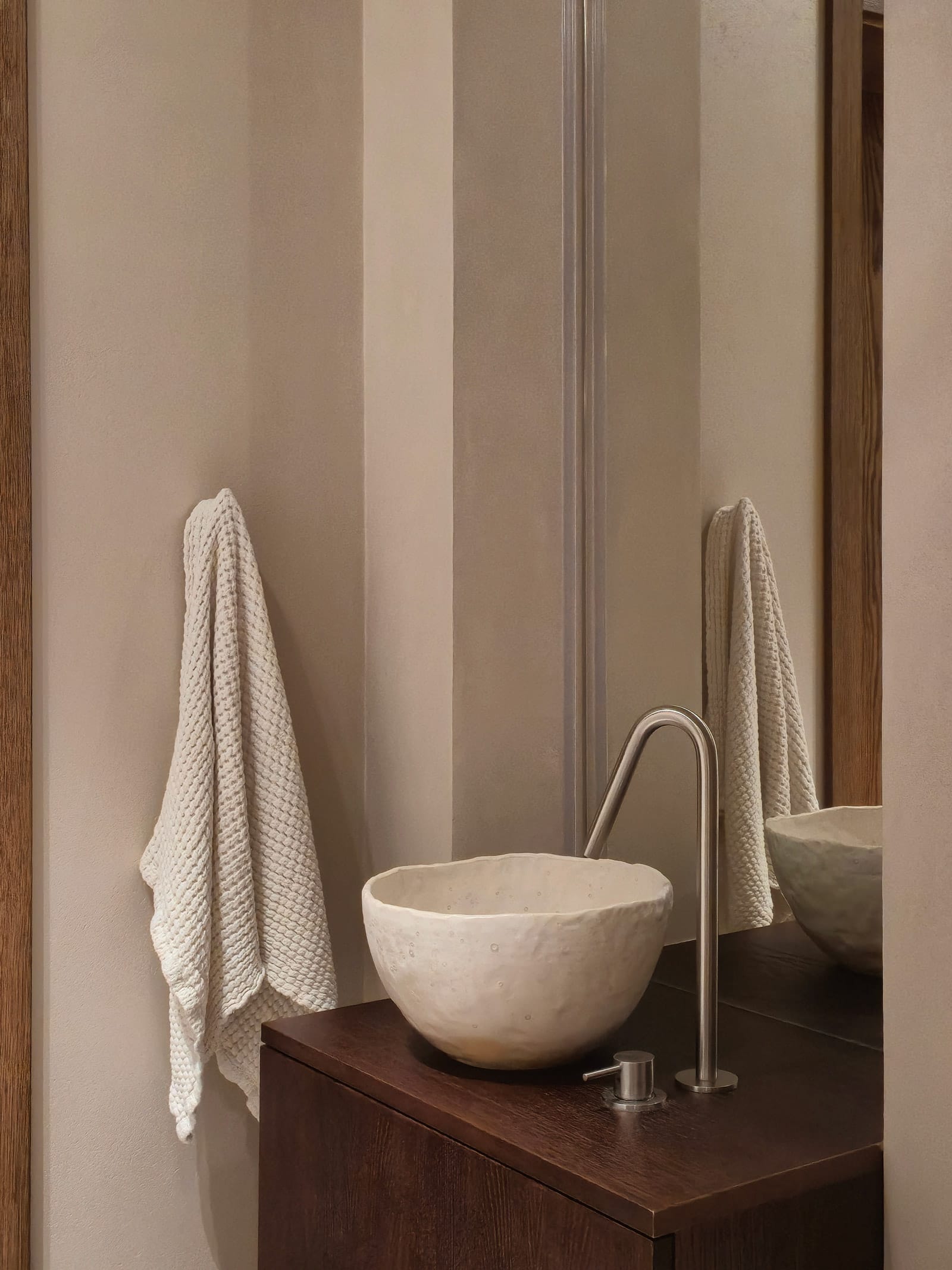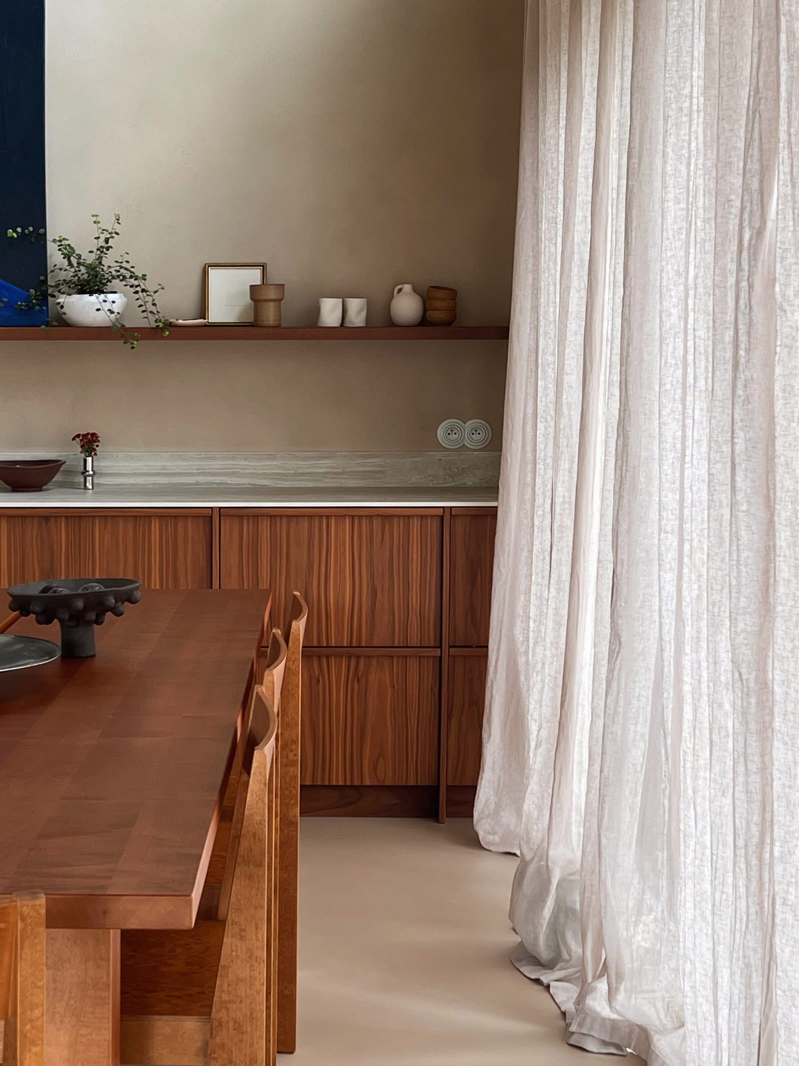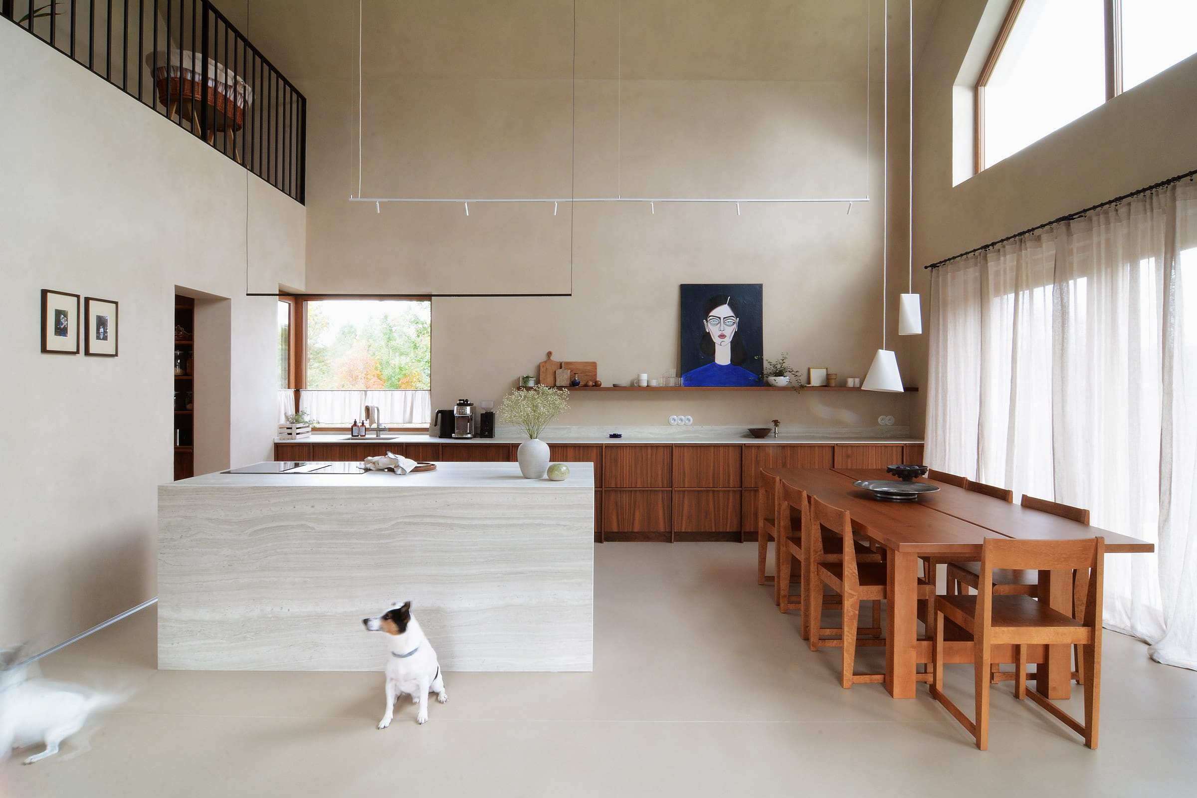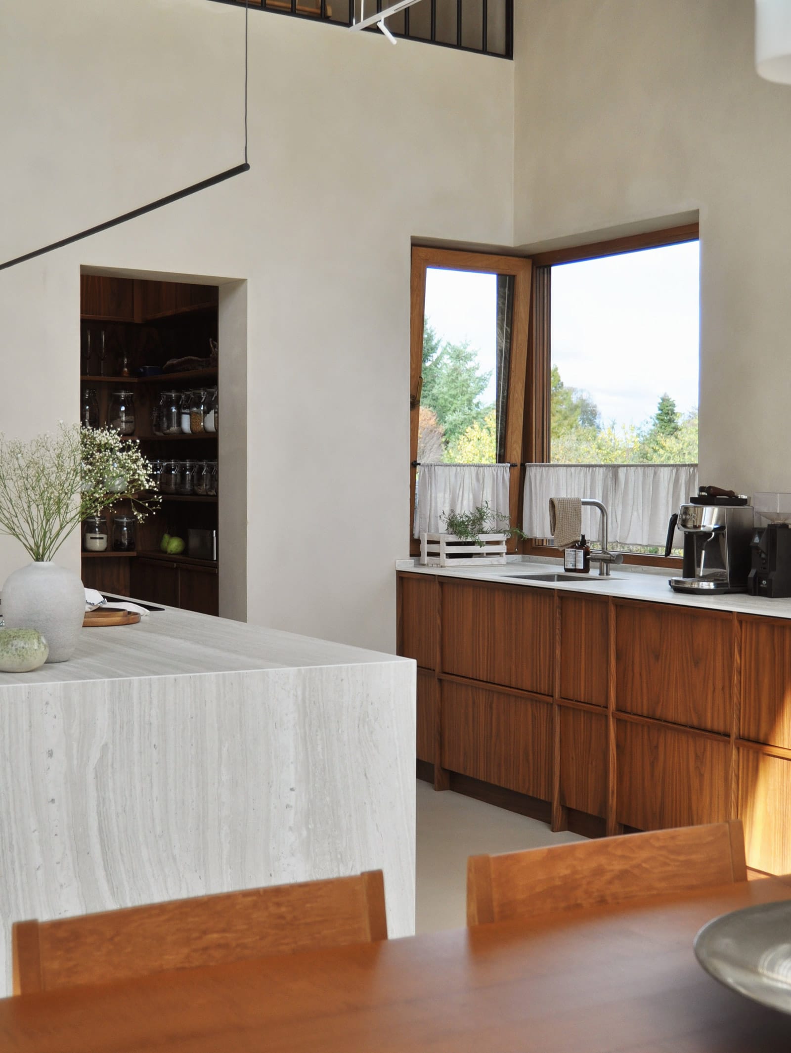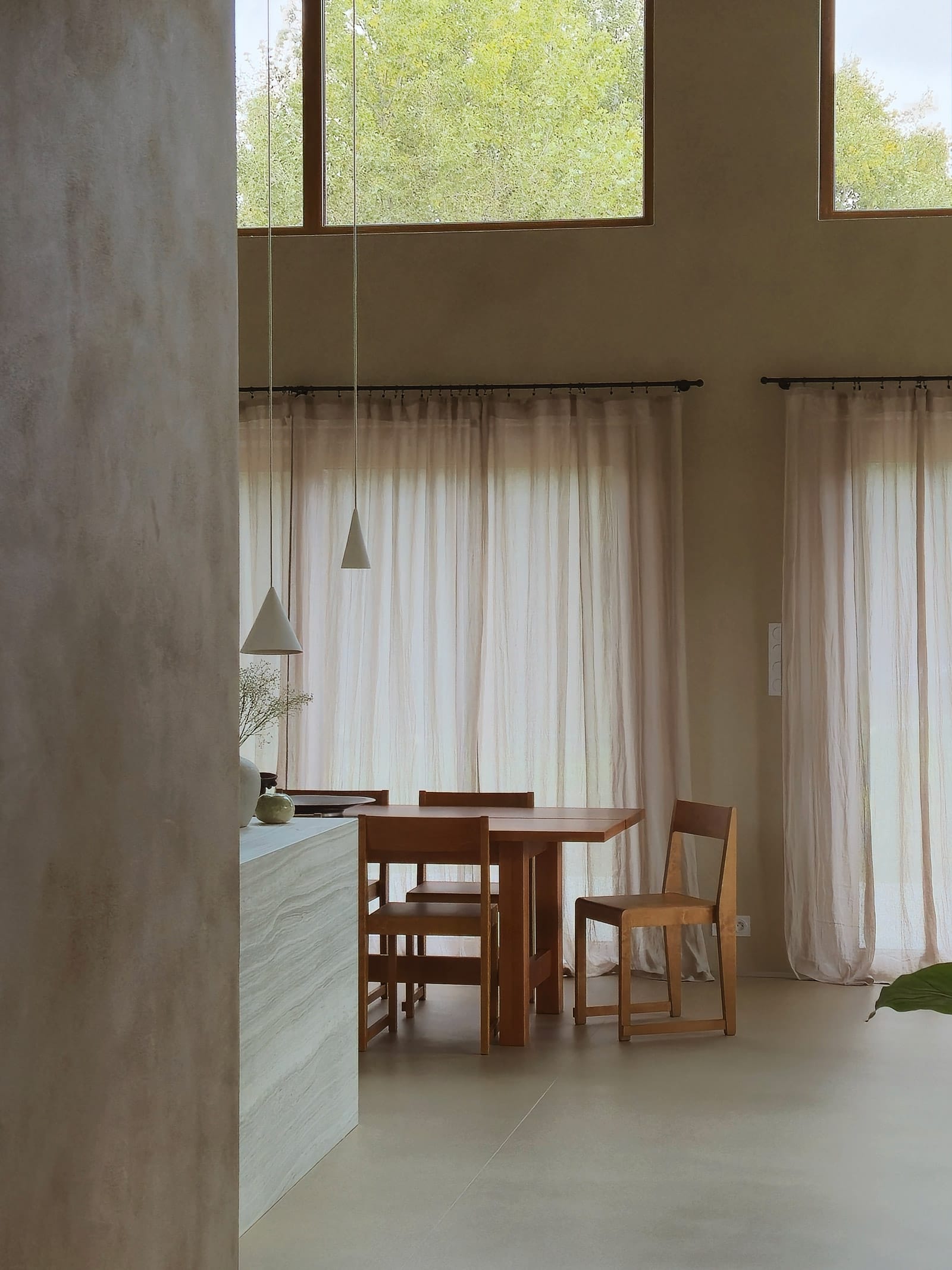 W aranżacji przeważają naturalne materiały: drewno, mikrocement, tynki gliniane i trawertyn. Surowe ściany i jednolite podłogi tworzą spokojne tło dla prostych, ponadczasowych mebli, wykonanych głównie z drewna.