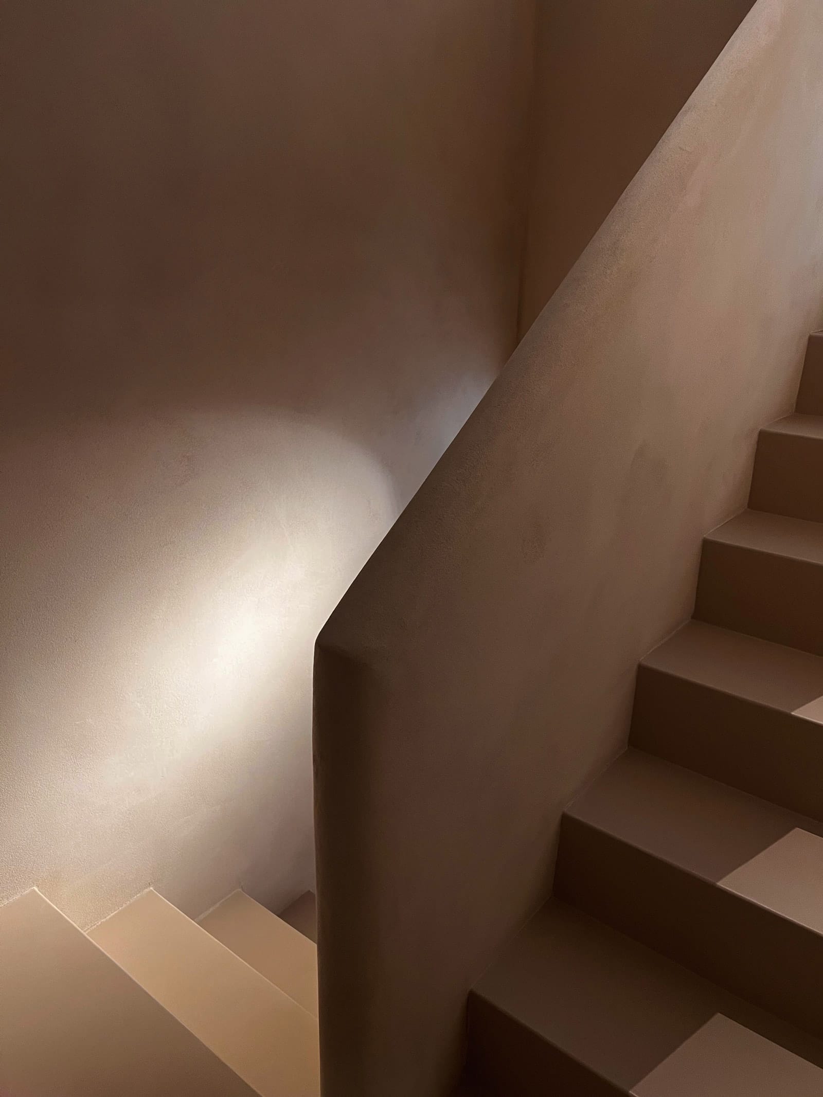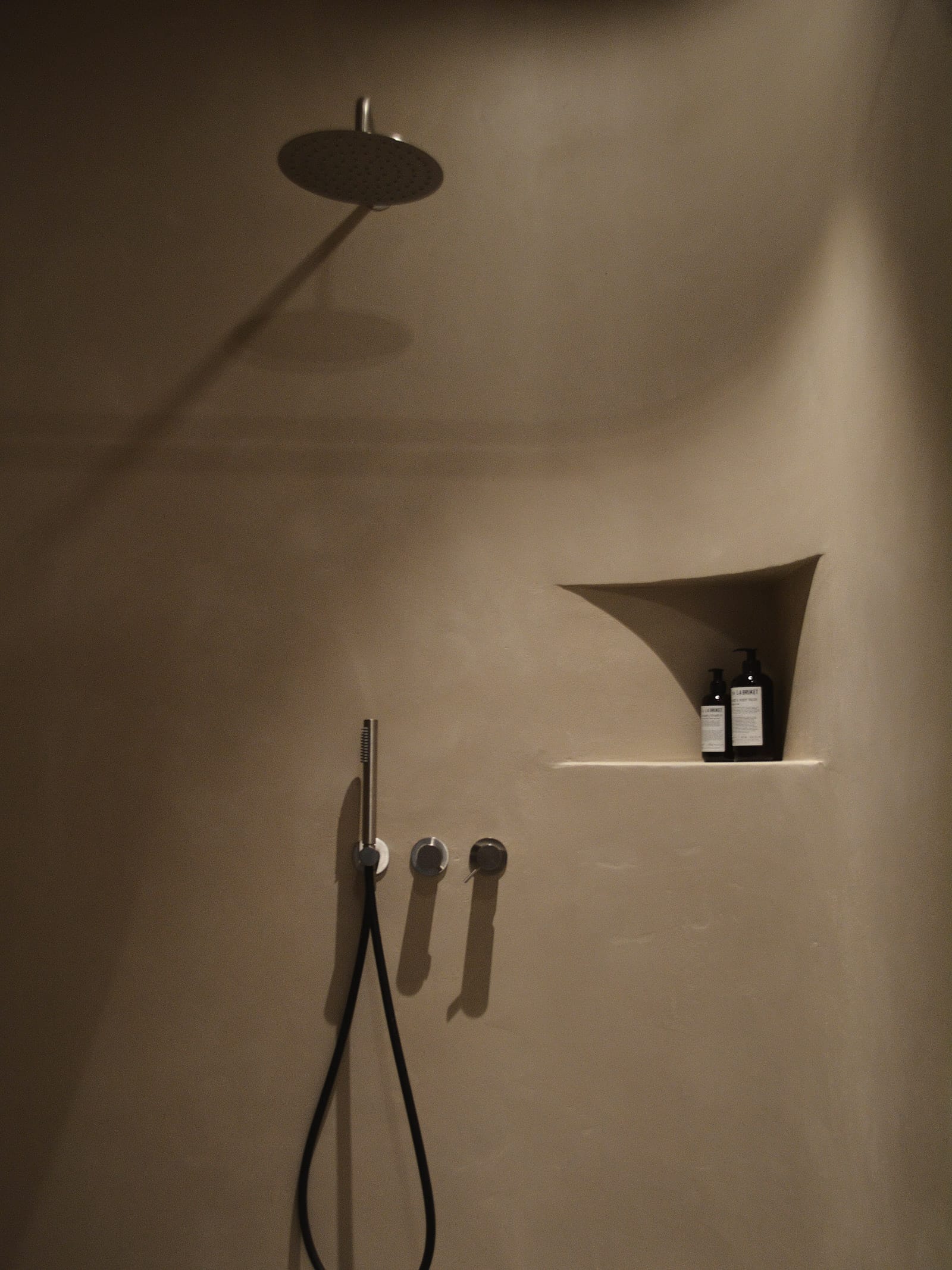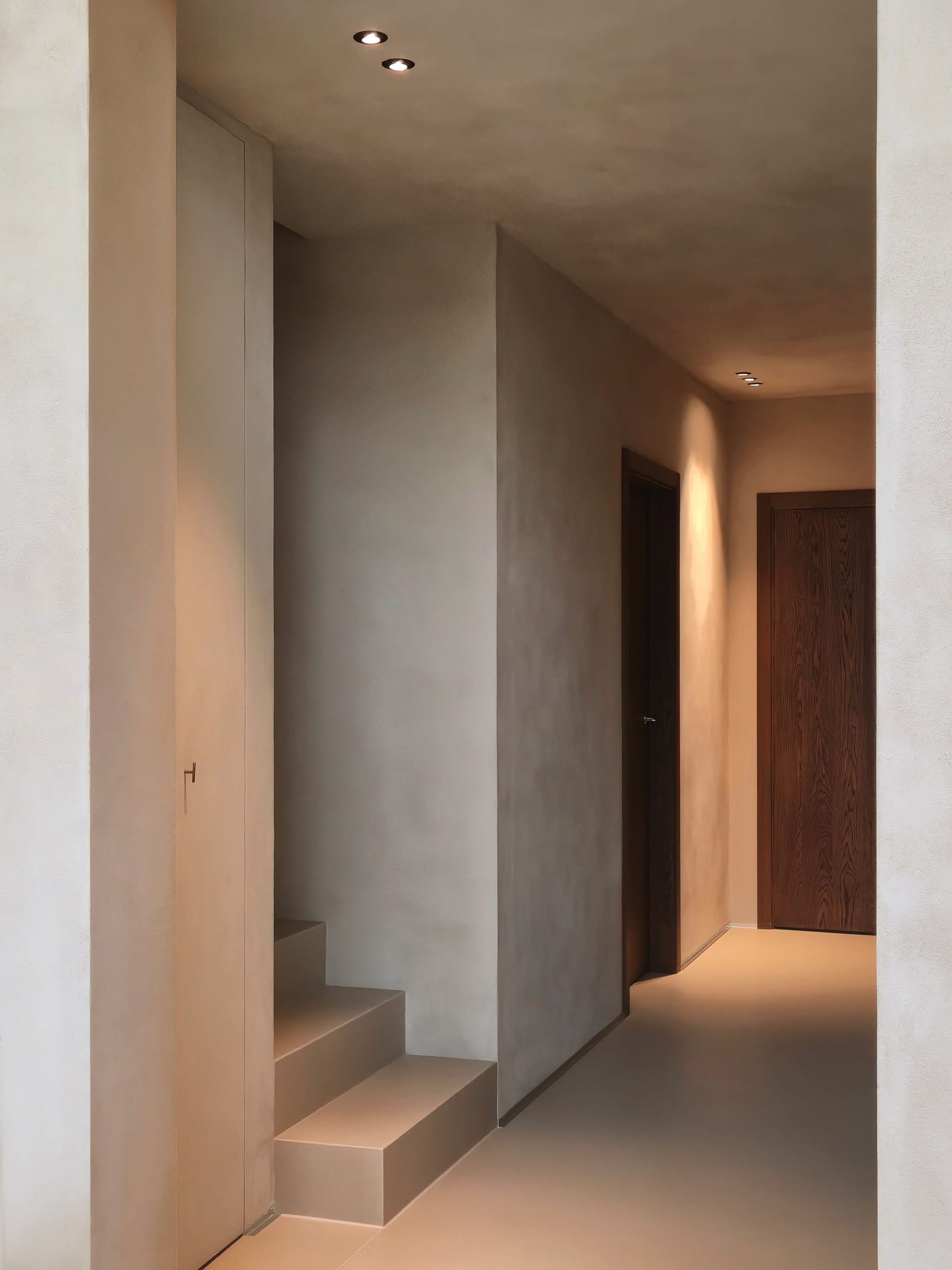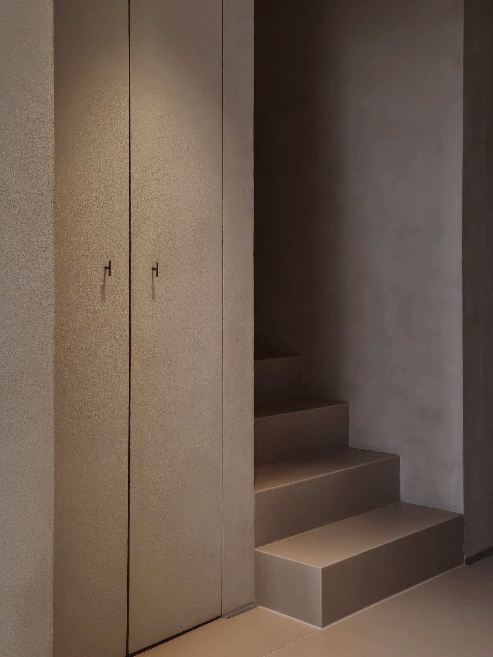 W aranżacji przeważają naturalne materiały: drewno, mikrocement, tynki gliniane i trawertyn. Surowe ściany i jednolite podłogi tworzą spokojne tło dla prostych, ponadczasowych mebli, wykonanych głównie z drewna.