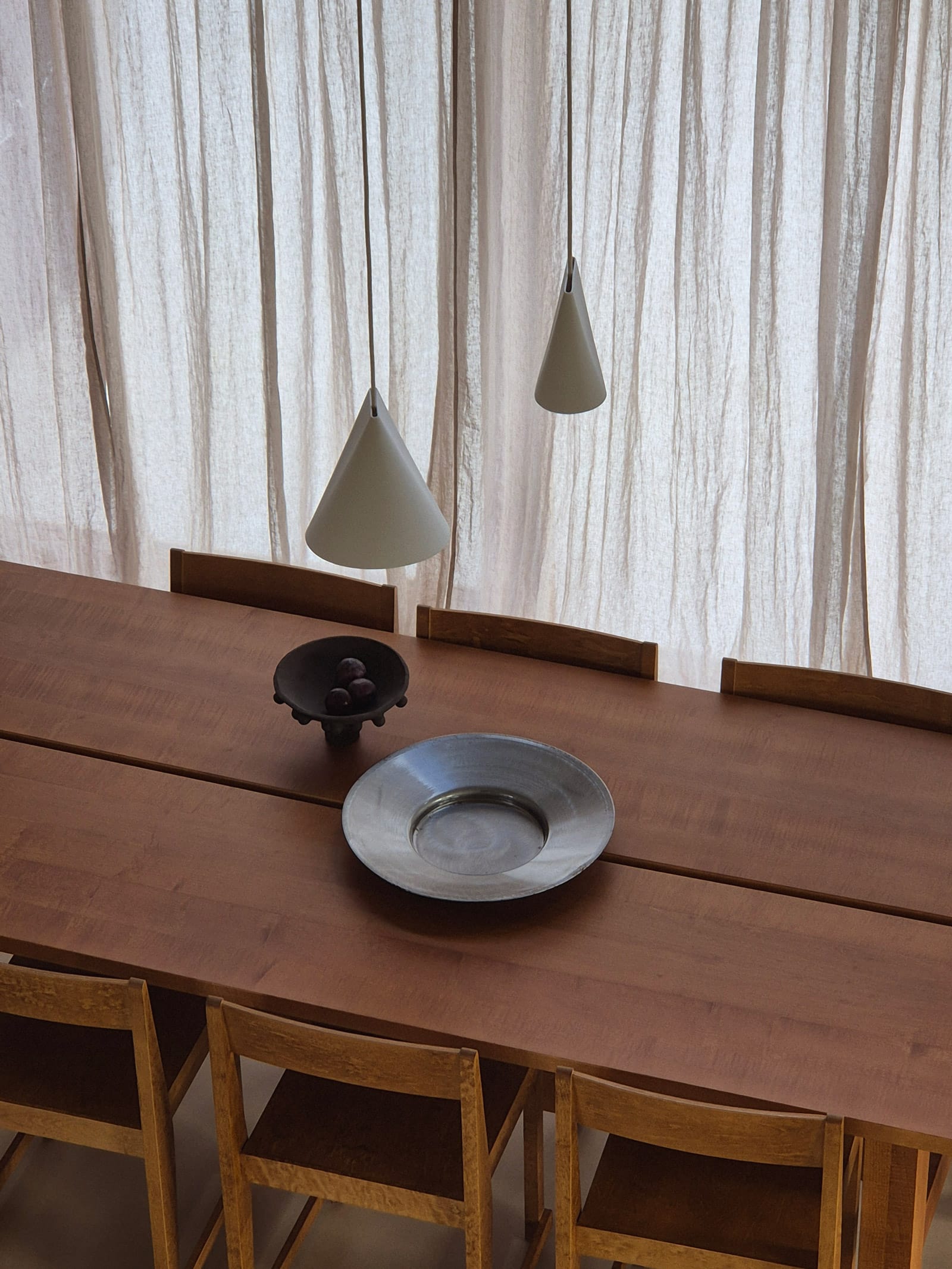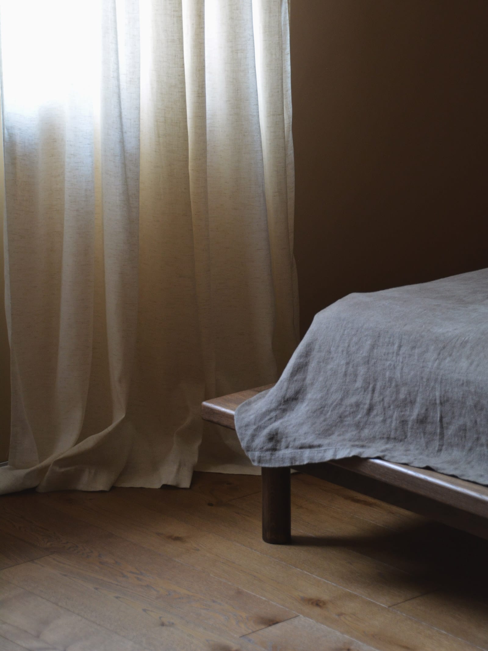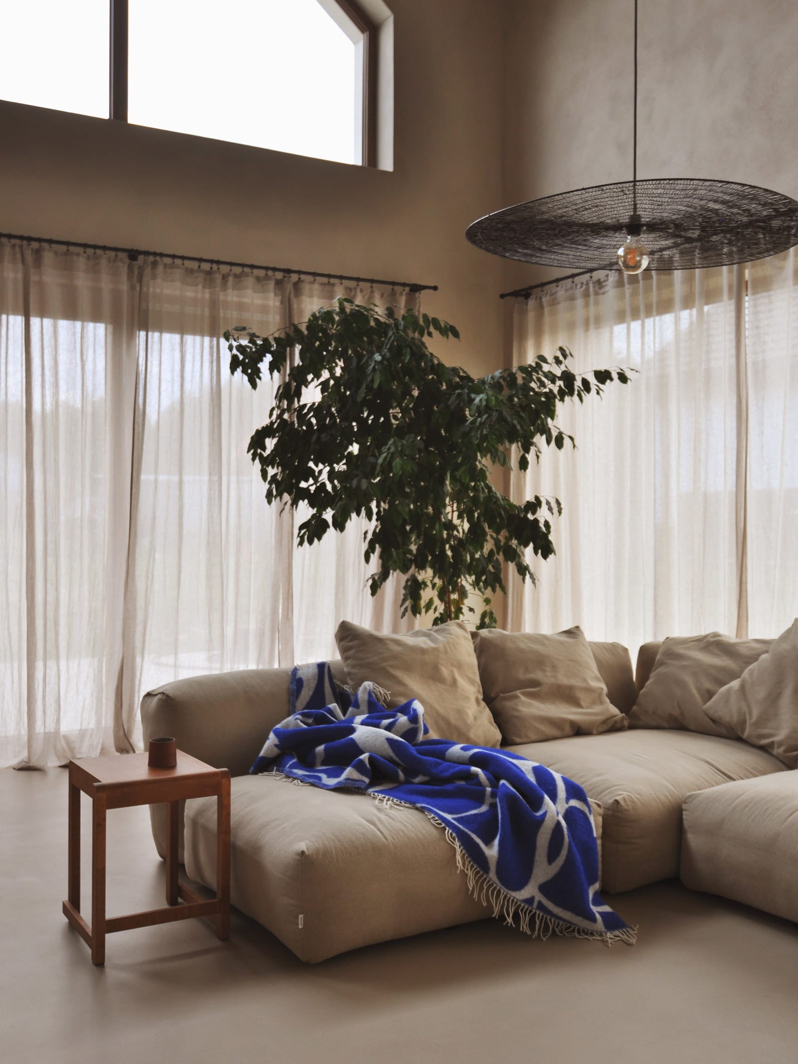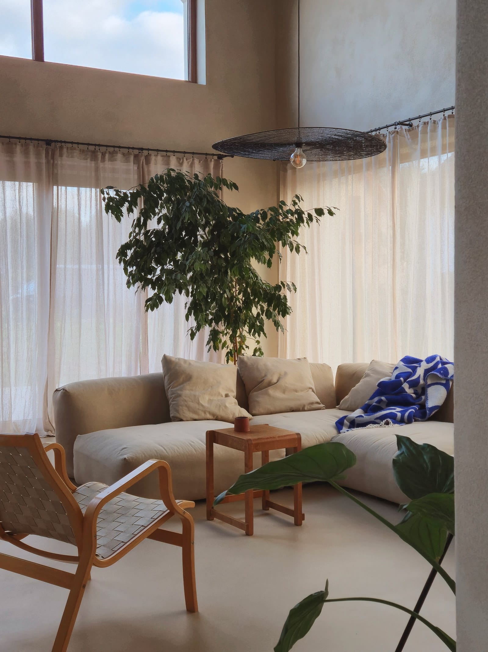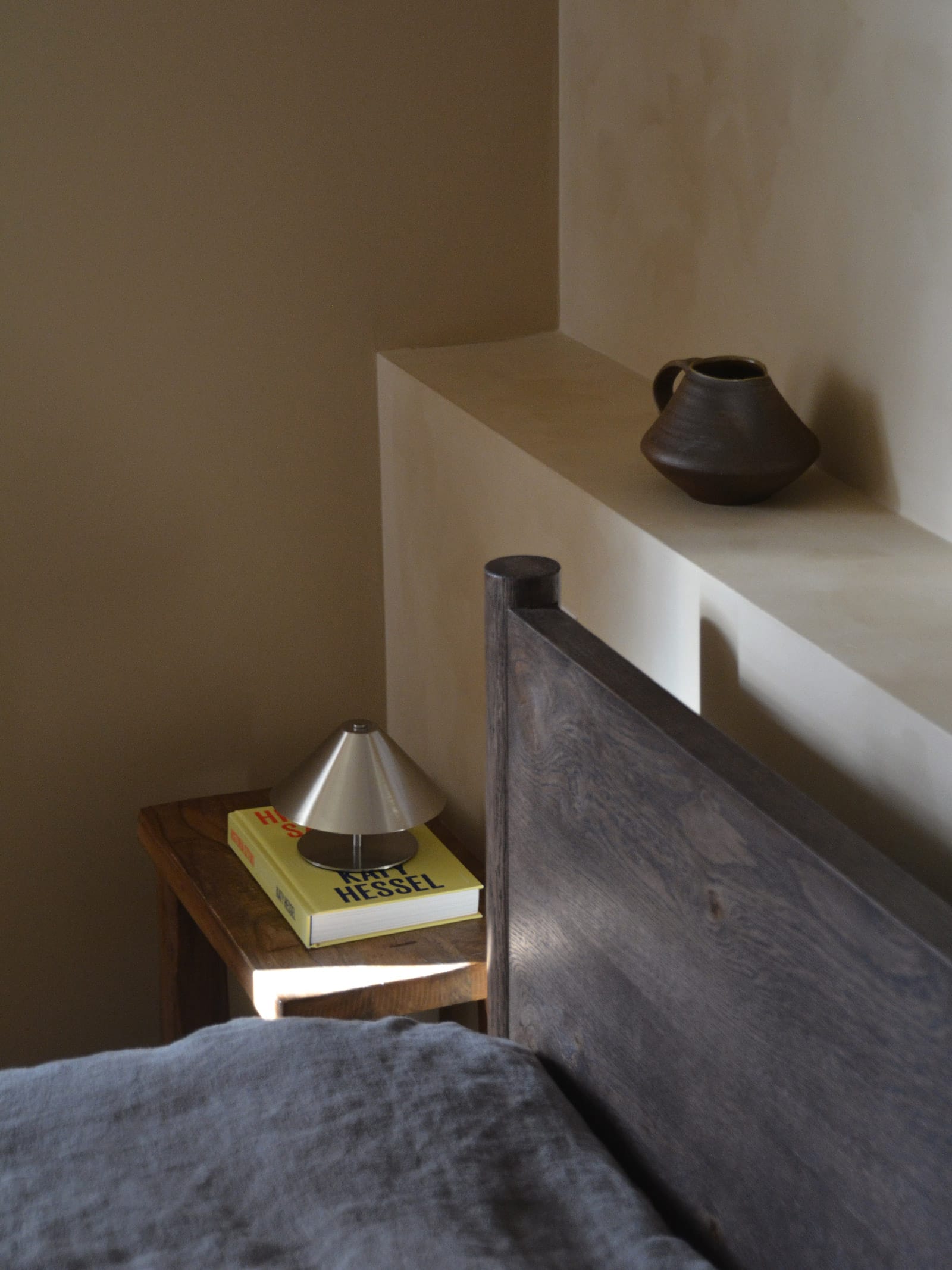 W aranżacji przeważają naturalne materiały: drewno, mikrocement, tynki gliniane i trawertyn. Surowe ściany i jednolite podłogi tworzą spokojne tło dla prostych, ponadczasowych mebli, wykonanych głównie z drewna.