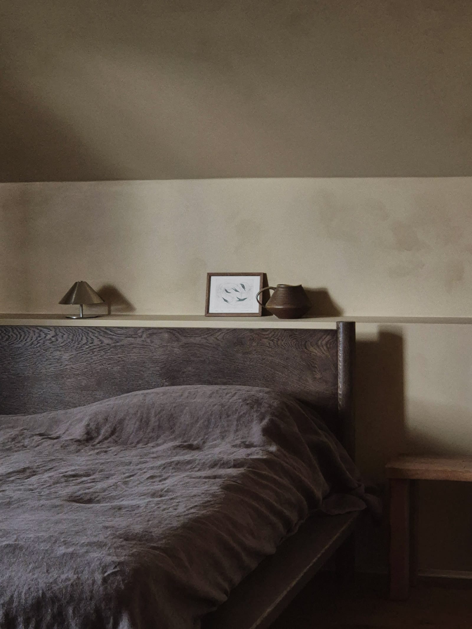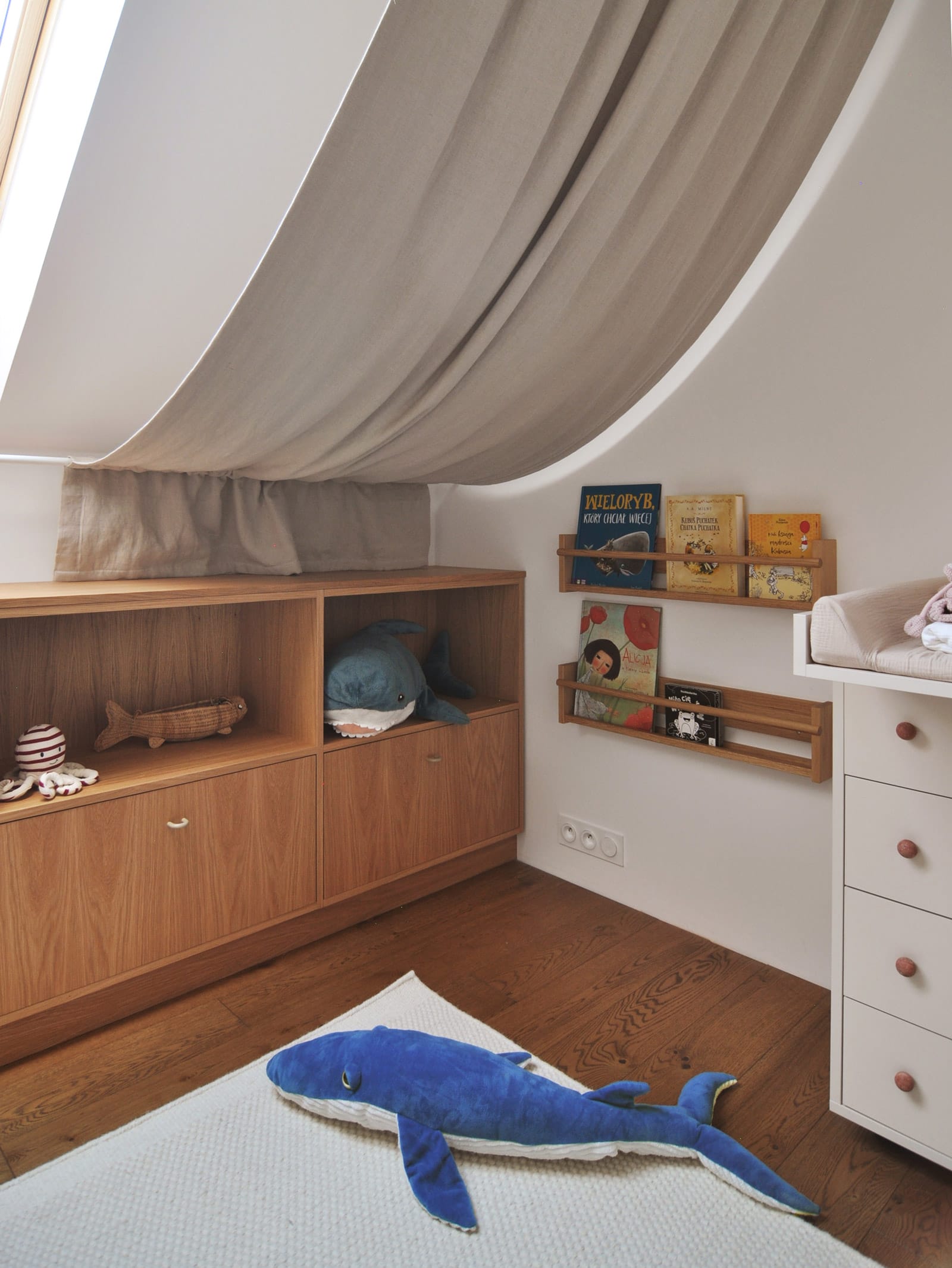 W odróżnieniu od rozświetlonych części wspólnych, sypialnia jest ciemniejsza – ściany, sufit i skosy pokryto farbą strukturalną w głębokim brązowym kolorze. Najważniejszym elementem jest tu łóżko, zaprojektowane specjalnie do tej przestrzeni. W efekcie powstała intymna przestrzeń przypominająca „jaskinię”, idealna do złapania oddechu po długim dniu.