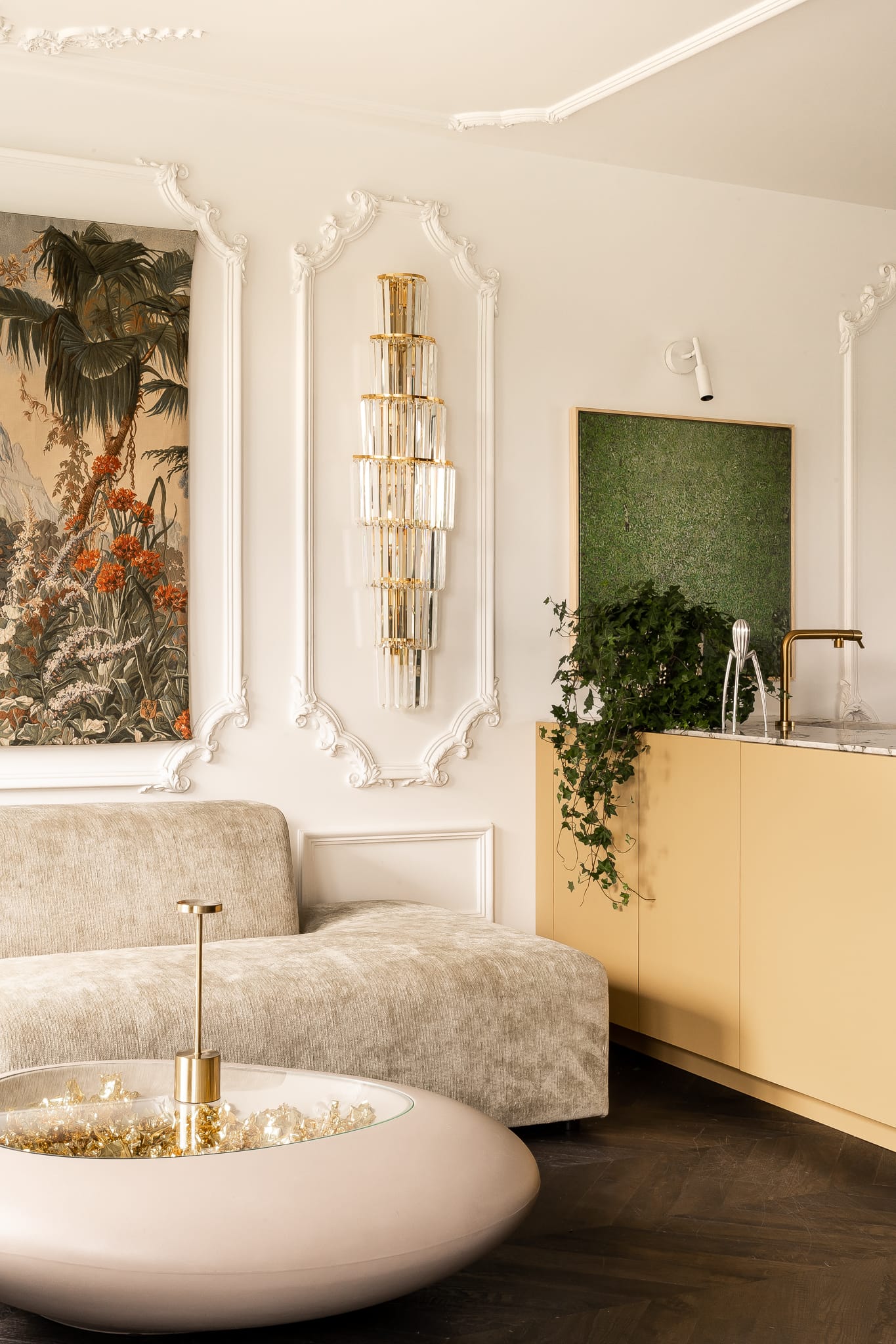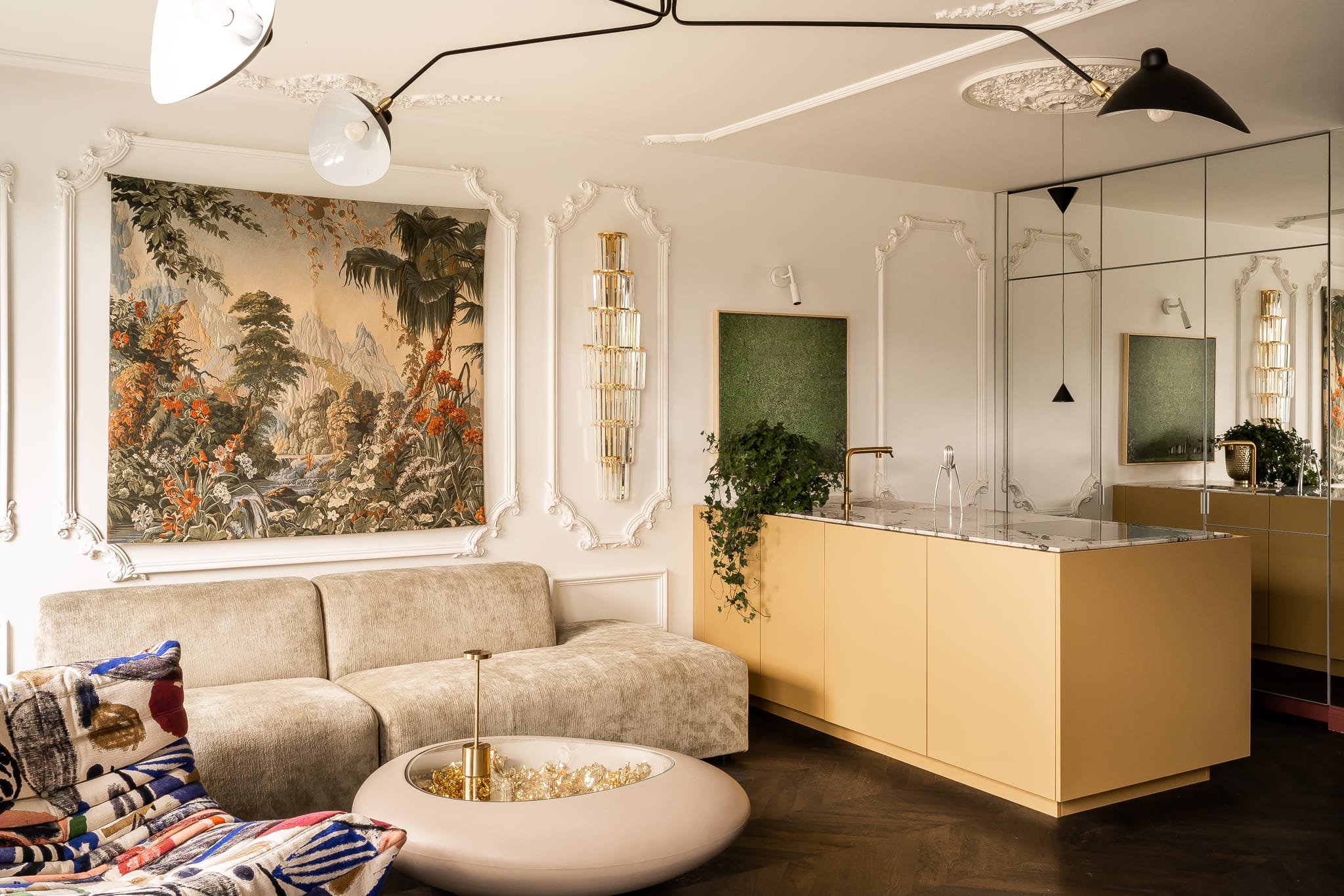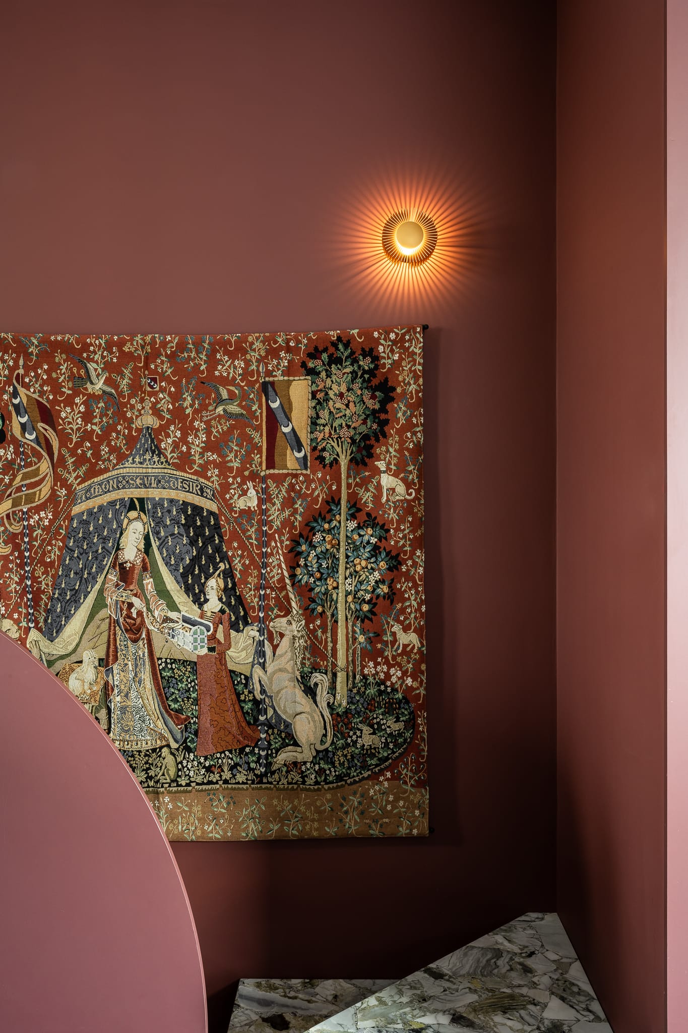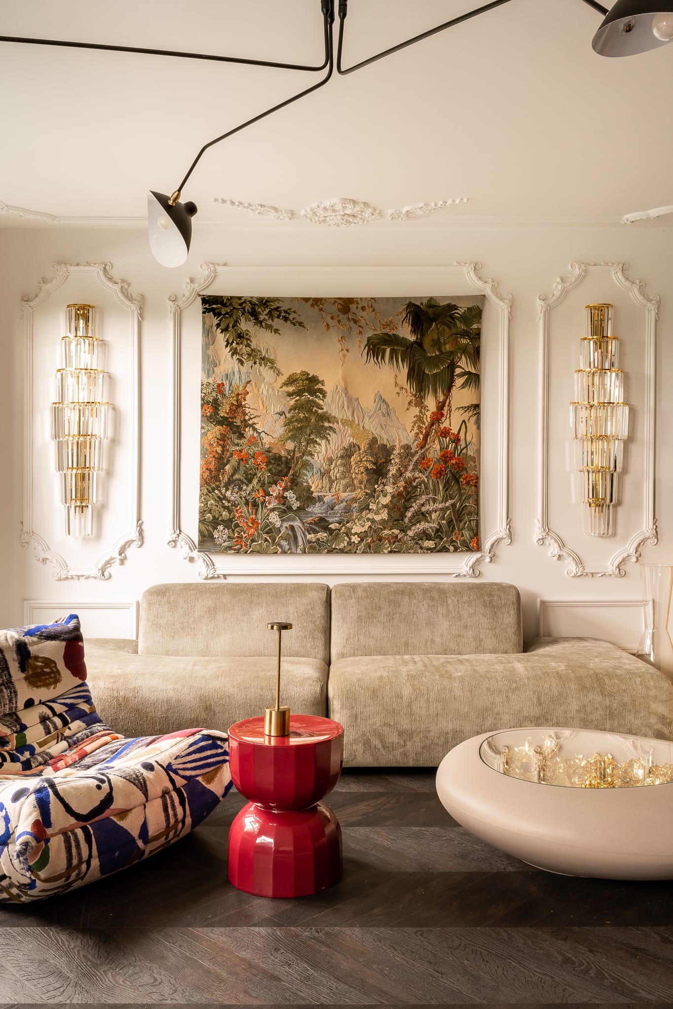 Na aranżację składają się także armatura Gessi, oświetlenie Karman i starannie dopracowana stolarka. Prawdziwą gwiazdą jest Fotel Togo w limitowanej edycji La Toile du Peintre od Pierre Frey. Kolekcja sztuki i arrasy od Jules Pansu, które właściciele mieli od lat, nie zostały „wstawione” do projektu – projekt od początku powstawał w dialogu z nimi.
