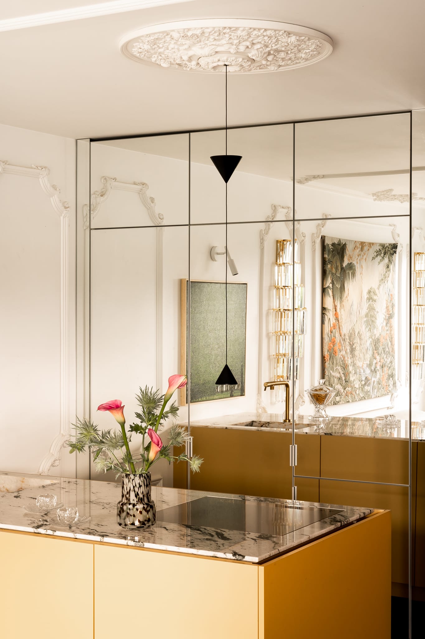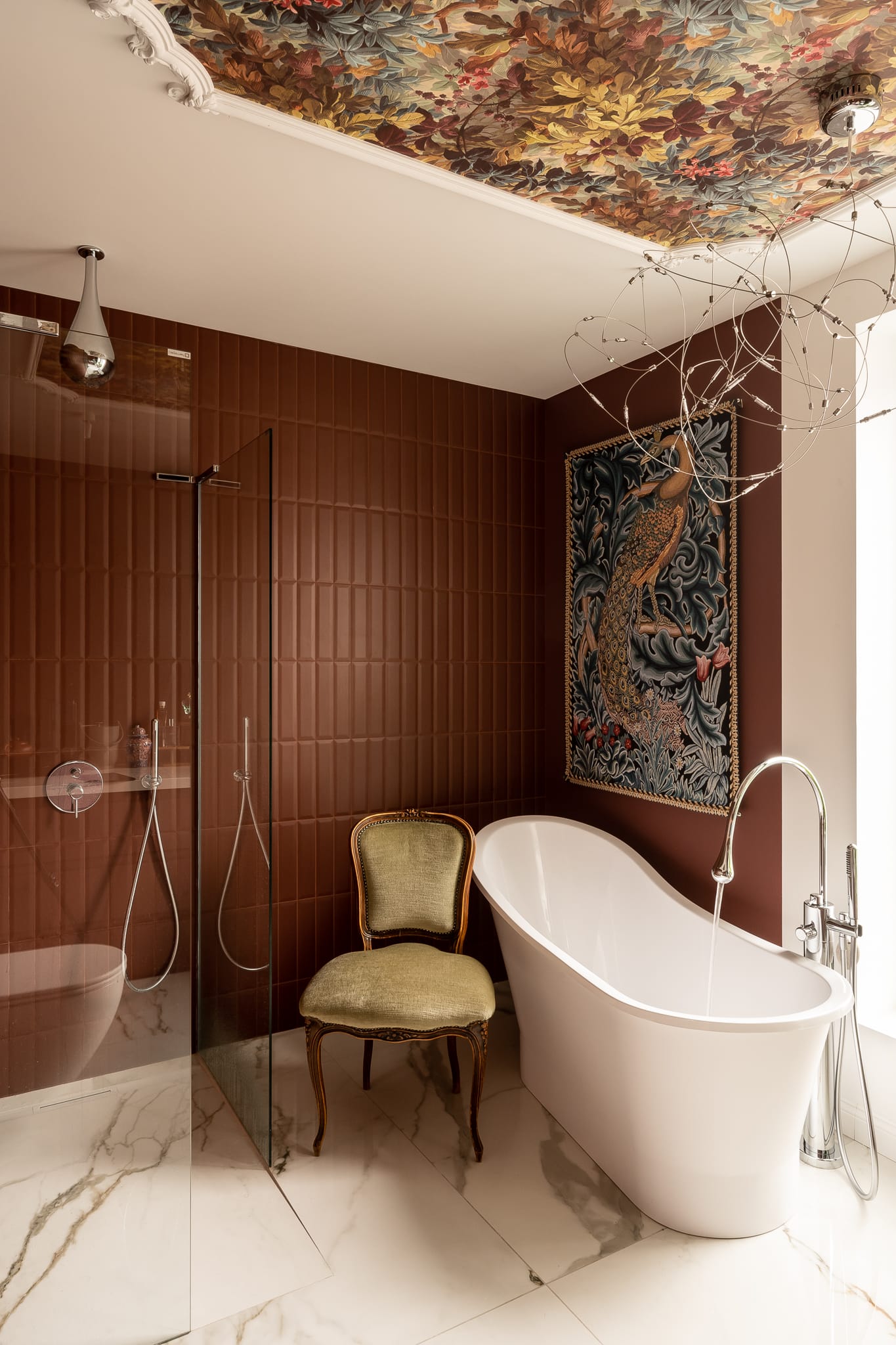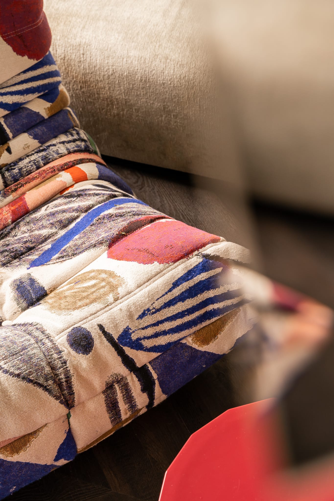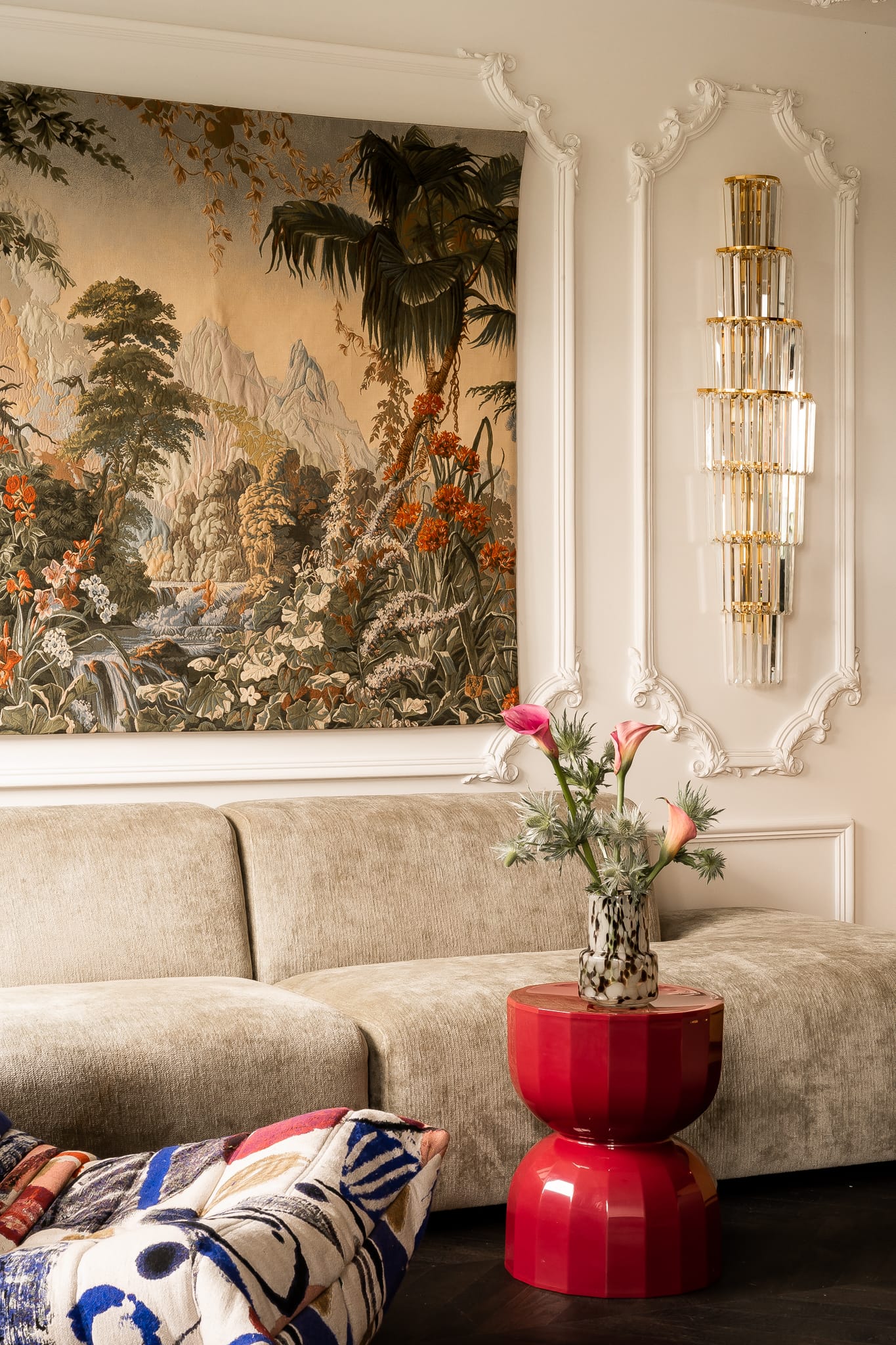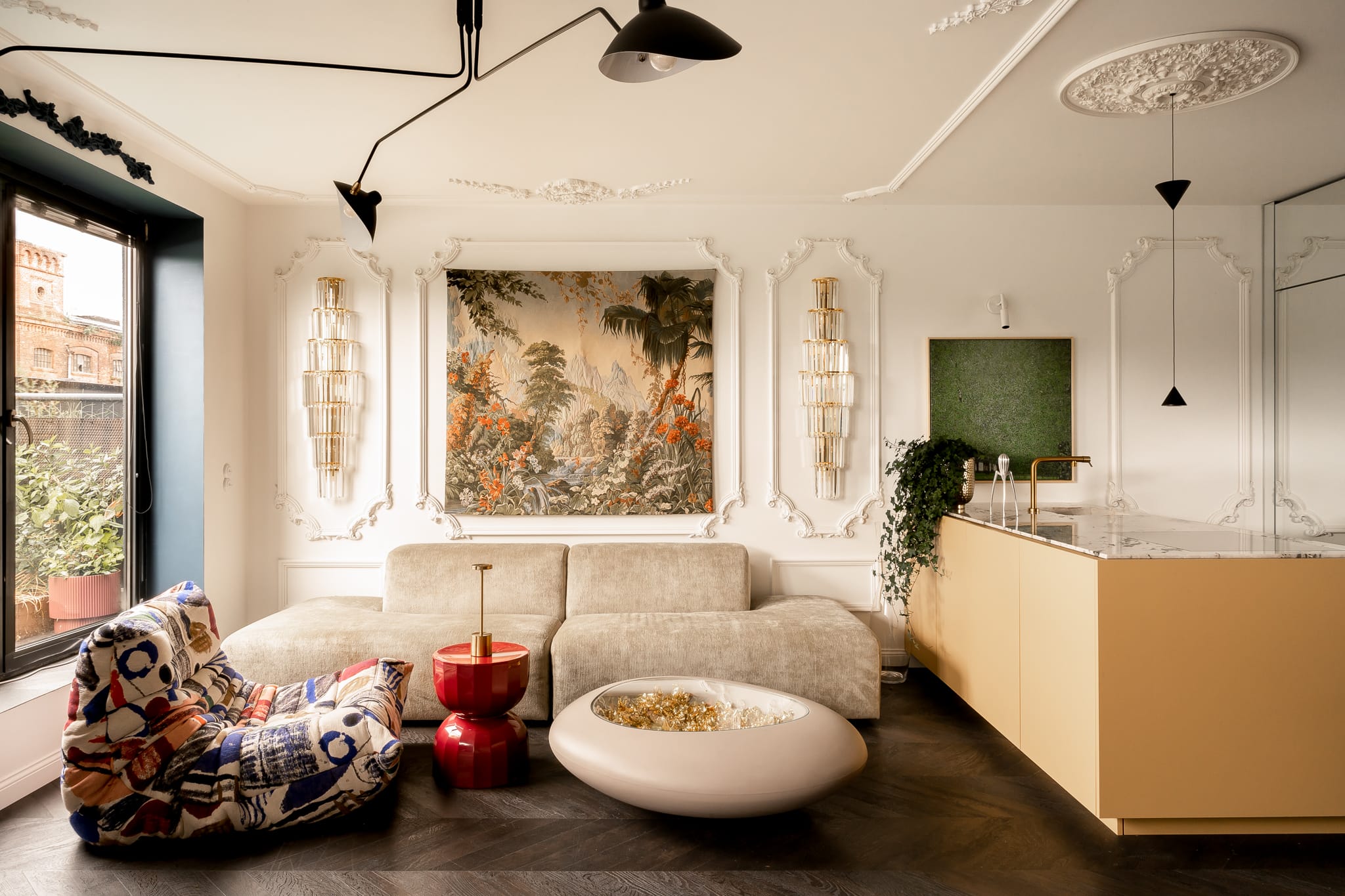 Na aranżację składają się także armatura Gessi, oświetlenie Karman i starannie dopracowana stolarka. Prawdziwą gwiazdą jest Fotel Togo w limitowanej edycji La Toile du Peintre od Pierre Frey. Kolekcja sztuki i arrasy od Jules Pansu, które właściciele mieli od lat, nie zostały „wstawione” do projektu – projekt od początku powstawał w dialogu z nimi.