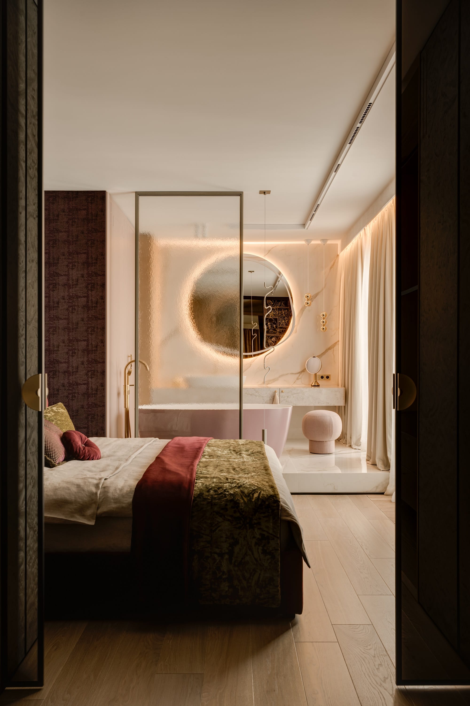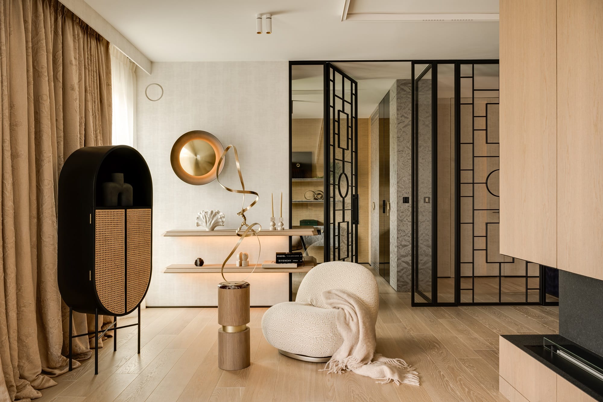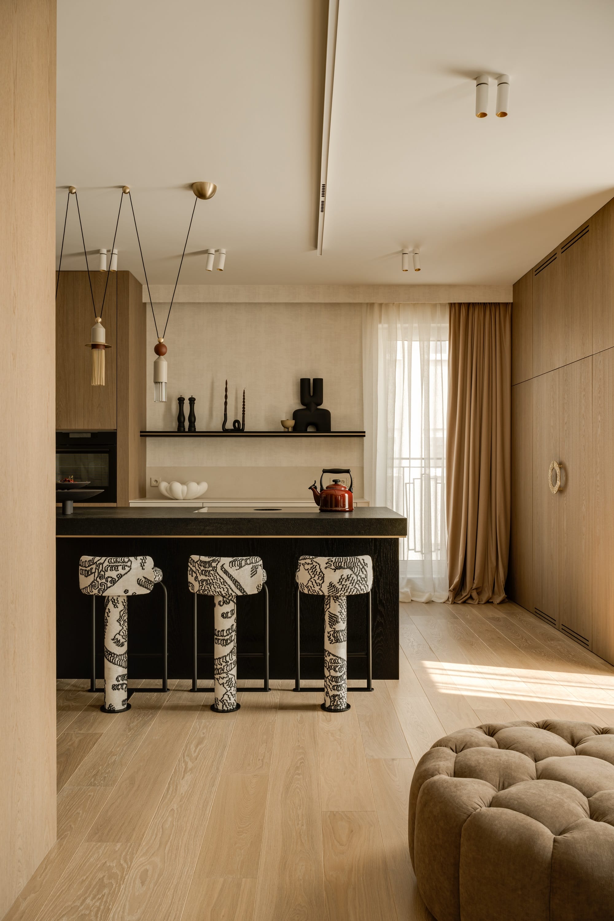 Drewniane obłogi, szary czeczot, mosiężne uchwyty i tapety zyskują pełnię wyrazu w zestawieniu ze światłem, które za dnia wydobywa faktury i niuanse, a wieczorem buduje bardziej intymną, niemal teatralną scenografię. Stonowaną paletę beży, chłodnych bieli i naturalnego drewna przełamują akcenty fioletu, różu i żółci, a także limonki i błękitu.