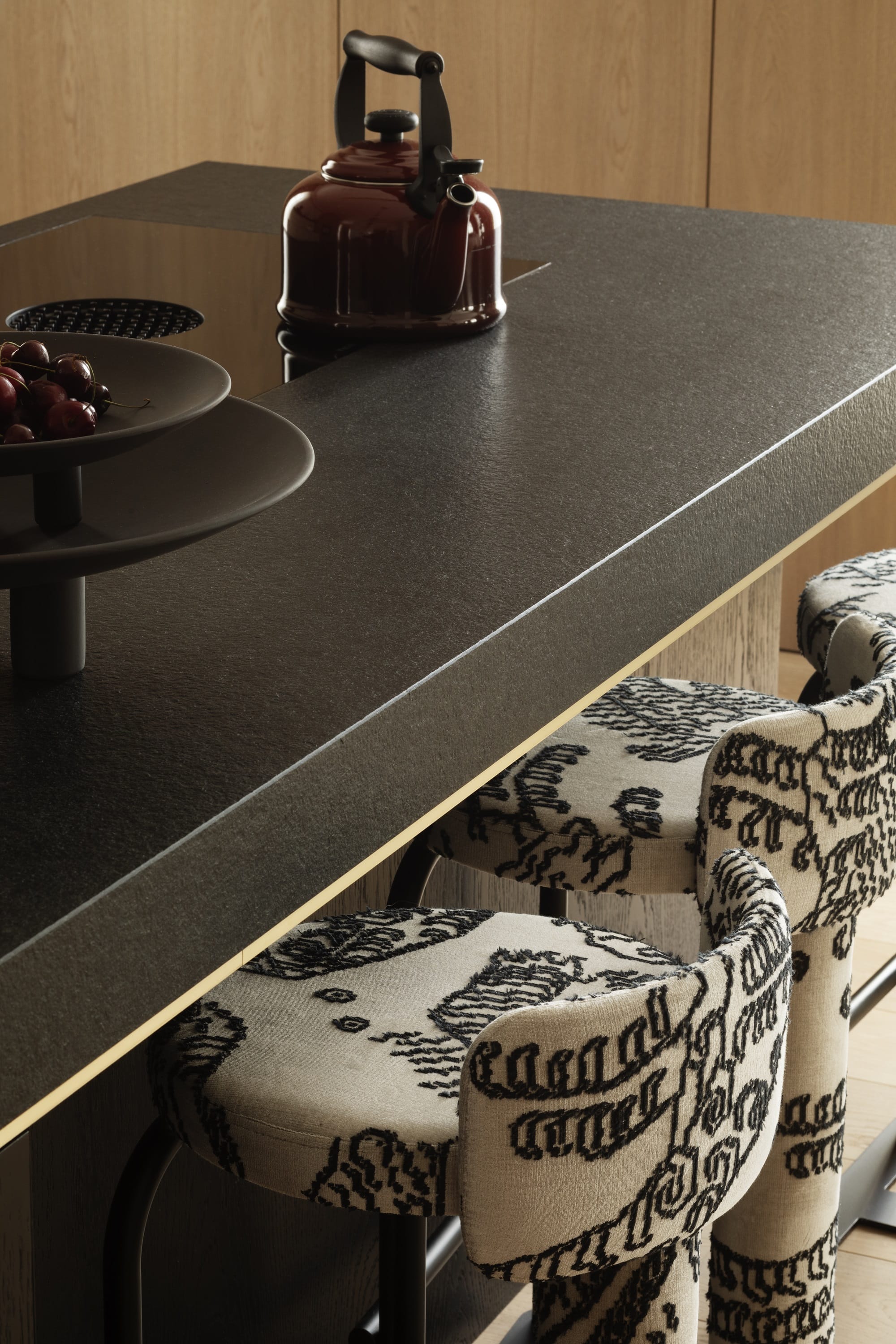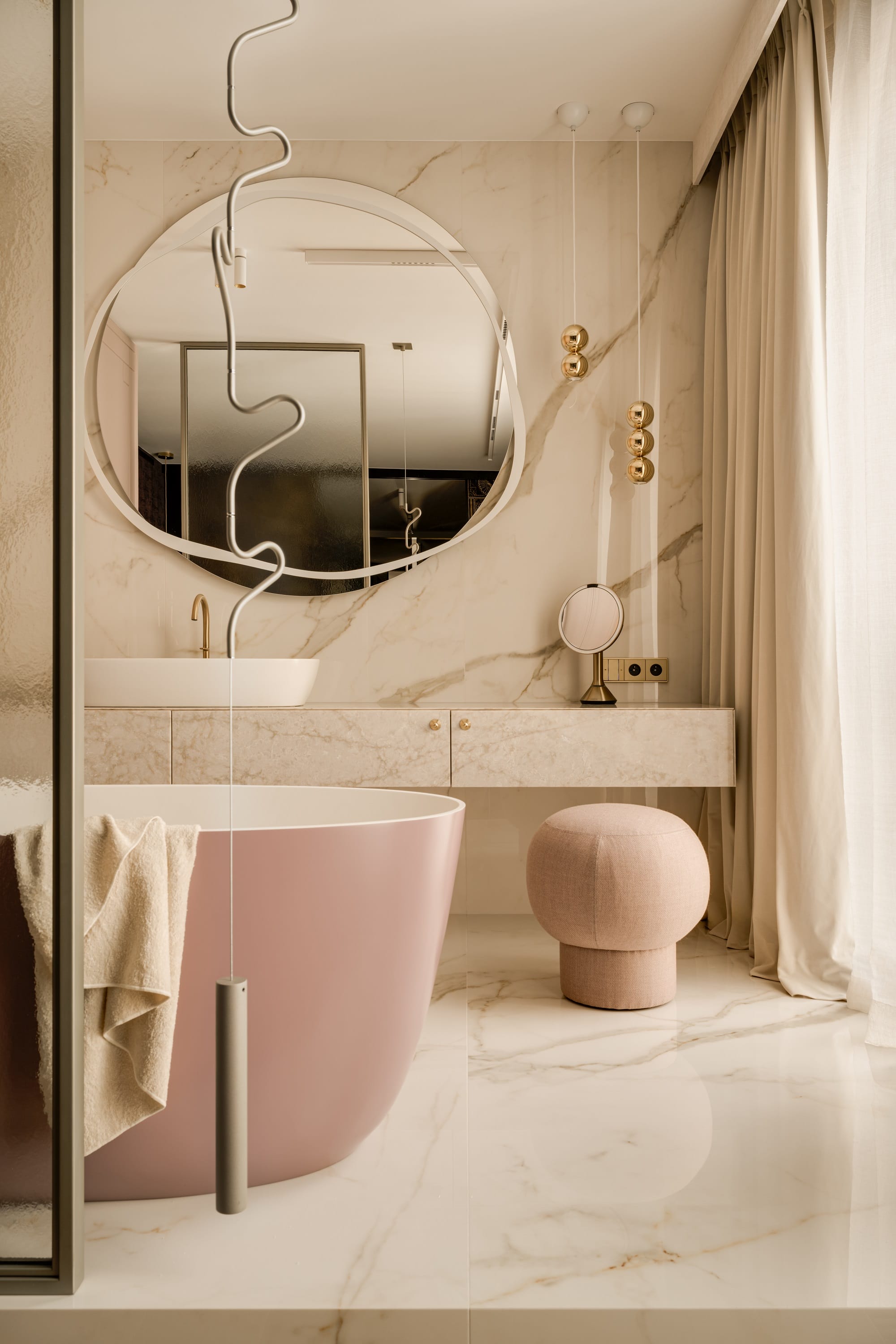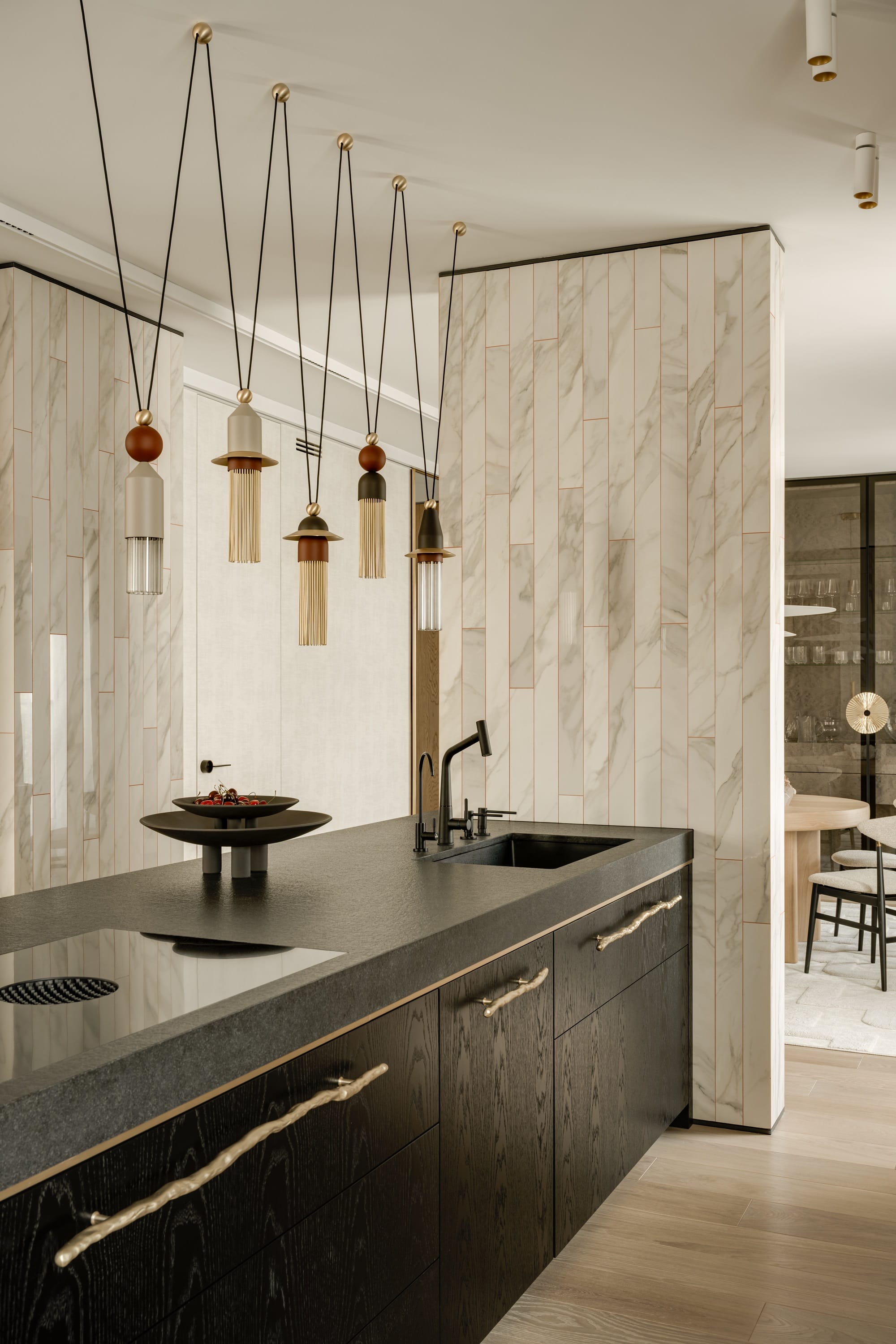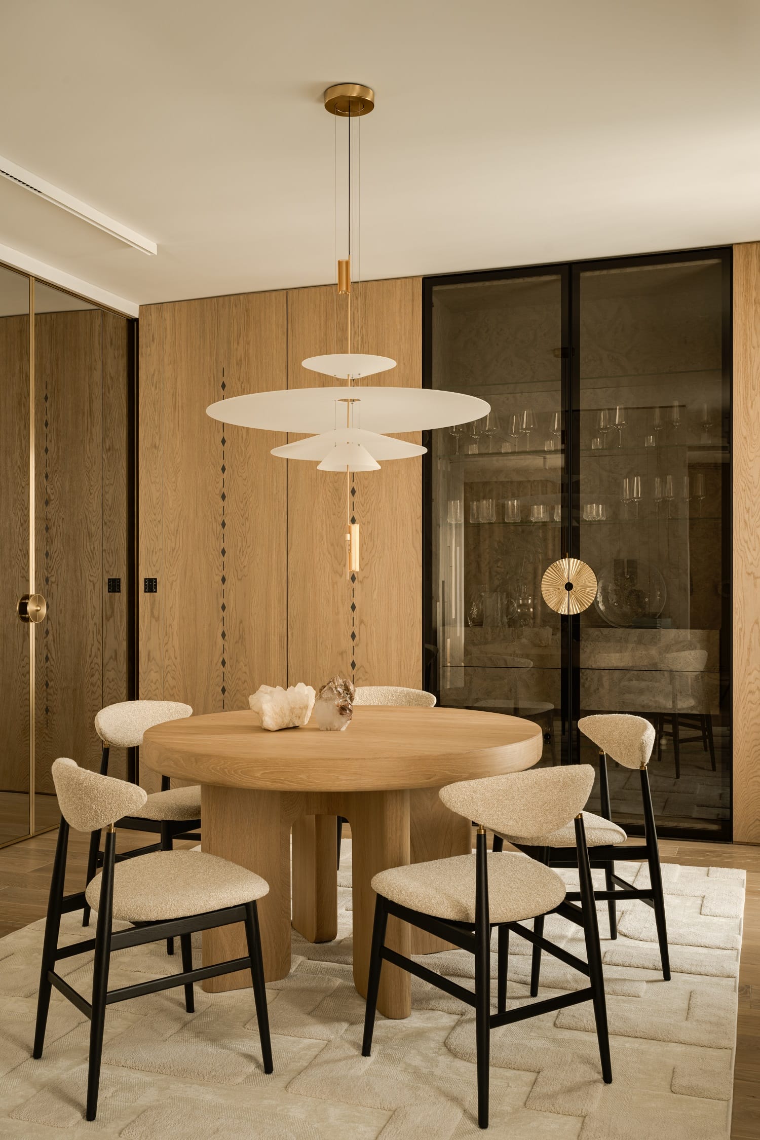 Drewniane obłogi, szary czeczot, mosiężne uchwyty i tapety zyskują pełnię wyrazu w zestawieniu ze światłem, które za dnia wydobywa faktury i niuanse, a wieczorem buduje bardziej intymną, niemal teatralną scenografię. Stonowaną paletę beży, chłodnych bieli i naturalnego drewna przełamują akcenty fioletu, różu i żółci, a także limonki i błękitu.