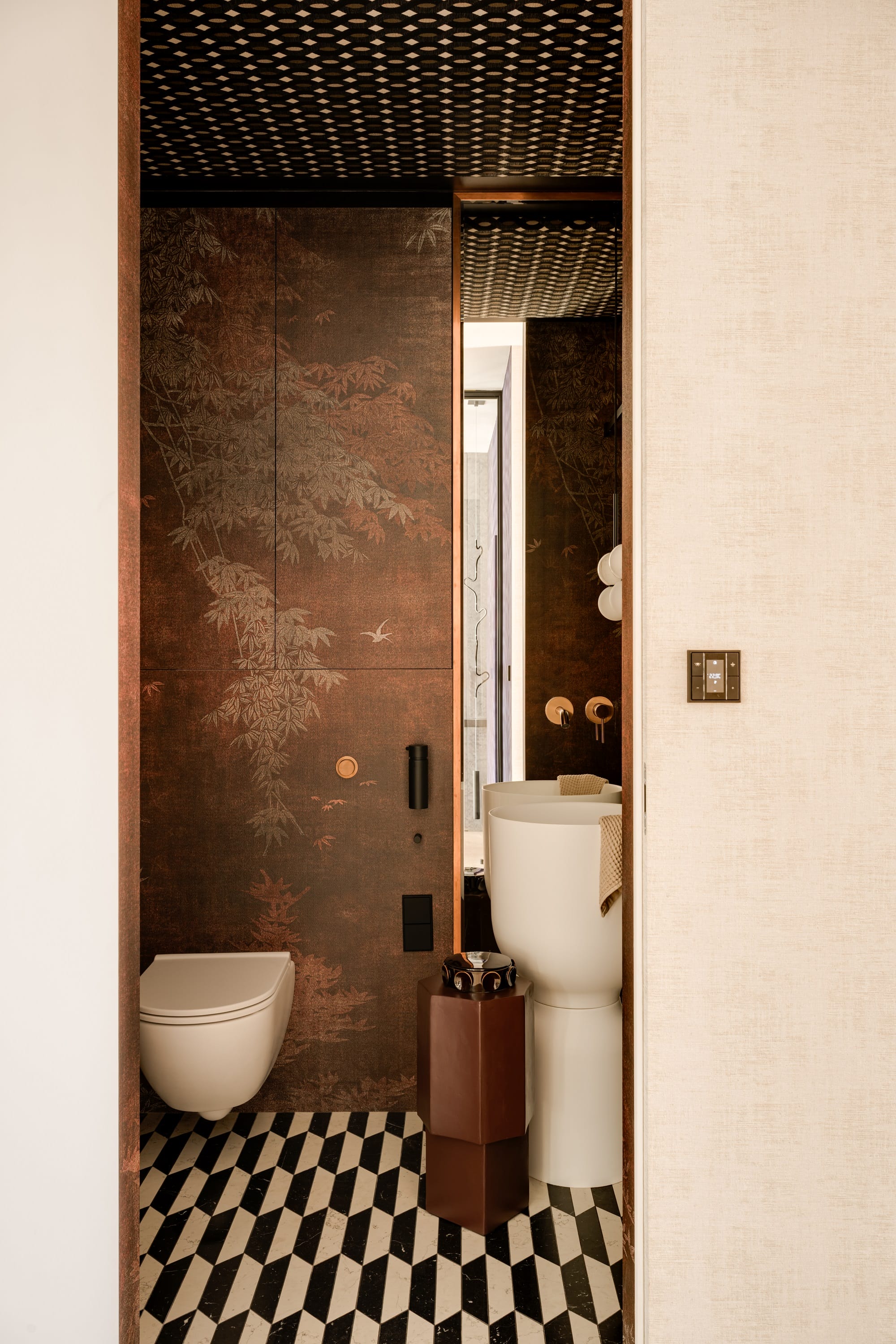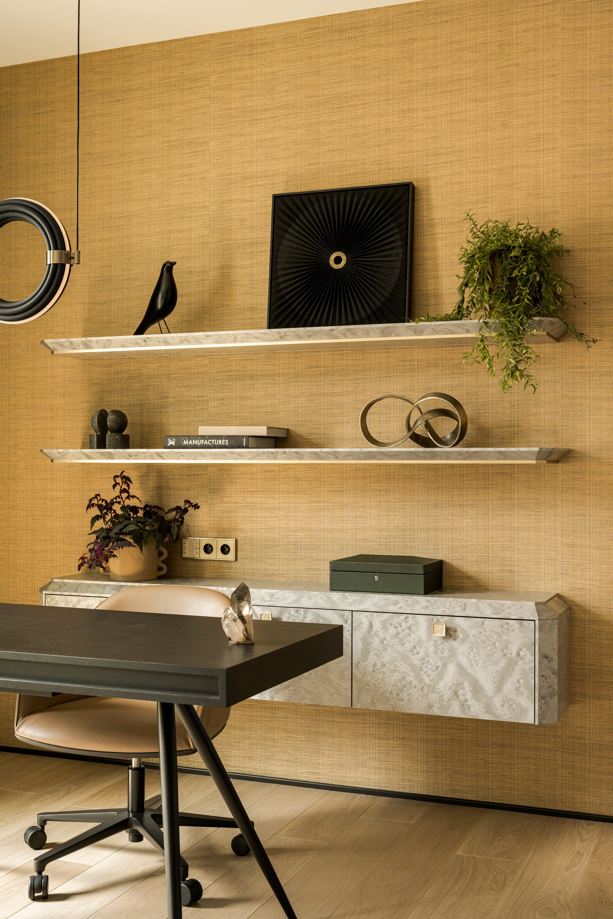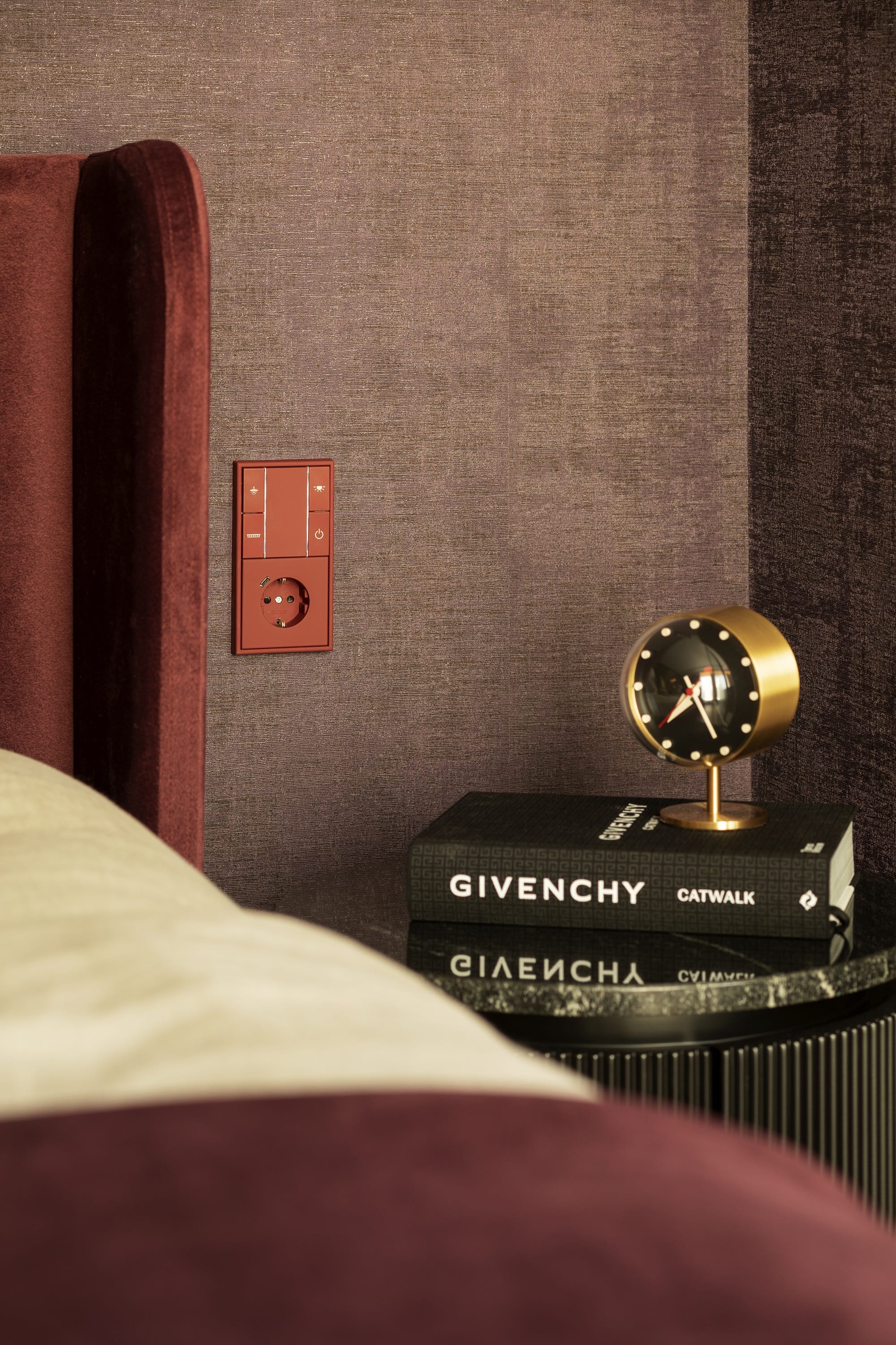 W łazienkach i gabinecie pojawiły się przełączniki LS 990 w klasycznym mosiądzu, natomiast w sypialni – w kolorze burgundu, korespondującym z fioletowymi akcentami wnętrza. Pokój gościnny dopełnia wariant w subtelnym odcieniu beżu, wpisujący się w atmosferę spokojnego odpoczynku. Całość uzupełniają gniazda z USB typu C oraz spersonalizowane przyciski paneli sterowania.