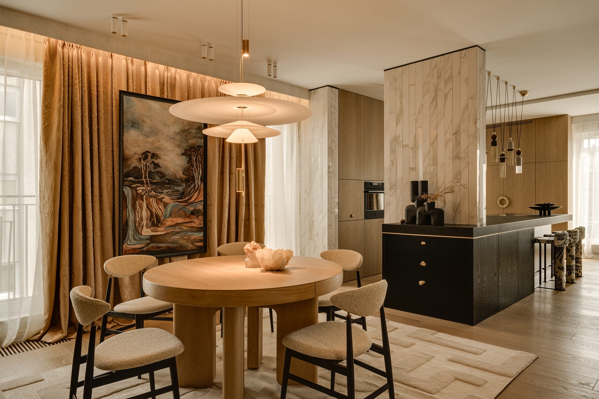 Umeblowanie to efekt starannej selekcji. Wyspie kuchennej towarzyszą hokery ukraińskiej marki WOO Furniture. Sercem części jadalnianej jest okrągły, rozkładany stół Katto od naszego rodzimego Miloni. W biurze o komfort pracy dba skórzany fotel Vitra, natomiast w salonie do wypoczynku zaprasza miękki fotel Gubi w asyście gablotki HKliving.